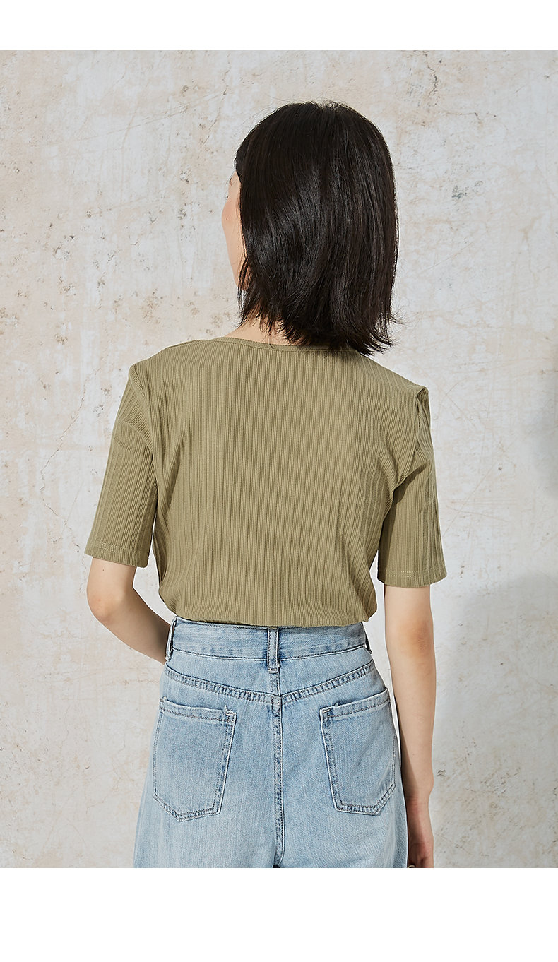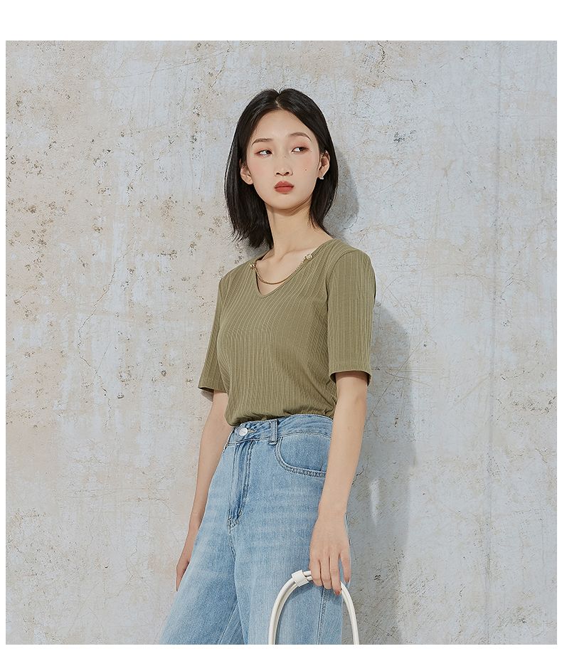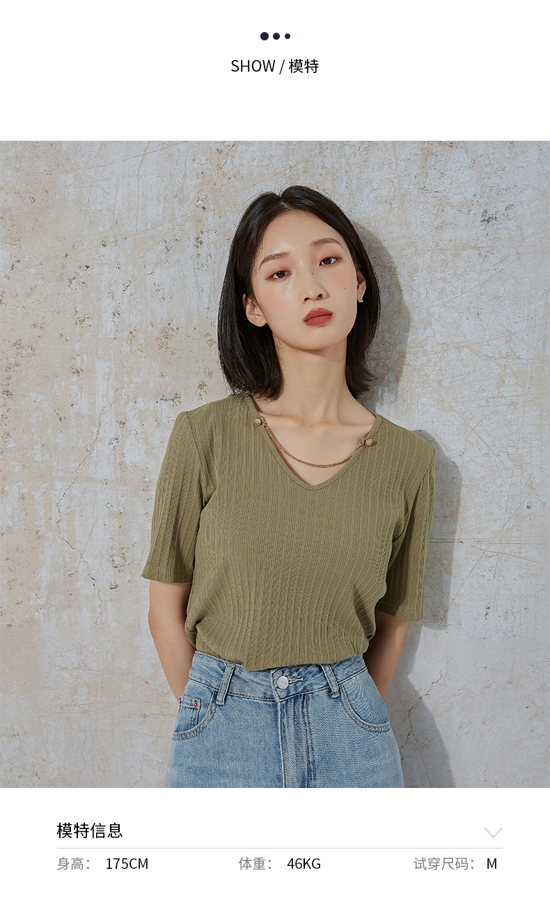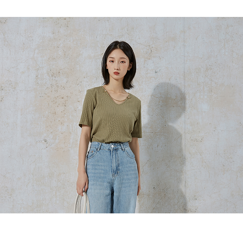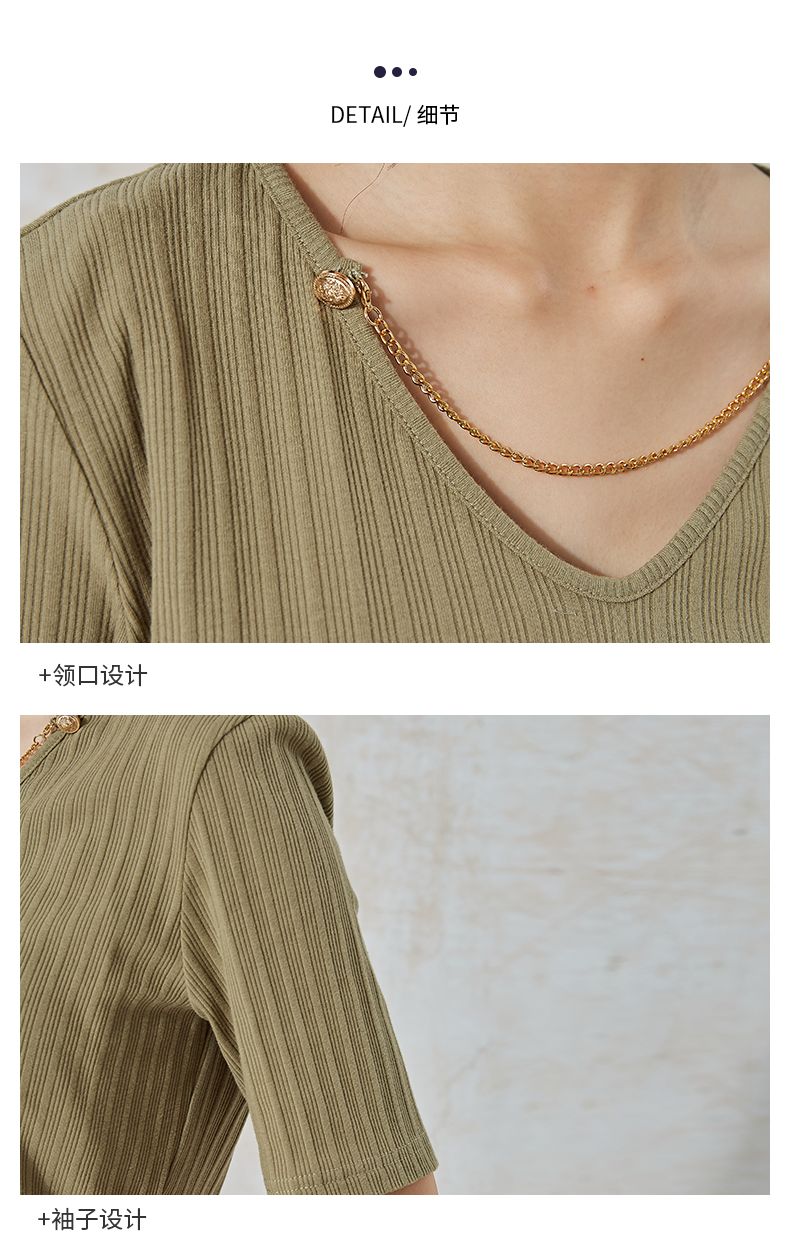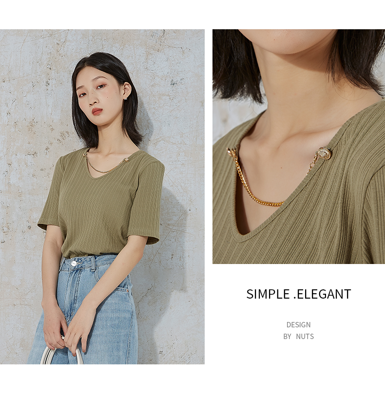 NUTS商场同款V领夏款纯色时尚气质百搭中袖T恤女231022076B