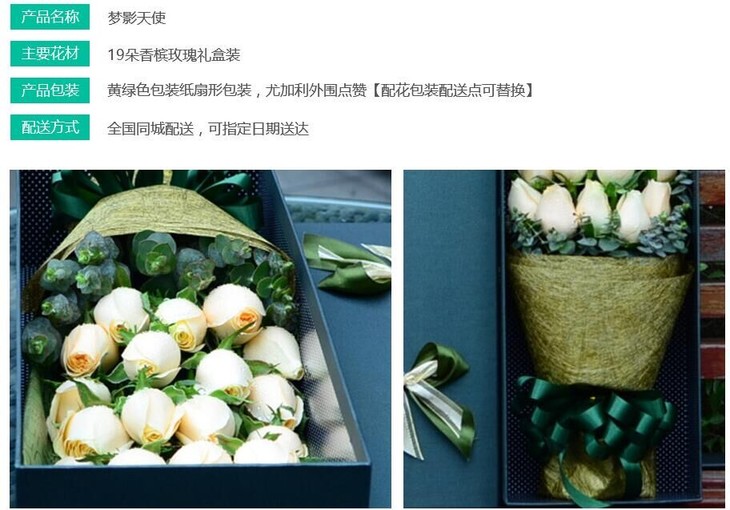 花材:19枝香槟玫瑰,礼盒包装