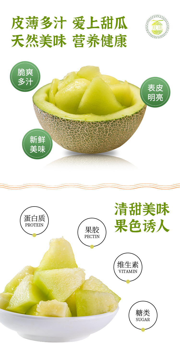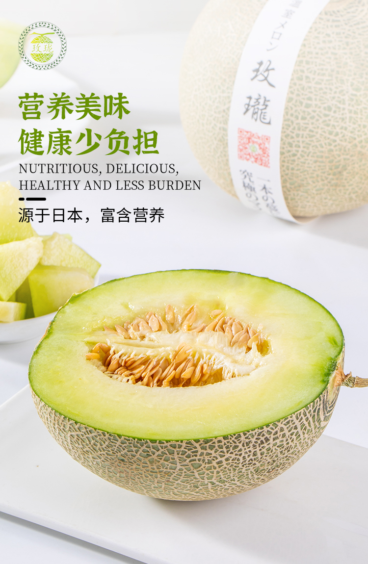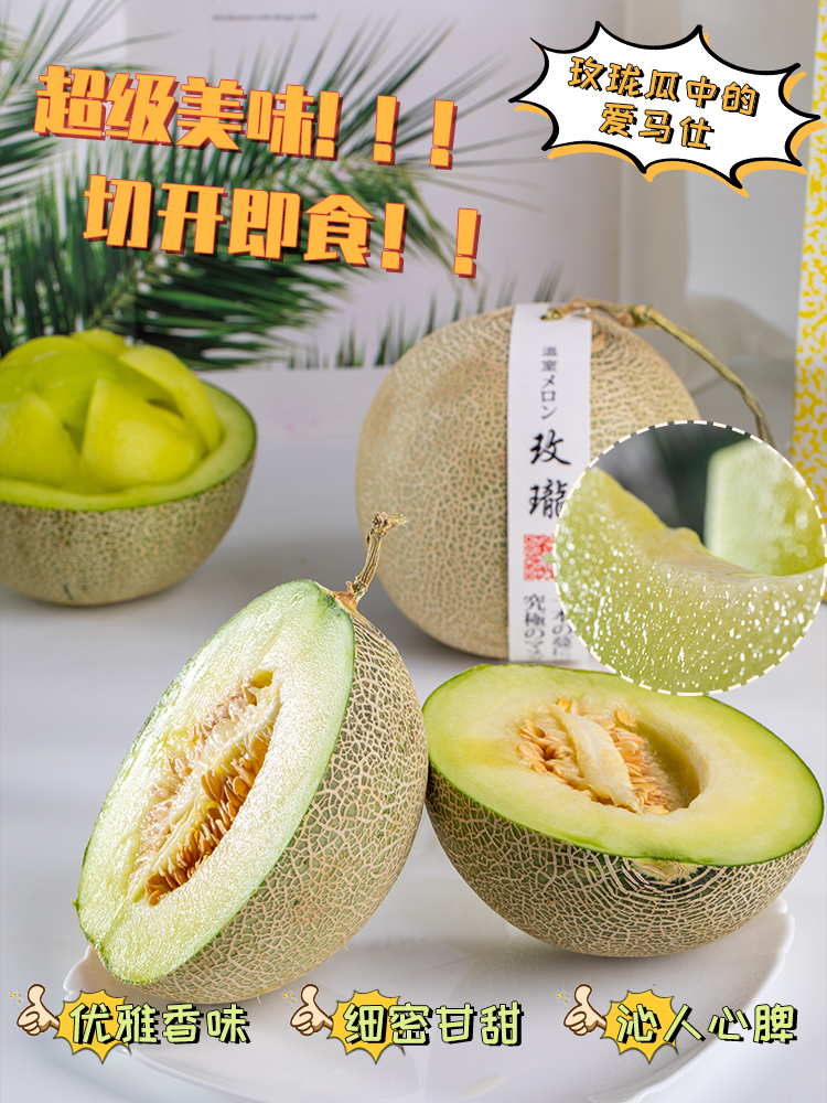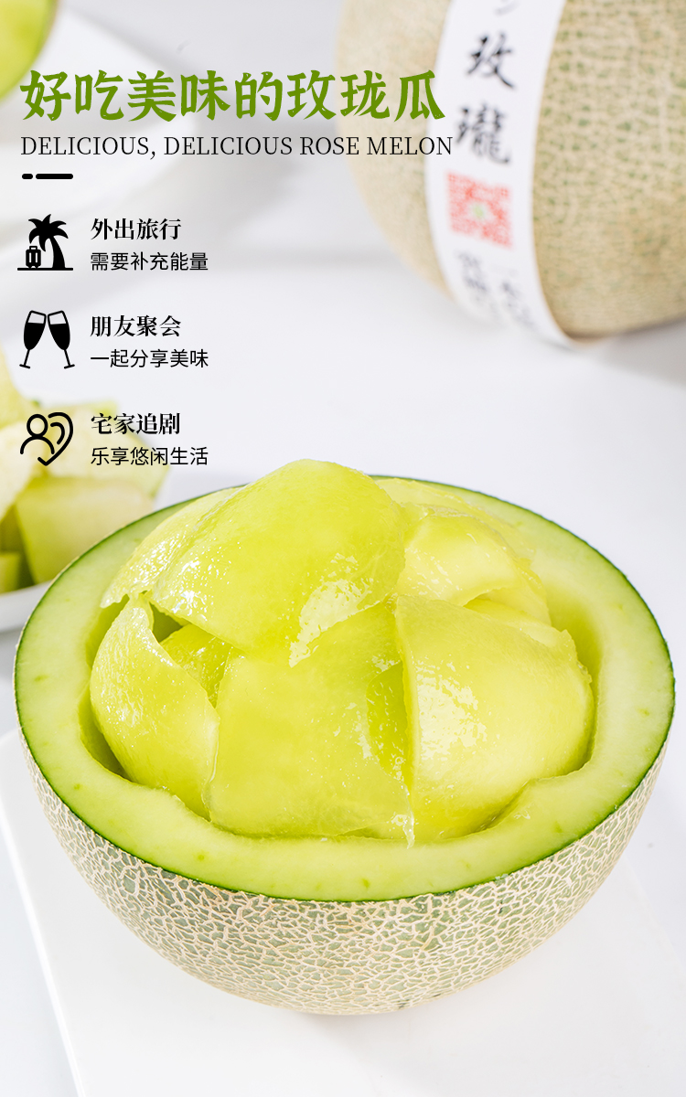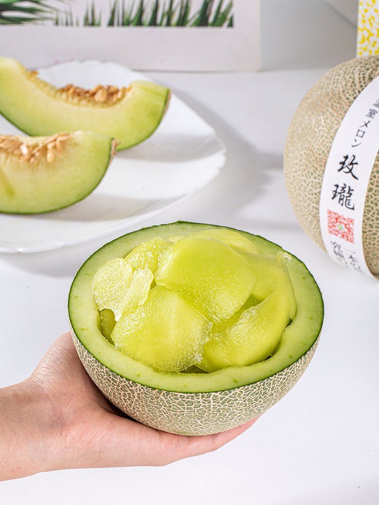 口感正宗:高水分使得果肉更佳晶莹剔透,皮薄肉厚,让您食用之前有更好的视觉体验。 玫珑瓜的果肉呈翡翠色,晶莹剔透,咬一口,满口都是紧实饱满的甜蜜果肉, 让人享受其中,大大的满足感包围着口腔。