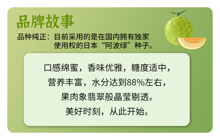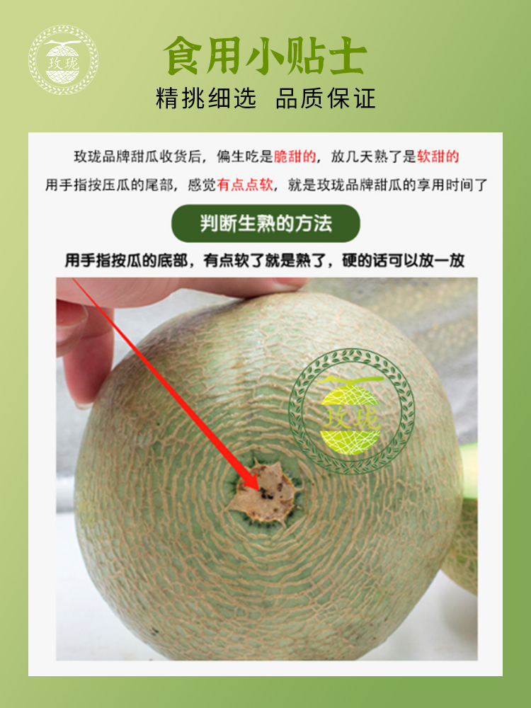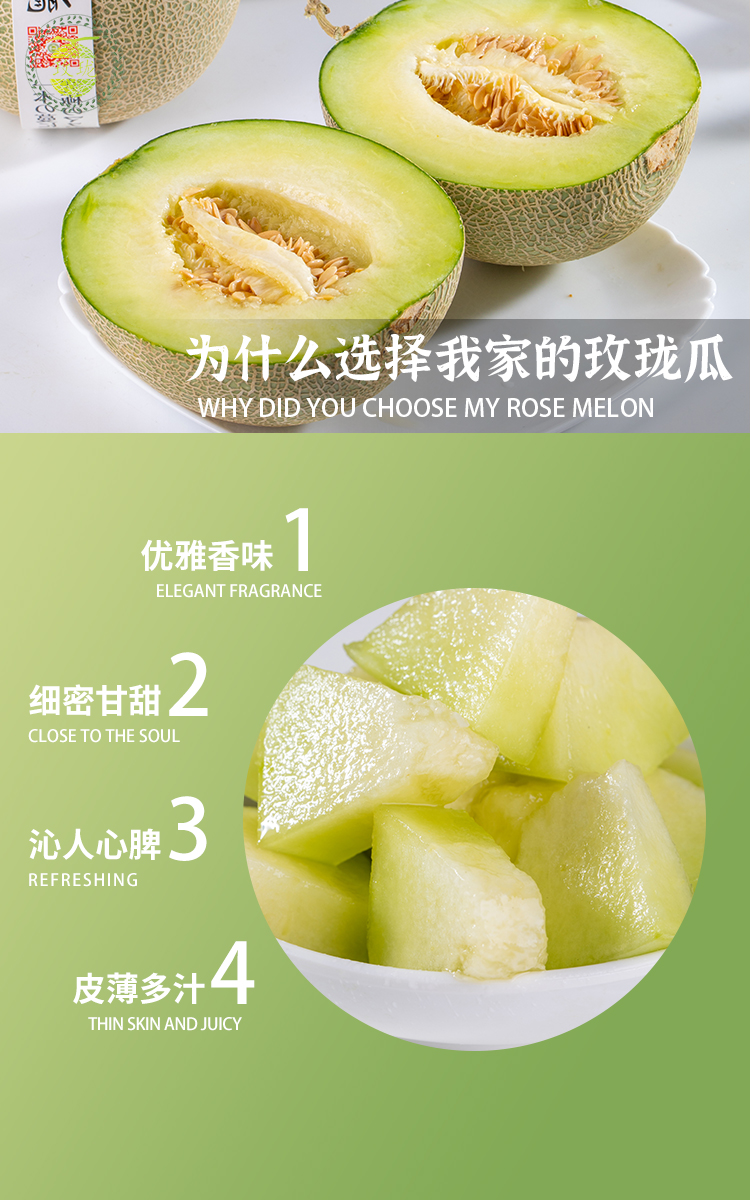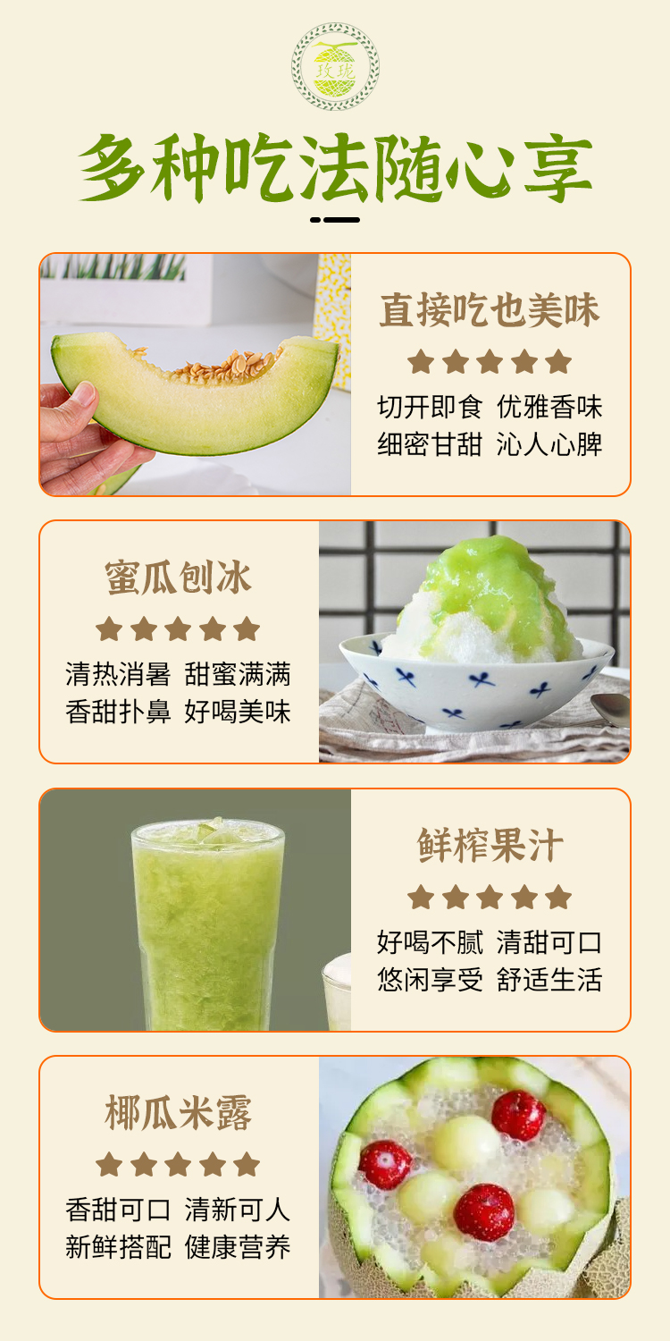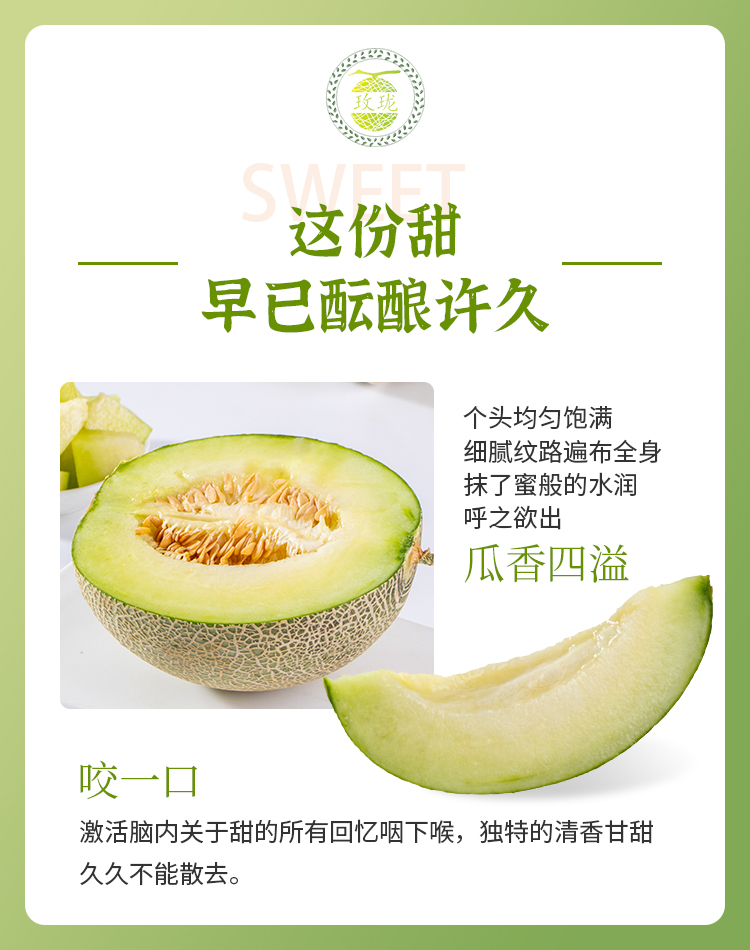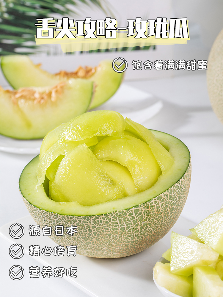 口感正宗:高水分使得果肉更佳晶莹剔透,皮薄肉厚,让您食用之前有更好的视觉体验。 玫珑瓜的果肉呈翡翠色,晶莹剔透,咬一口,满口都是紧实饱满的甜蜜果肉, 让人享受其中,大大的满足感包围着口腔。