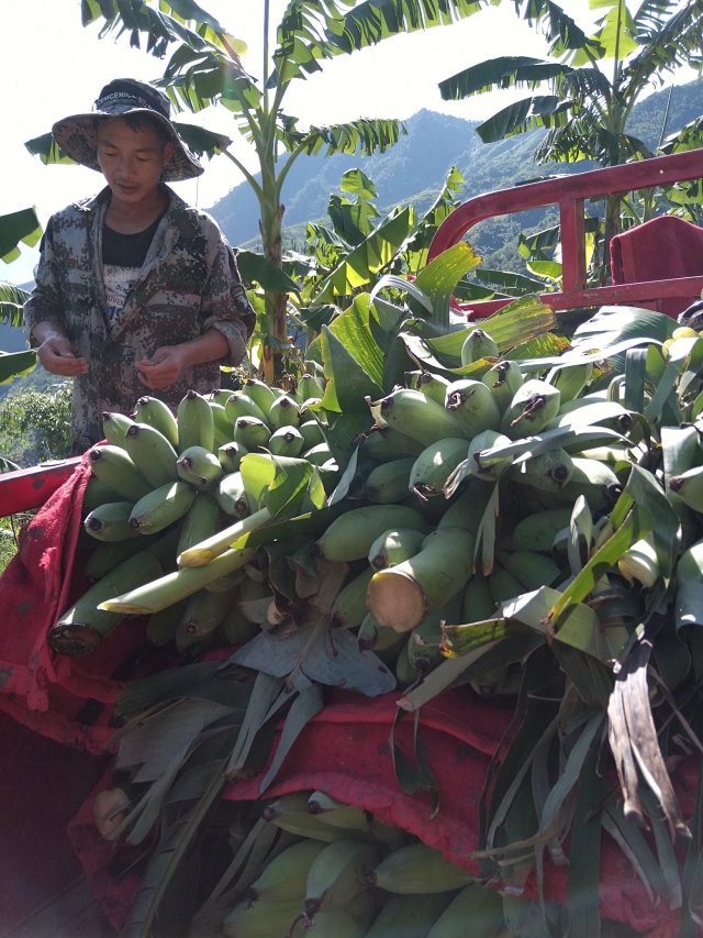 芭蕉树种在山顶,从山脚到山顶需要走路一个小时左右,山路难走,车不能进,芭蕉只能人力背或者挑下山。太过陡峭,连走路都是需要注意脚下的,一步不小心,就到山谷里了,何况还抱那么大串的芭蕉呢?拼的就是实力