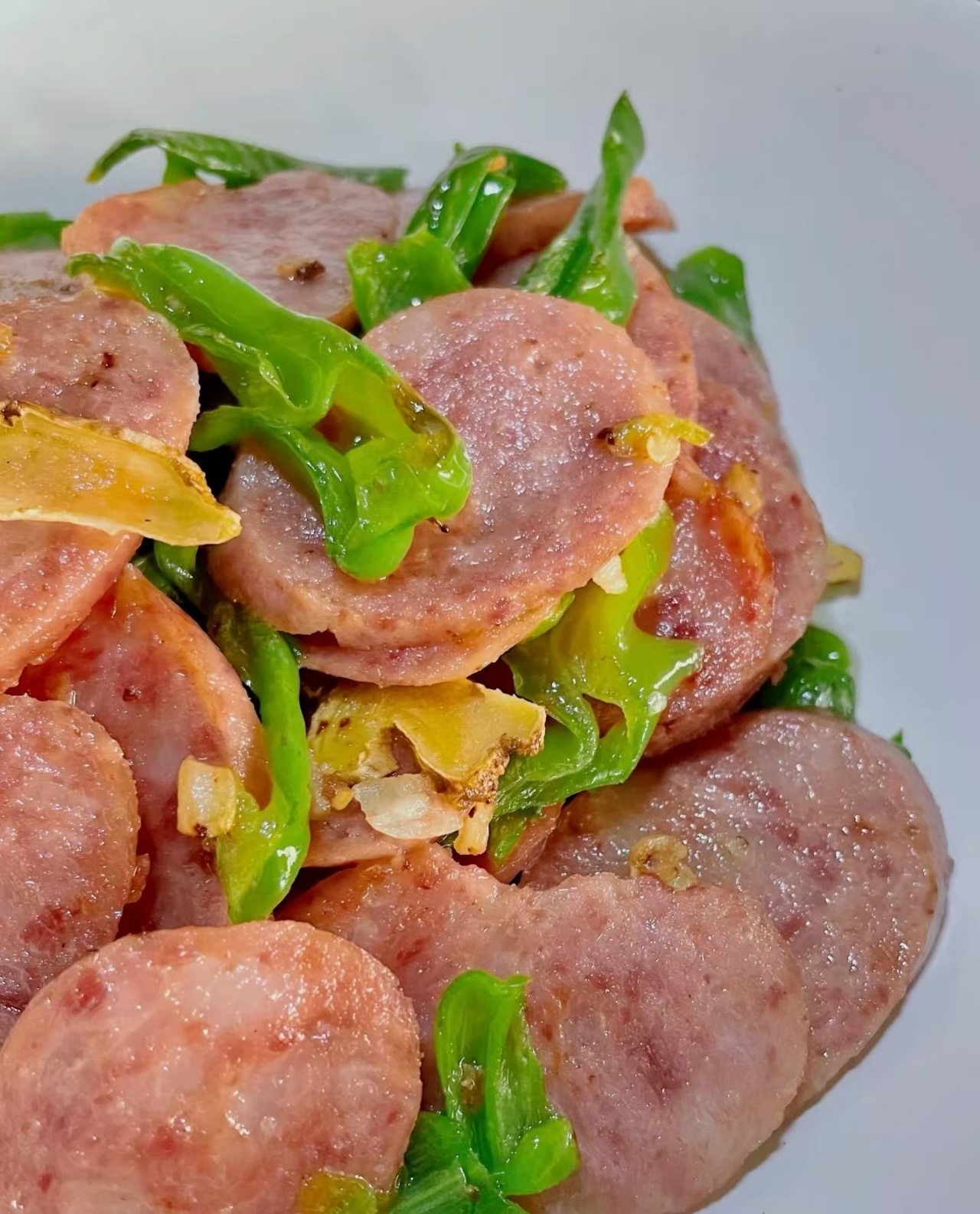 做法:火腿肠切片,放到空气炸锅里,刷一层油,空气炸锅10-15分钟,中间翻面,到时间后捞出配上干辣椒面,太好吃啦,做汉堡🍔吃美味极了!