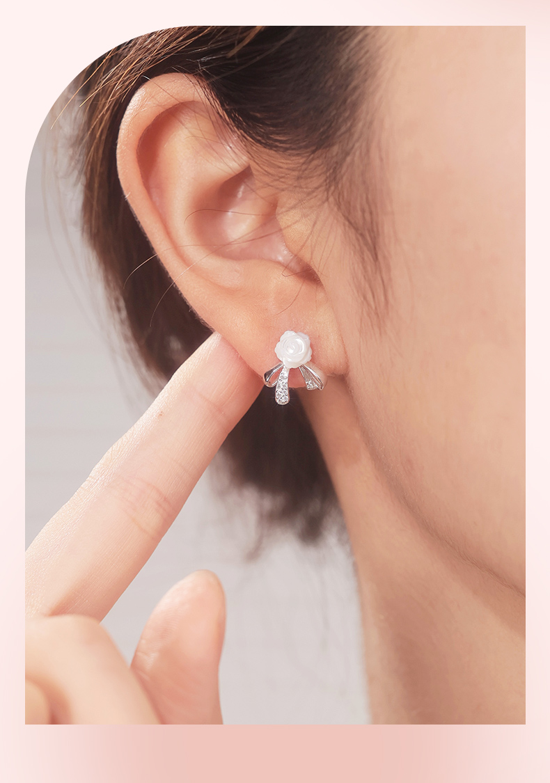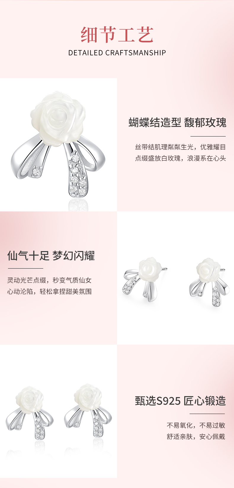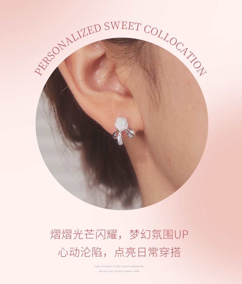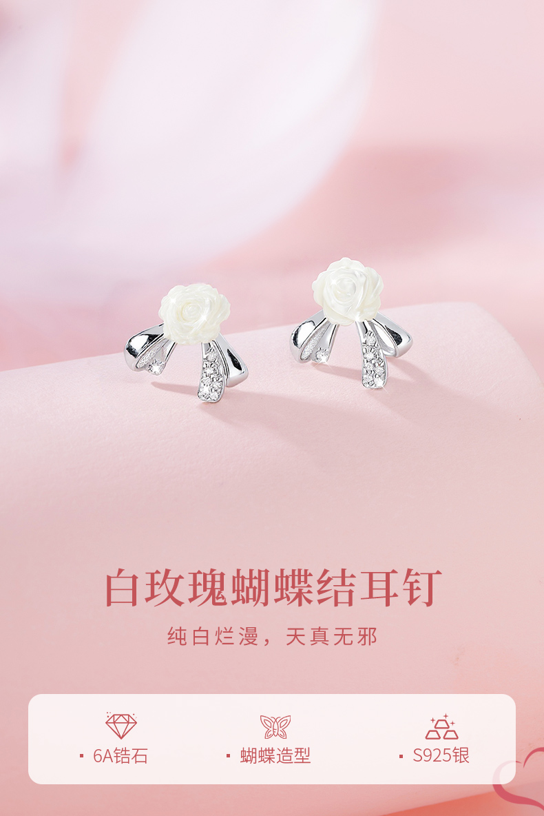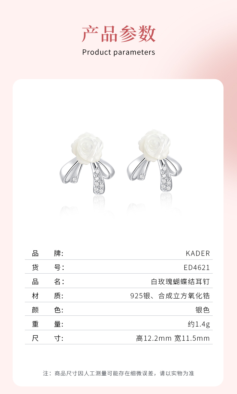 卡蒂罗KADER 白玫瑰蝴蝶结耳钉 925银清新灵动玫瑰造型气质甜美小众典雅设计感养耳洞 简约百搭优雅大气