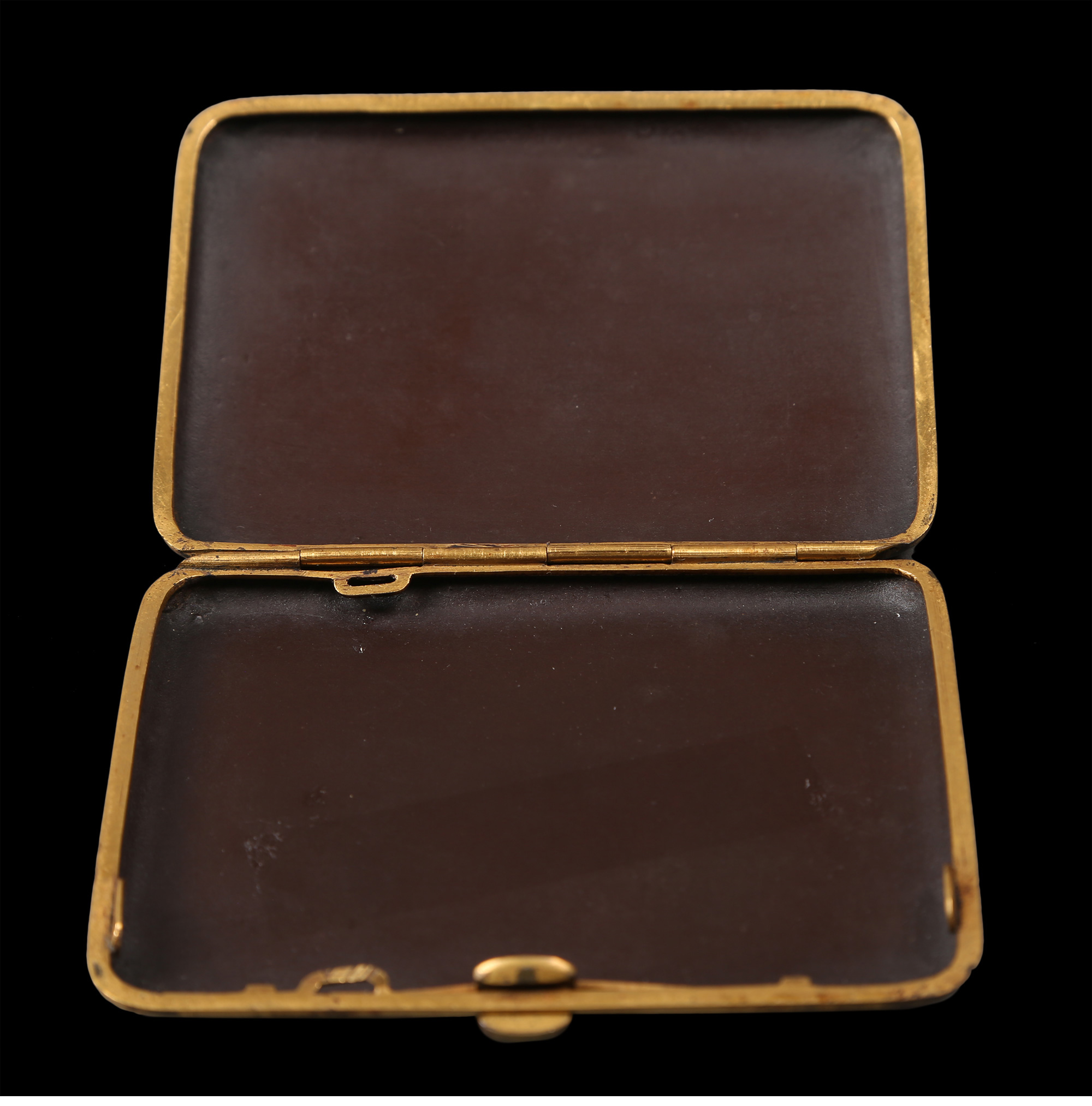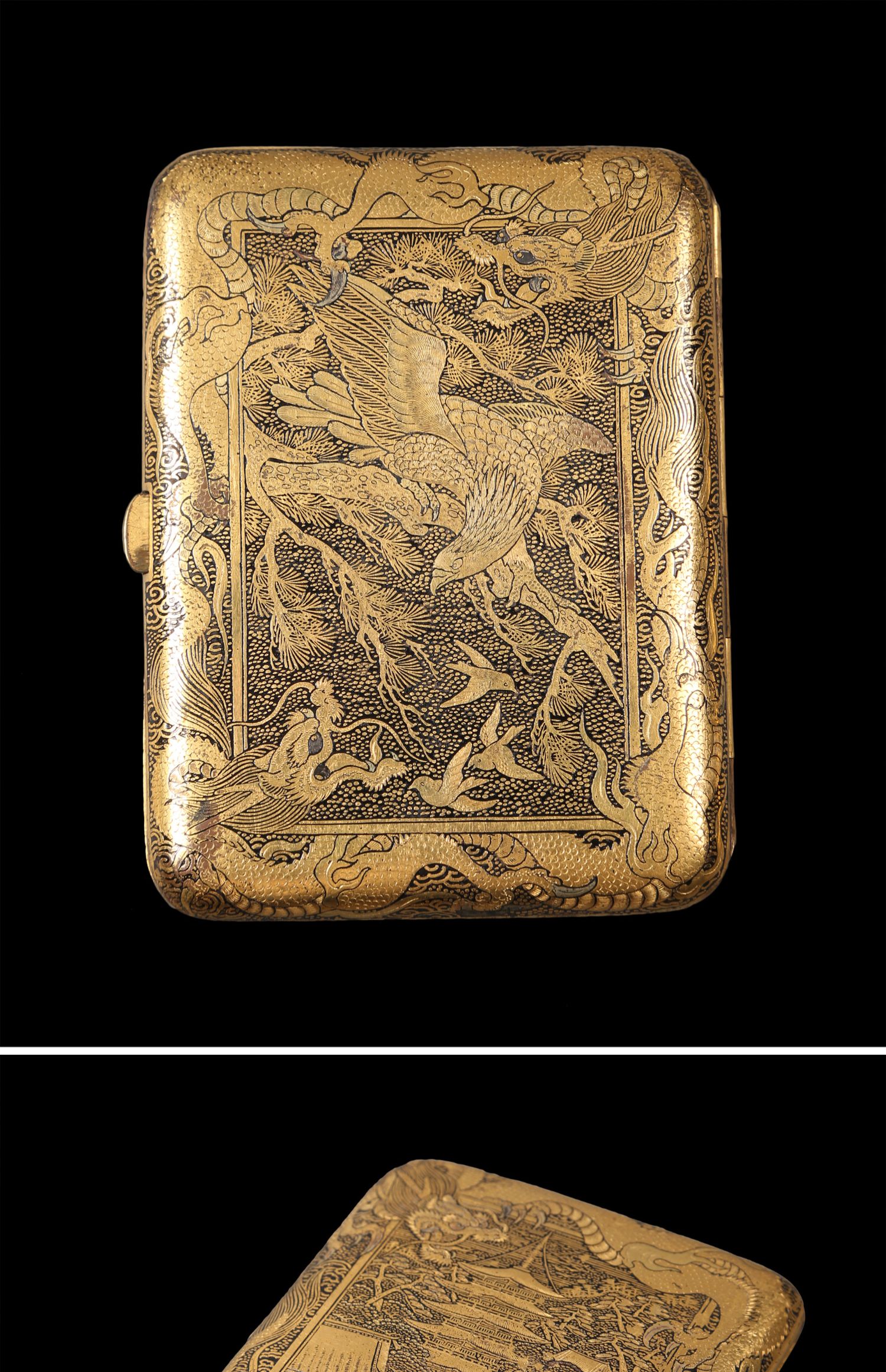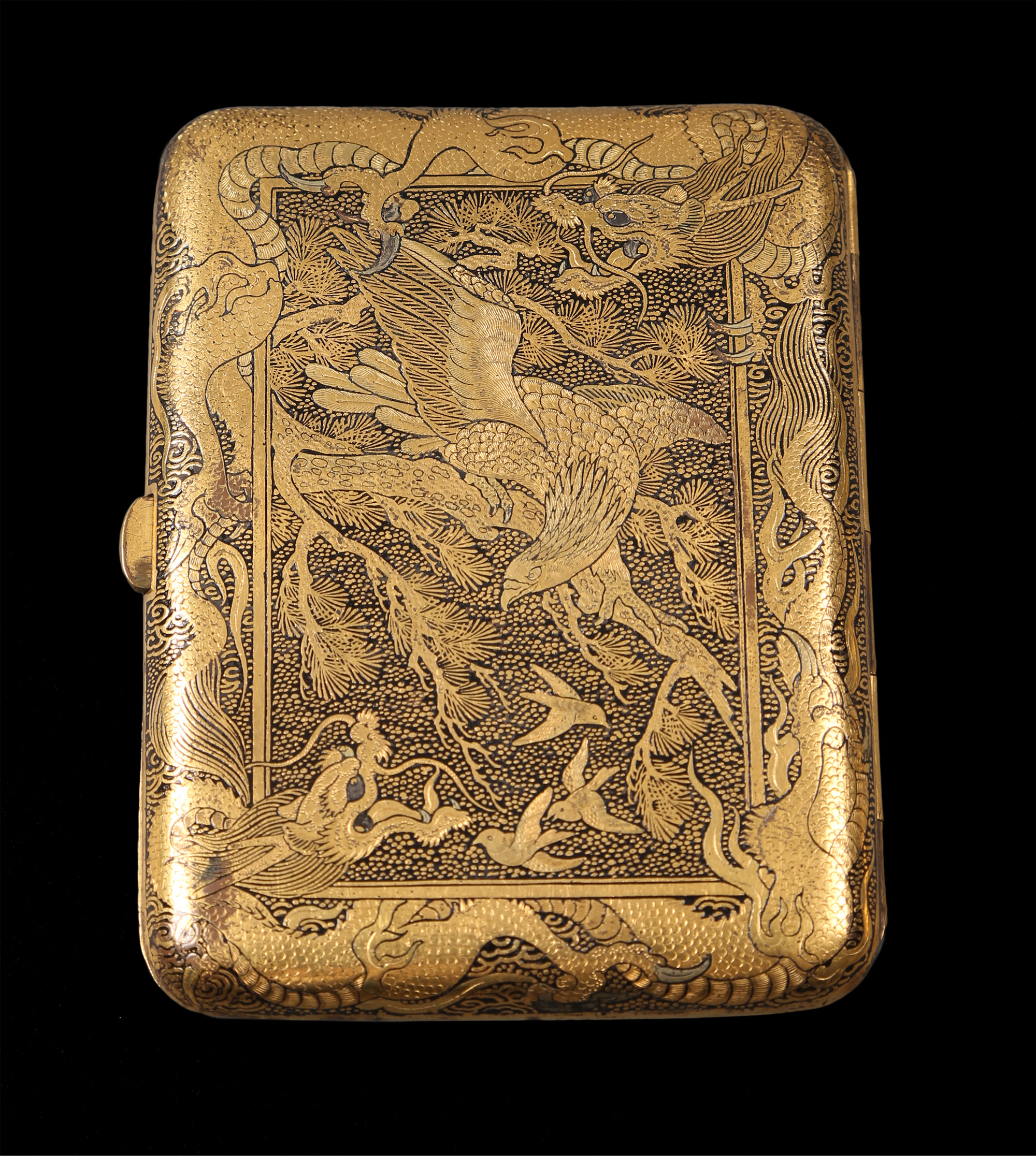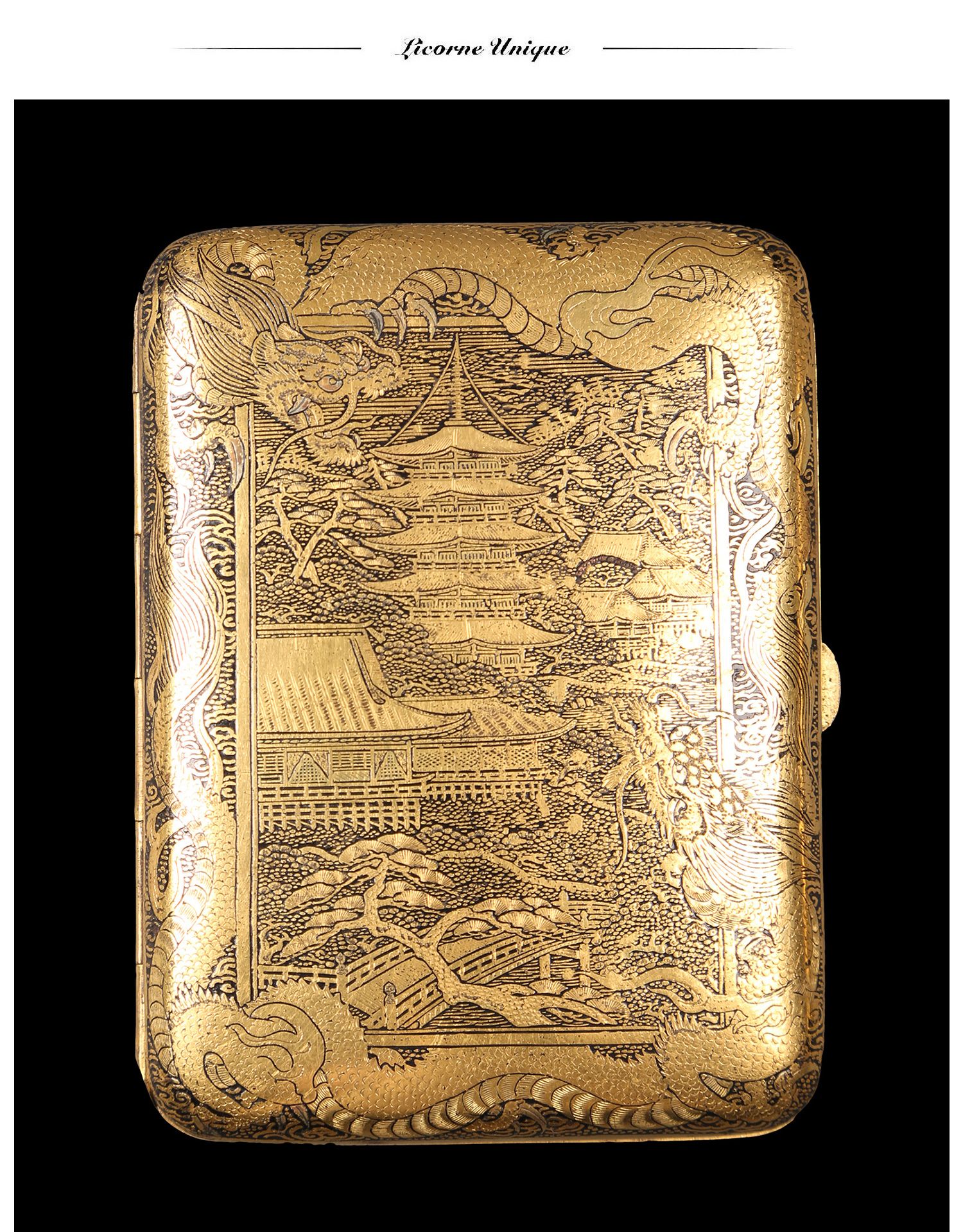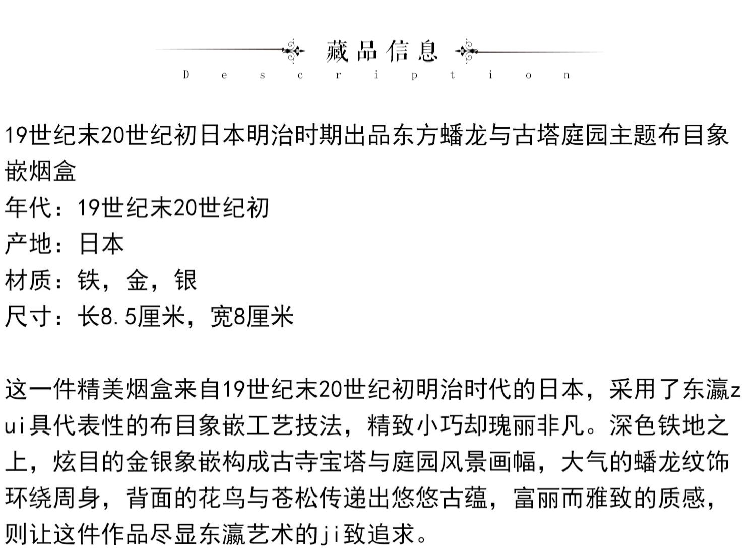 独角鹿西洋古董日本明治时期东方蟠龙与古塔庭园主题布目象嵌烟盒