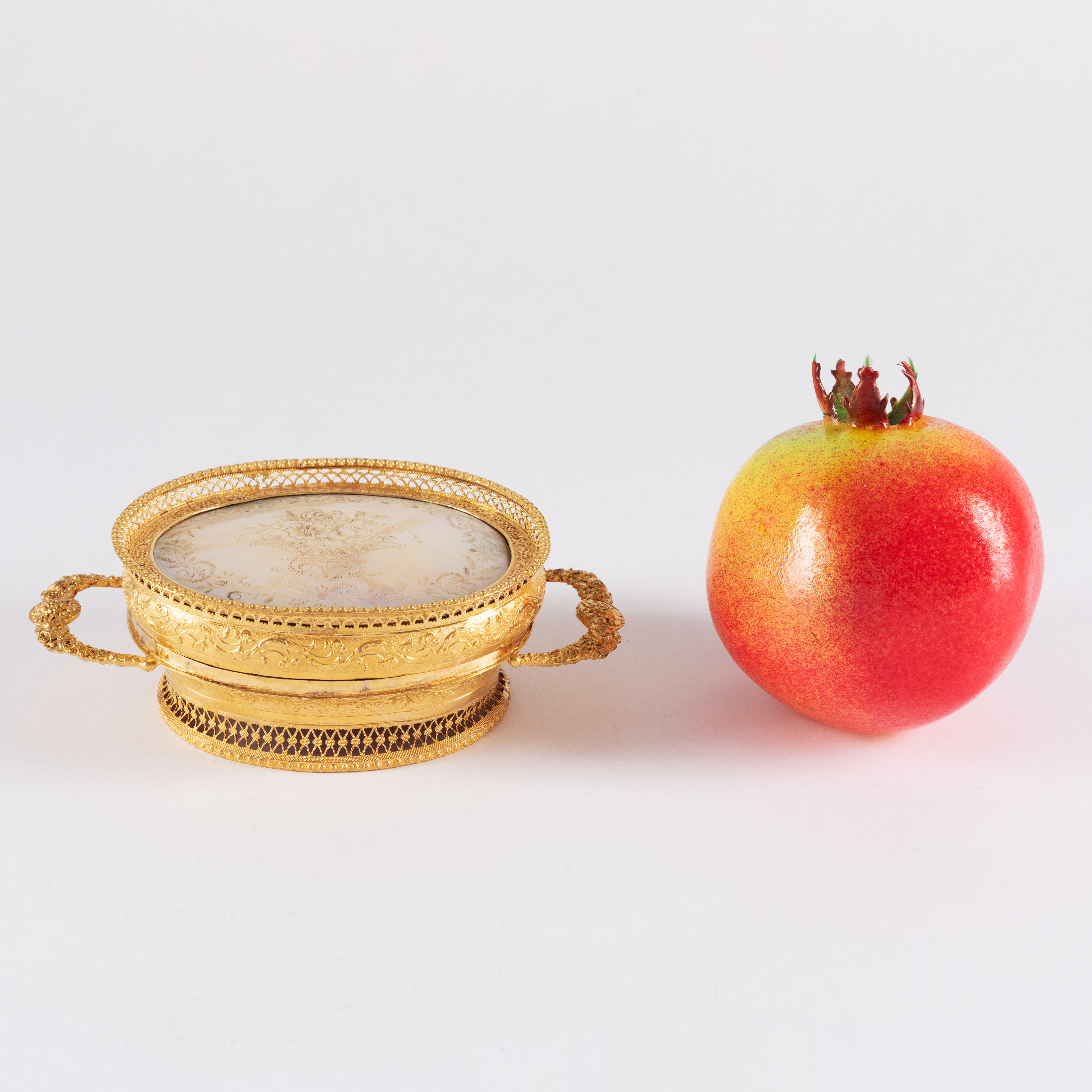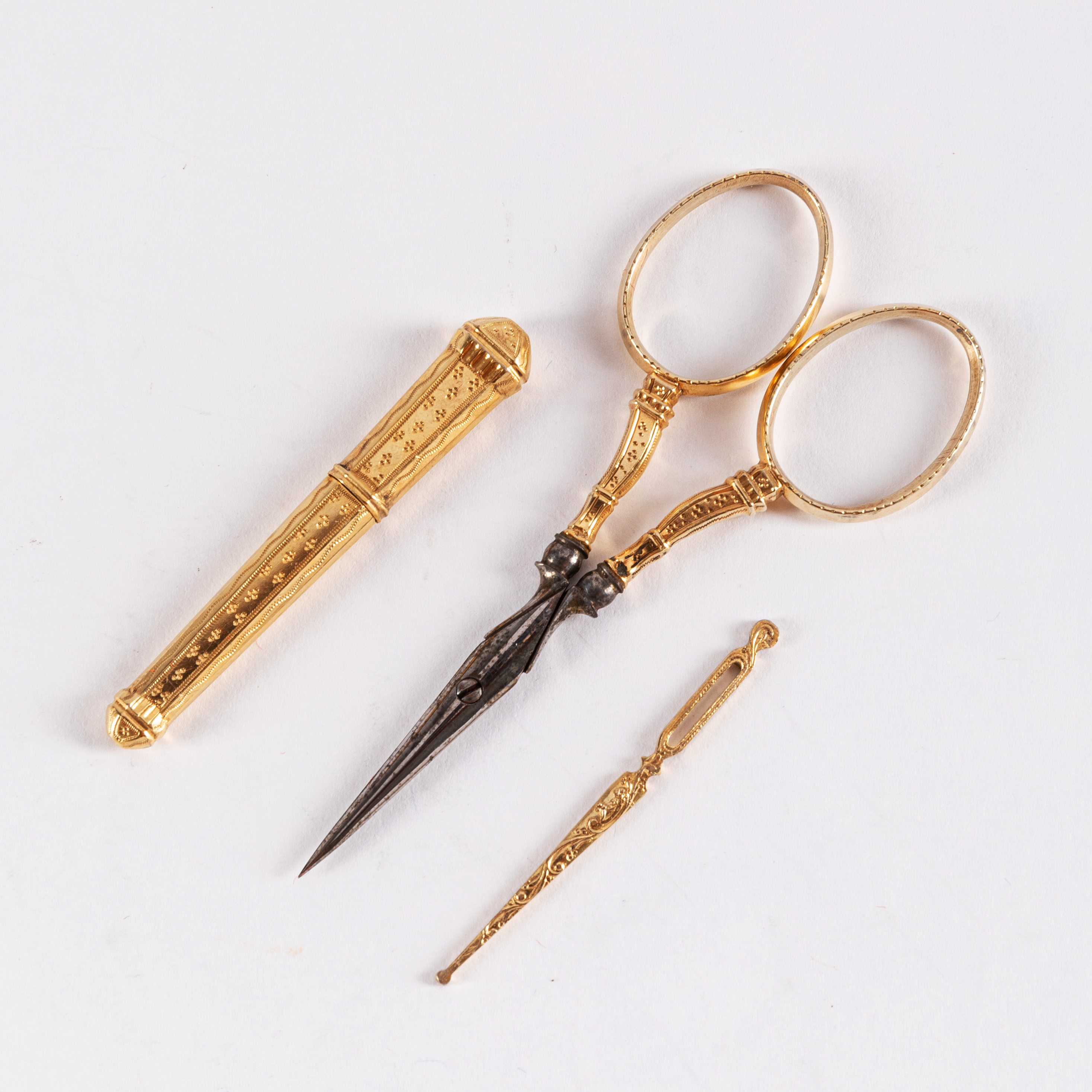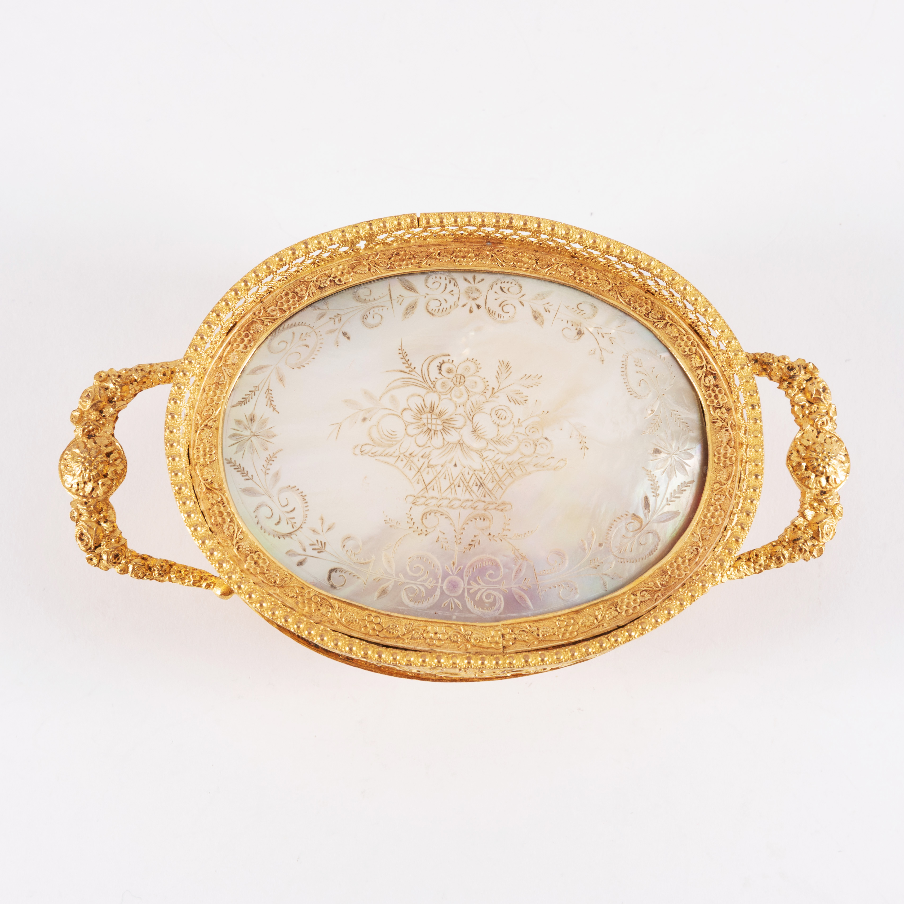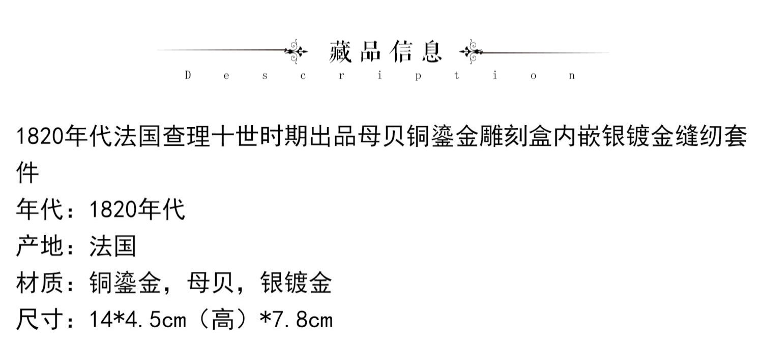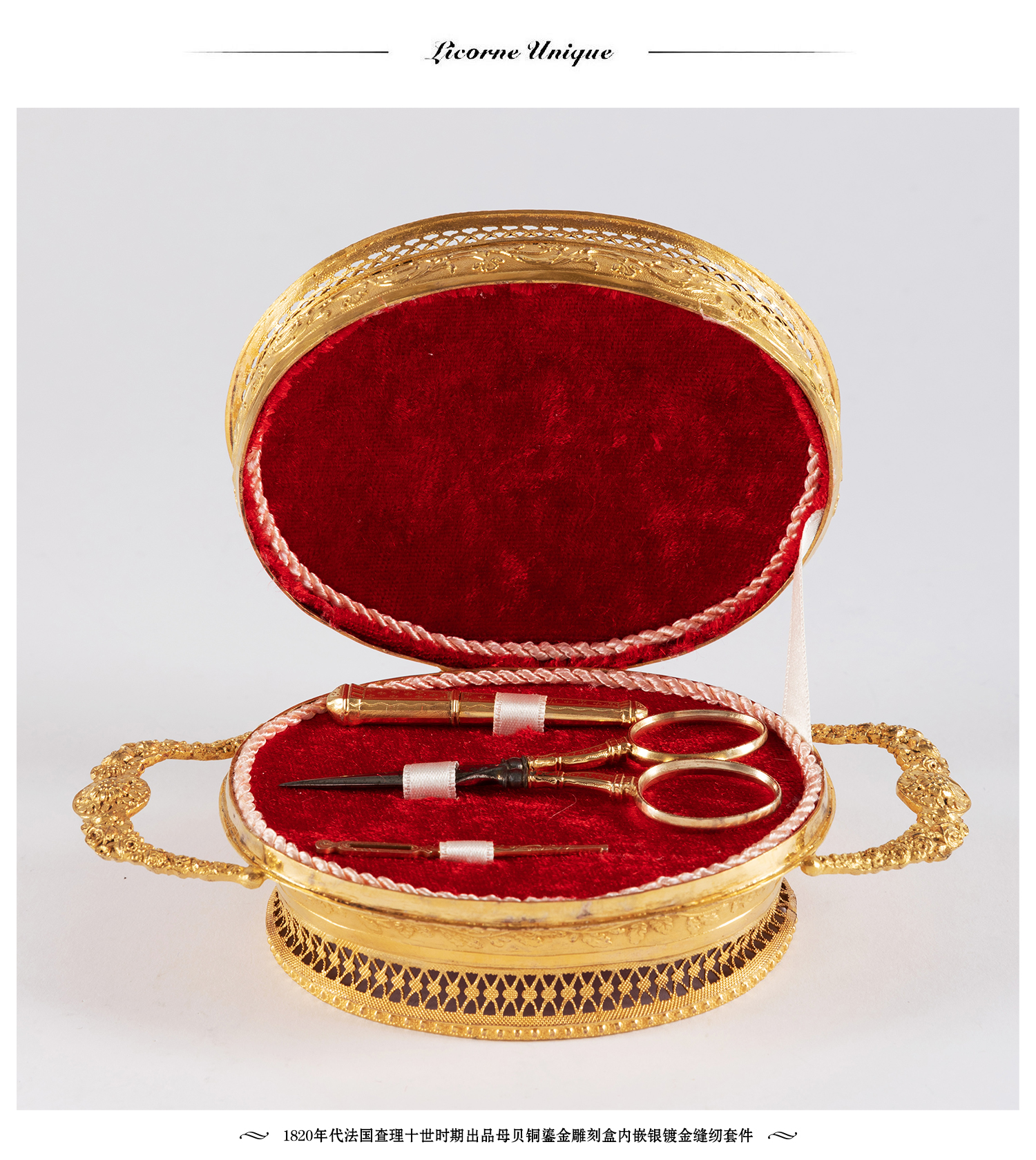 独角鹿西洋古董查理十世时期母贝铜鎏金雕刻盒内嵌银镀金缝纫套件