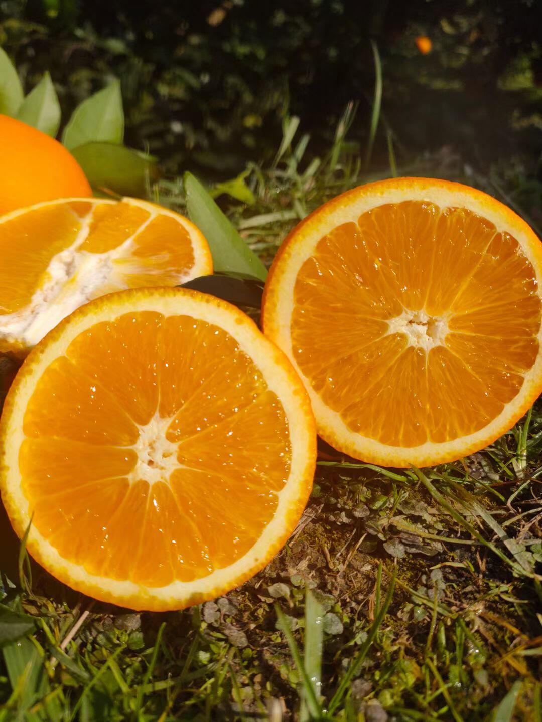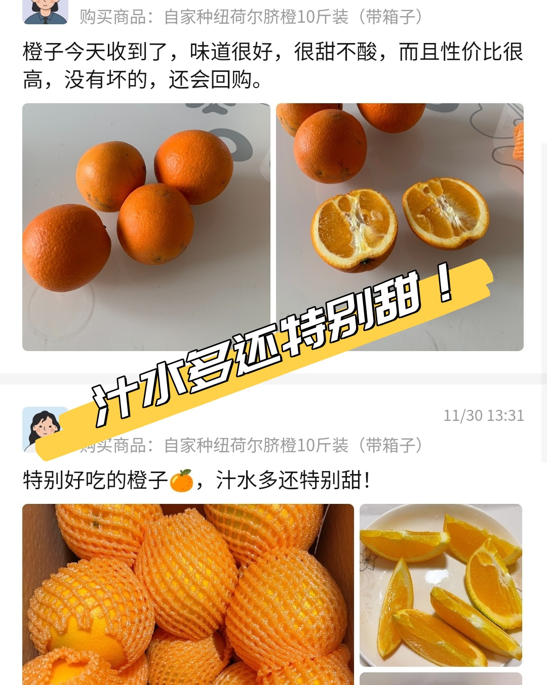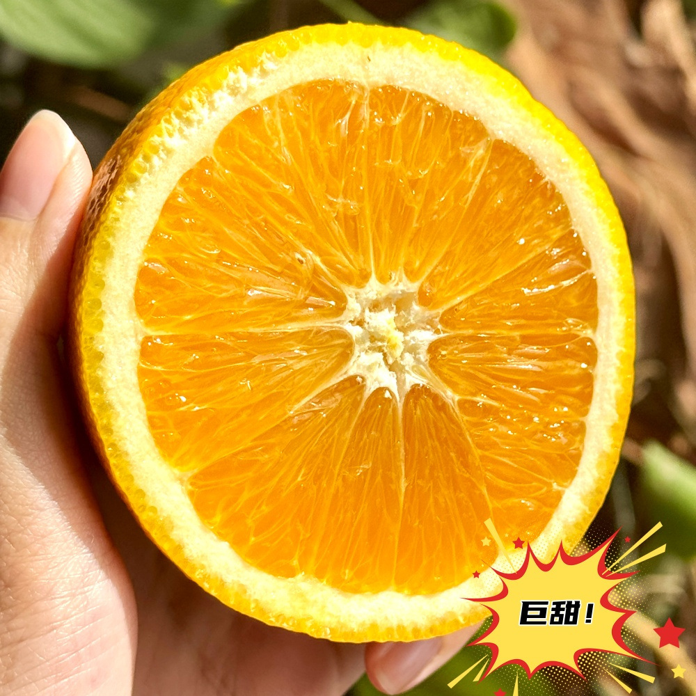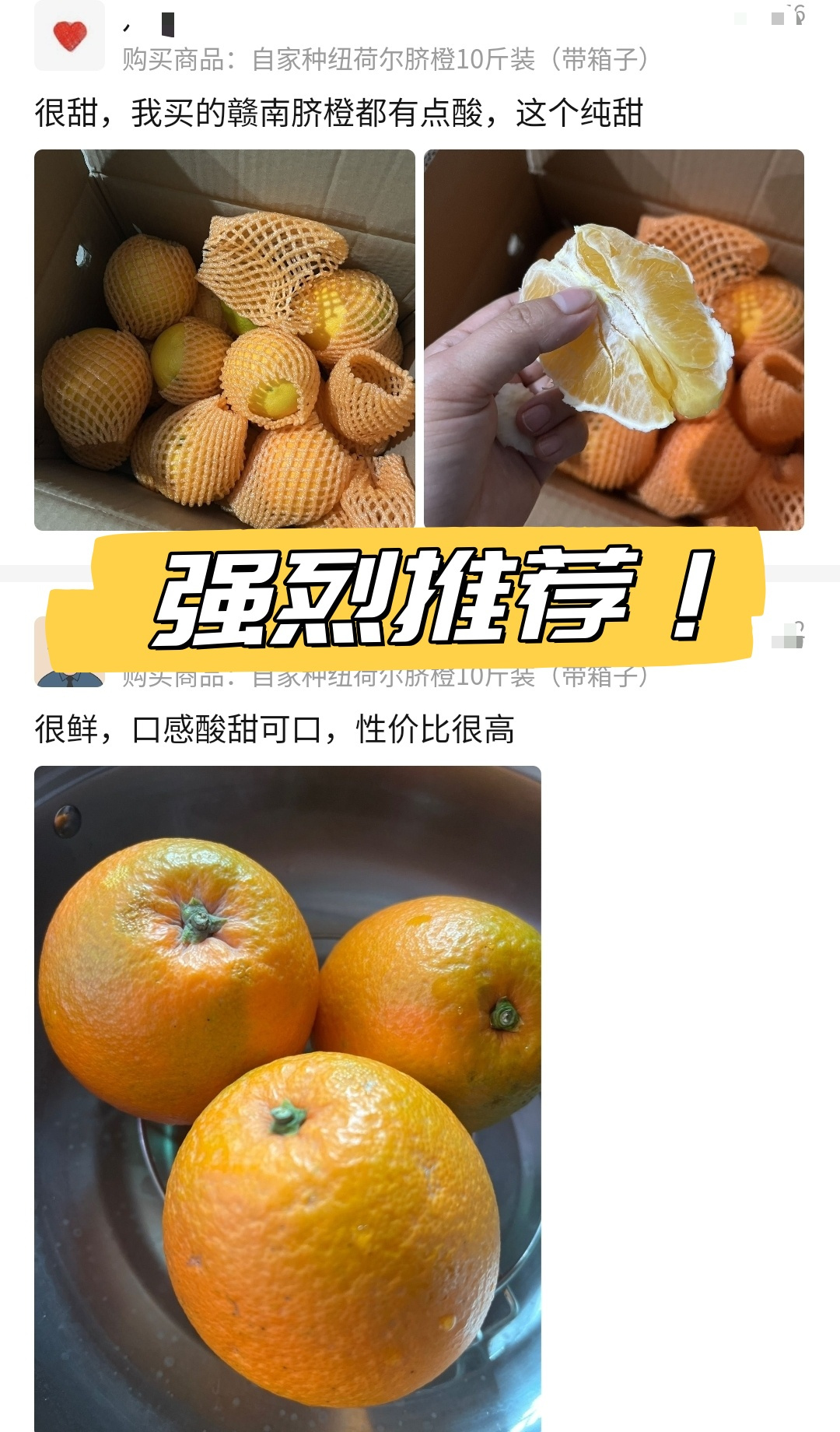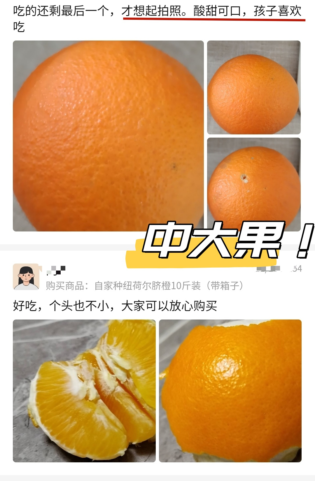 脐橙品质,总结几句: 1▶︎汁水爆多,直接压制喝鲜橙汁完全没问题。 2▶︎ 味道很甜,现在才开卖就是等糖化更高,约14%的甜度超过了其他品种的脐橙,9分甜1分酸左右。如果想吃100%甜可以把果子放一段时间自然化糖。 3▶︎ 没有打农药,农村果树下杂草丛生就是天然的有机肥,没有打蜡,💯 保证绝对的天然、安全、健康。 4▶︎ 香味很足,真的是自然成熟的果子的清香味。偶尔会有些麻点、花斑、黑疤,这正是自然生长成熟的体现。 5▶︎ 现摘24小时内现发的,绝对的新鲜! 6▶︎ 个头基本上是很均匀的,可能偶尔会有个头偏小的(相对的大的而言)。 7▶︎ 有几块地一起种的,朝向、水分有所不同,口感可能会有很小的差异。