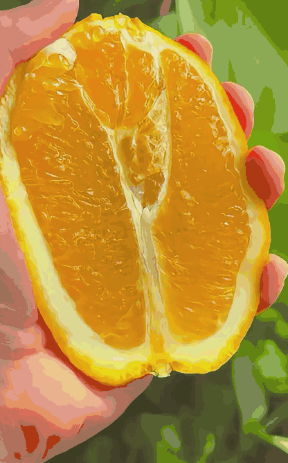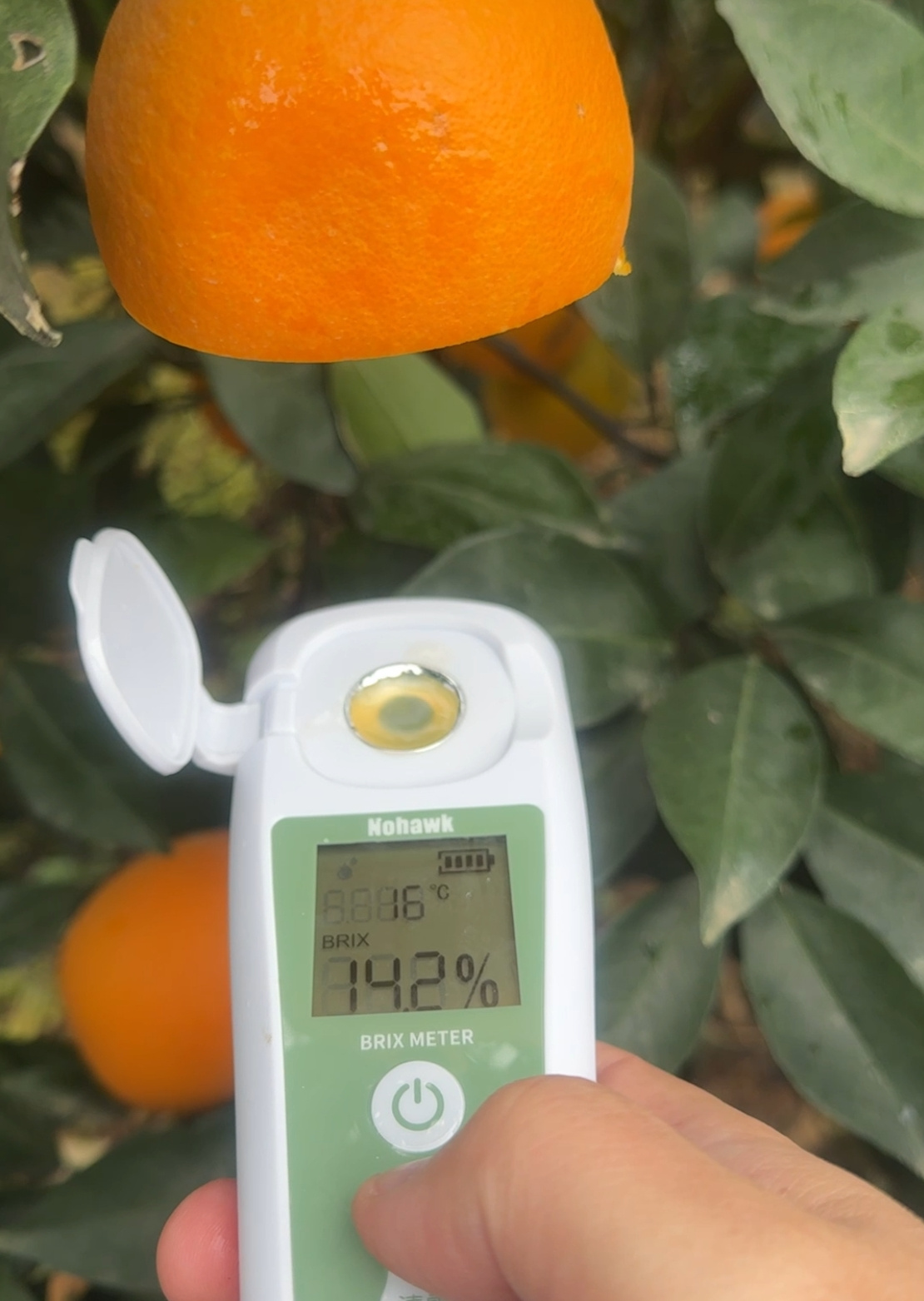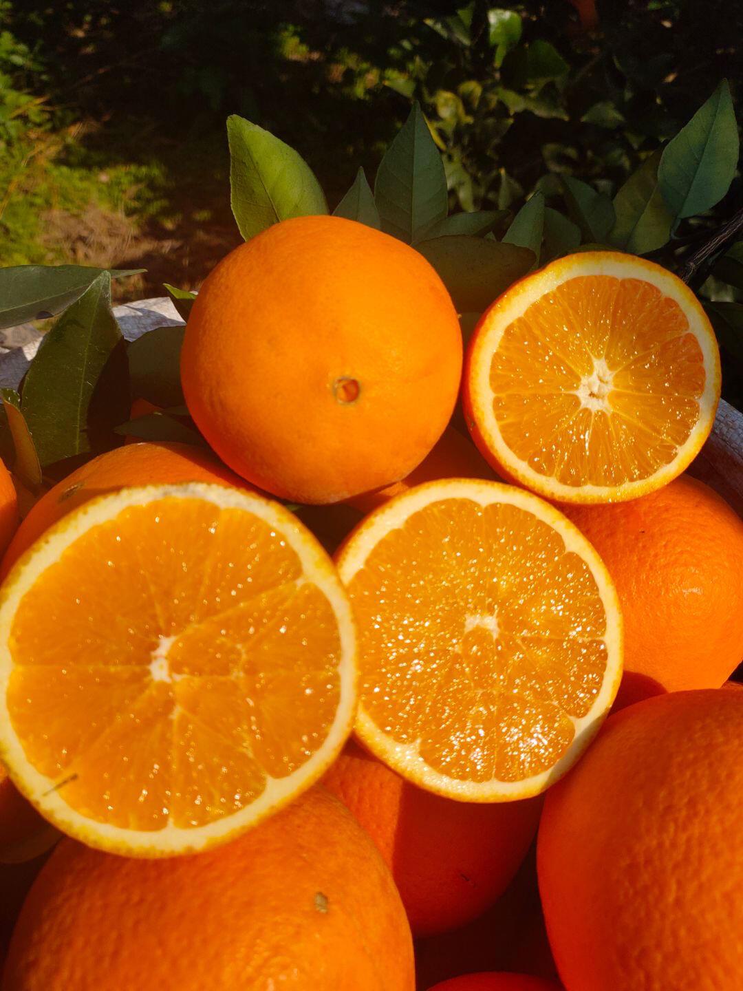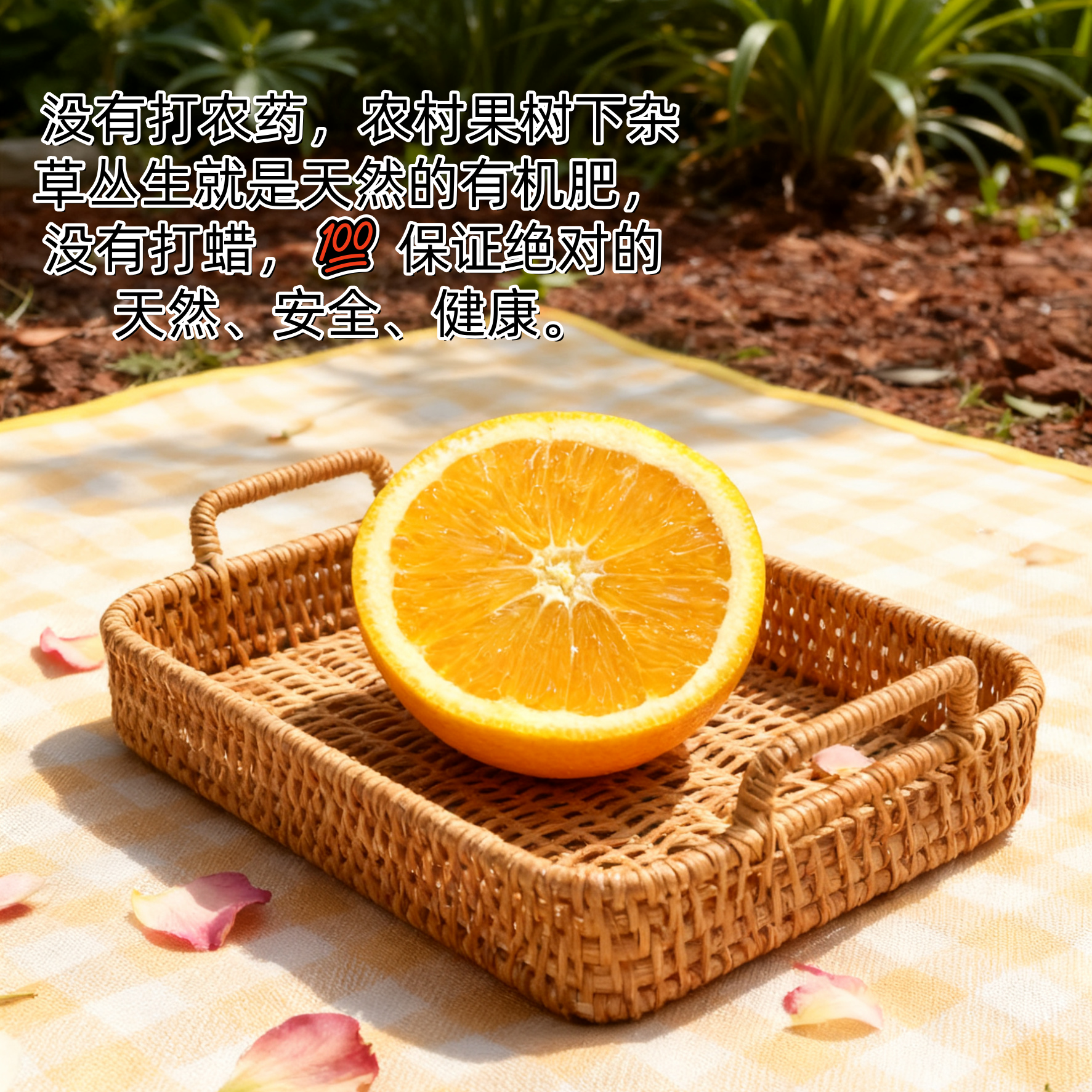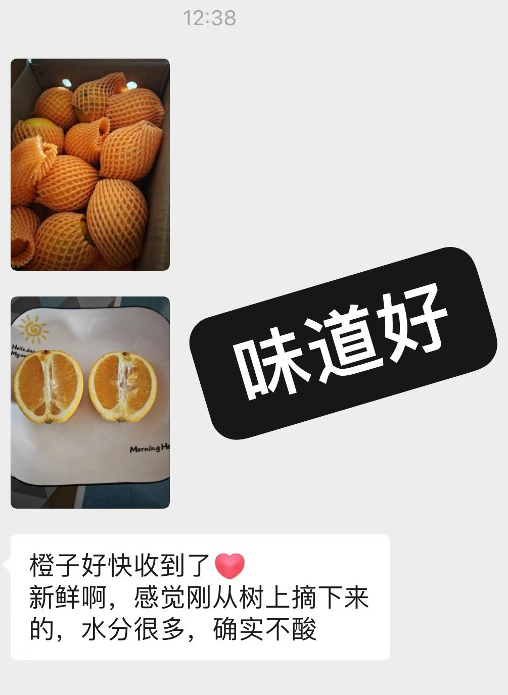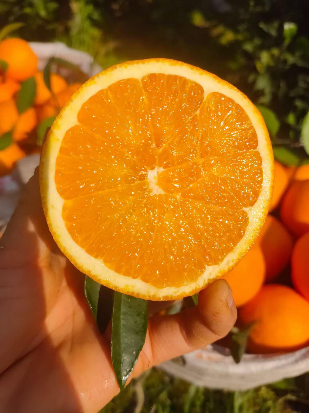 脐橙品质,总结几句: 1▶︎汁水爆多,直接压制喝鲜橙汁完全没问题。 2▶︎ 味道很甜,现在才开卖就是等糖化更高,约14%的甜度超过了其他品种的脐橙,9分甜1分酸左右。如果想吃100%甜可以把果子放一段时间自然化糖。 3▶︎ 没有打农药,农村果树下杂草丛生就是天然的有机肥,没有打蜡,💯 保证绝对的天然、安全、健康。 4▶︎ 香味很足,真的是自然成熟的果子的清香味。偶尔会有些麻点、花斑、黑疤,这正是自然生长成熟的体现。 5▶︎ 现摘24小时内现发的,绝对的新鲜! 6▶︎ 个头基本上是很均匀的,可能偶尔会有个头偏小的(相对的大的而言)。 7▶︎ 有几块地一起种的,朝向、水分有所不同,口感可能会有很小的差异。