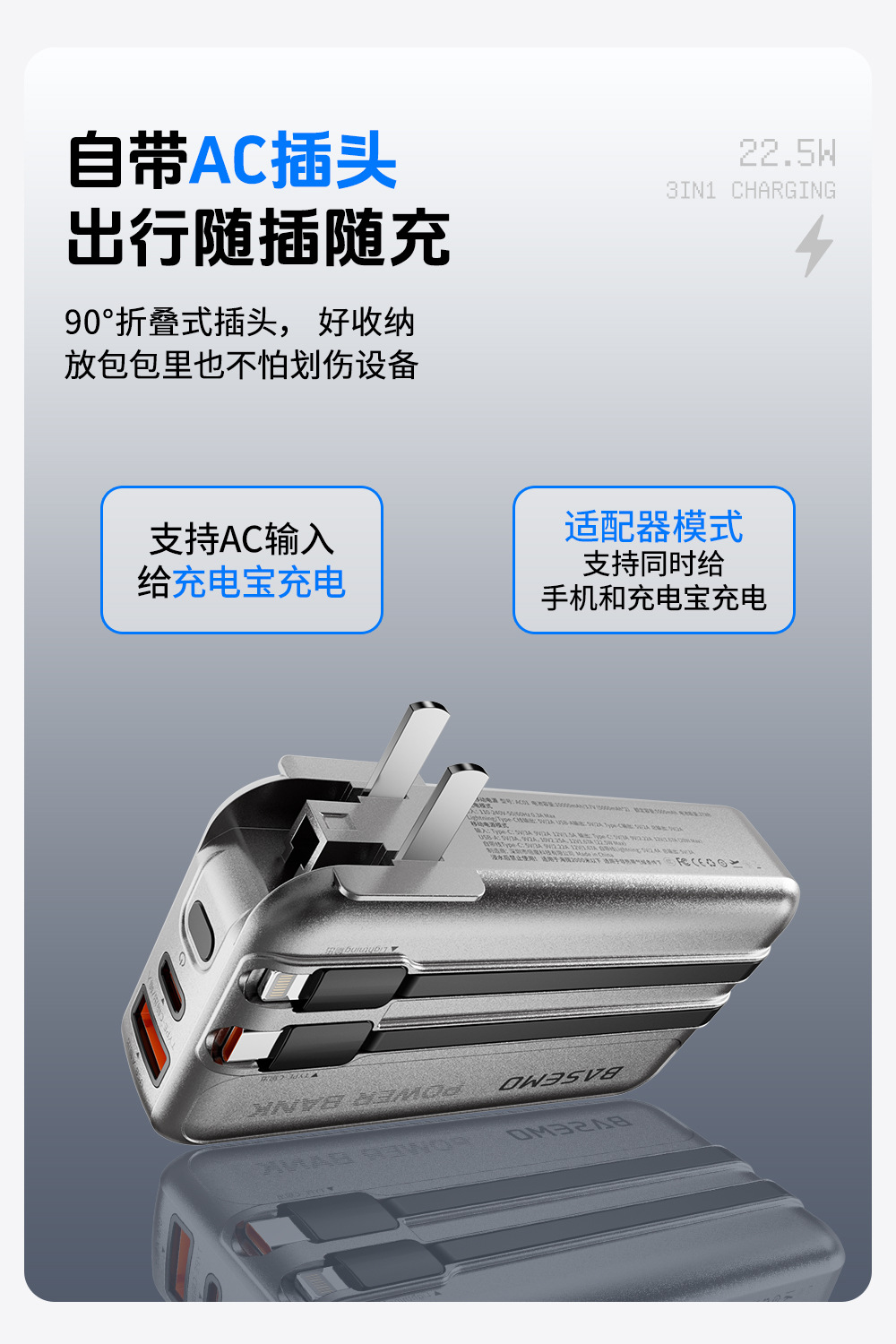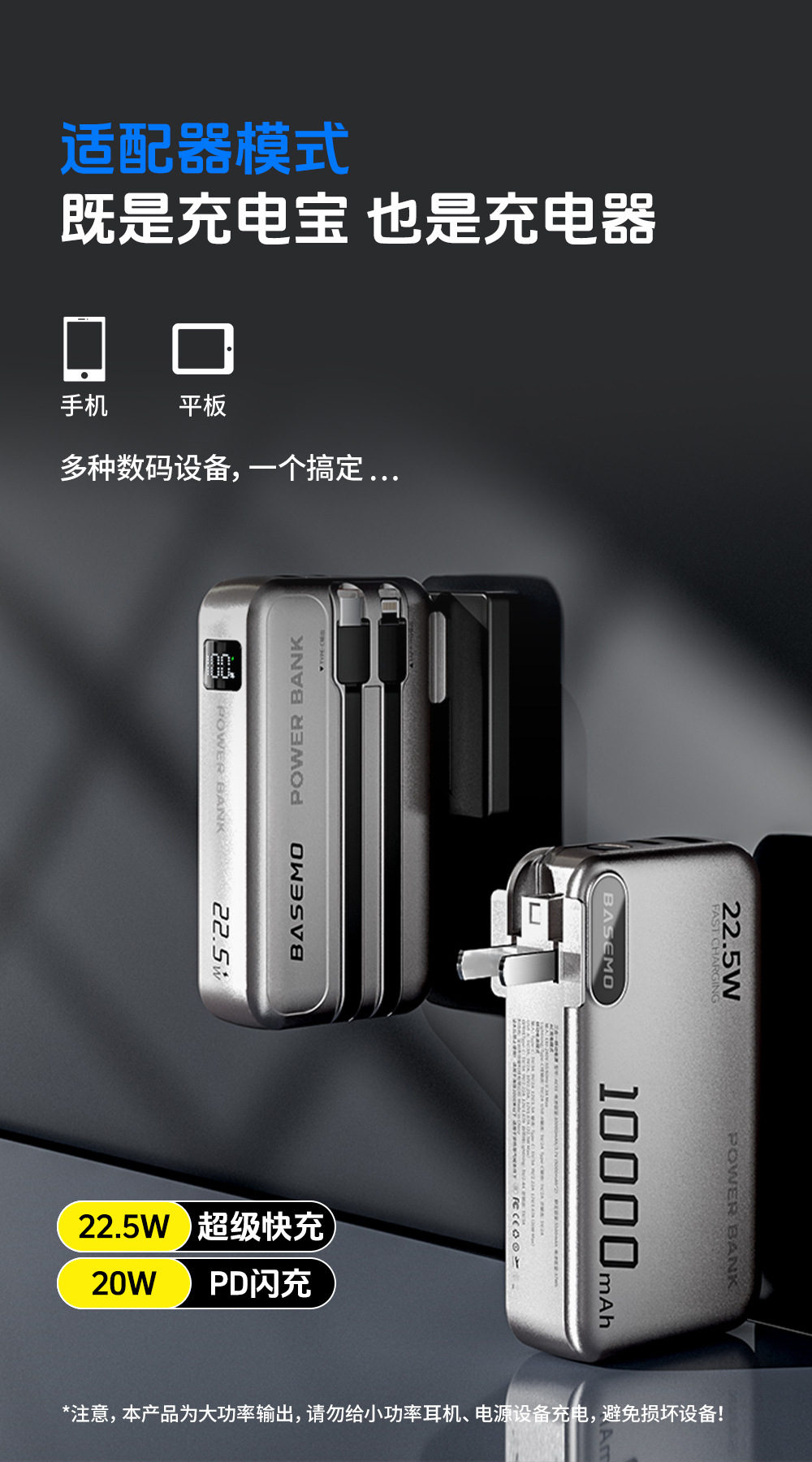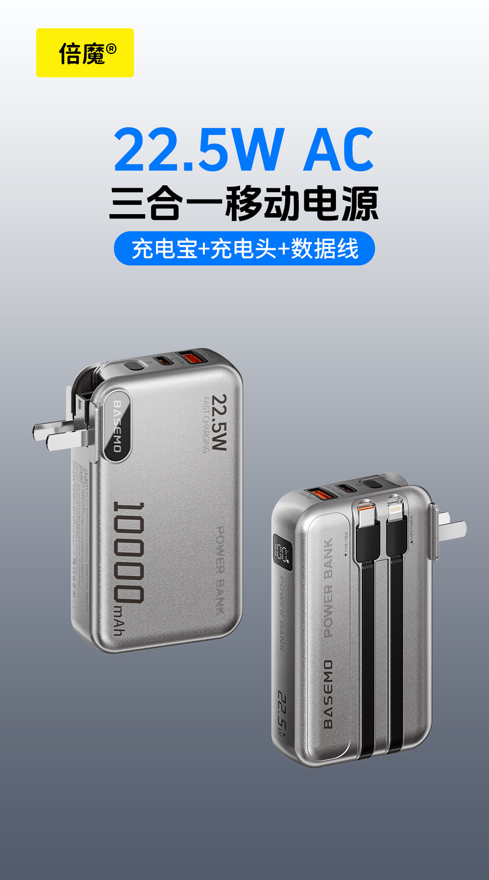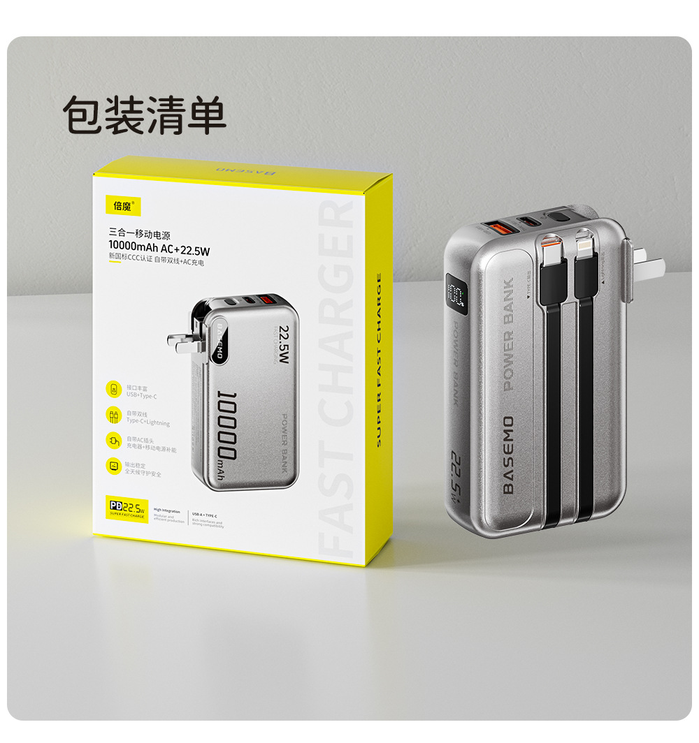 「自带双线!三合一款」3C认证倍魔快充2万毫安充电宝适用华为苹果安卓数码配件