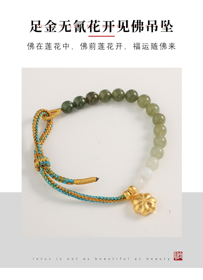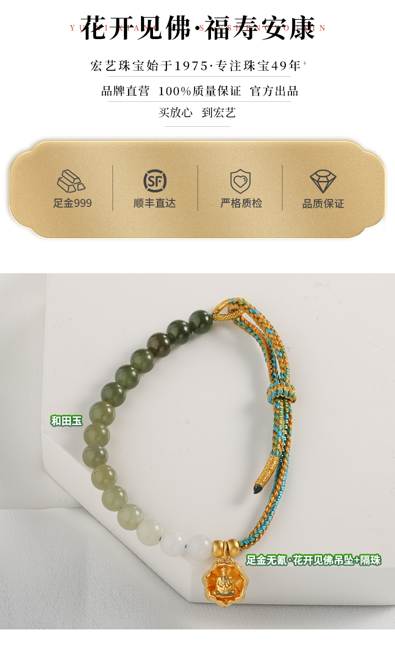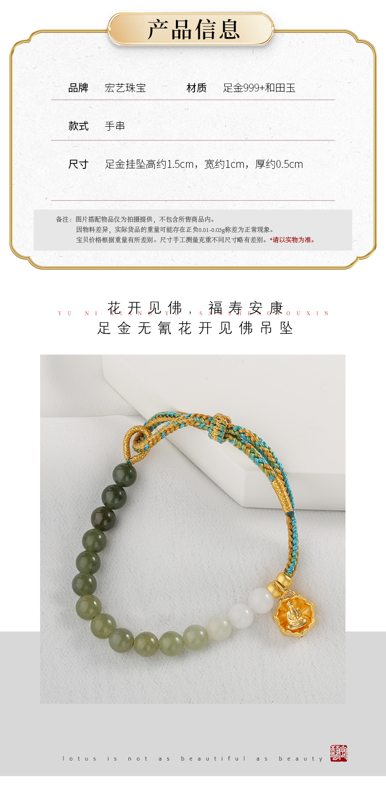 【宏艺珠宝】花开见佛 福寿安康无氢足金和田玉手串·足金手串