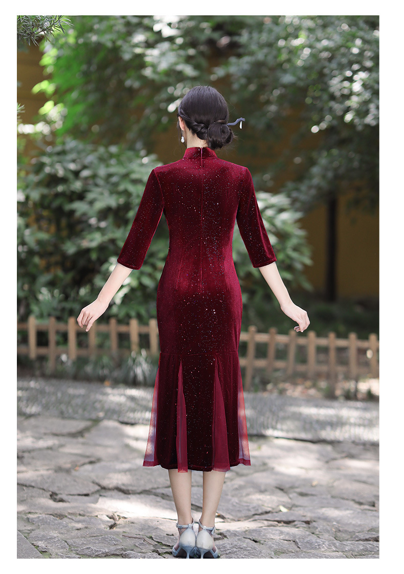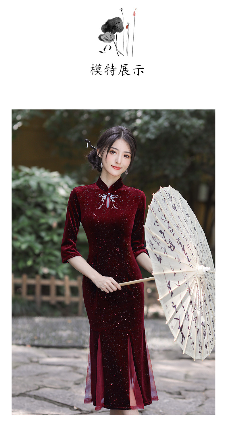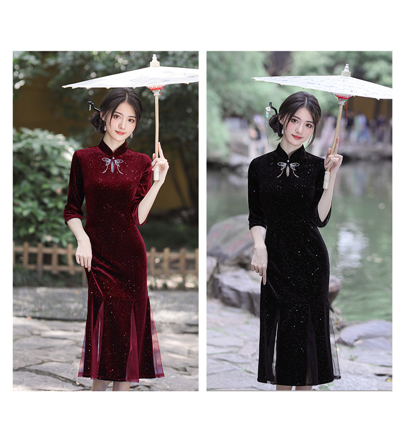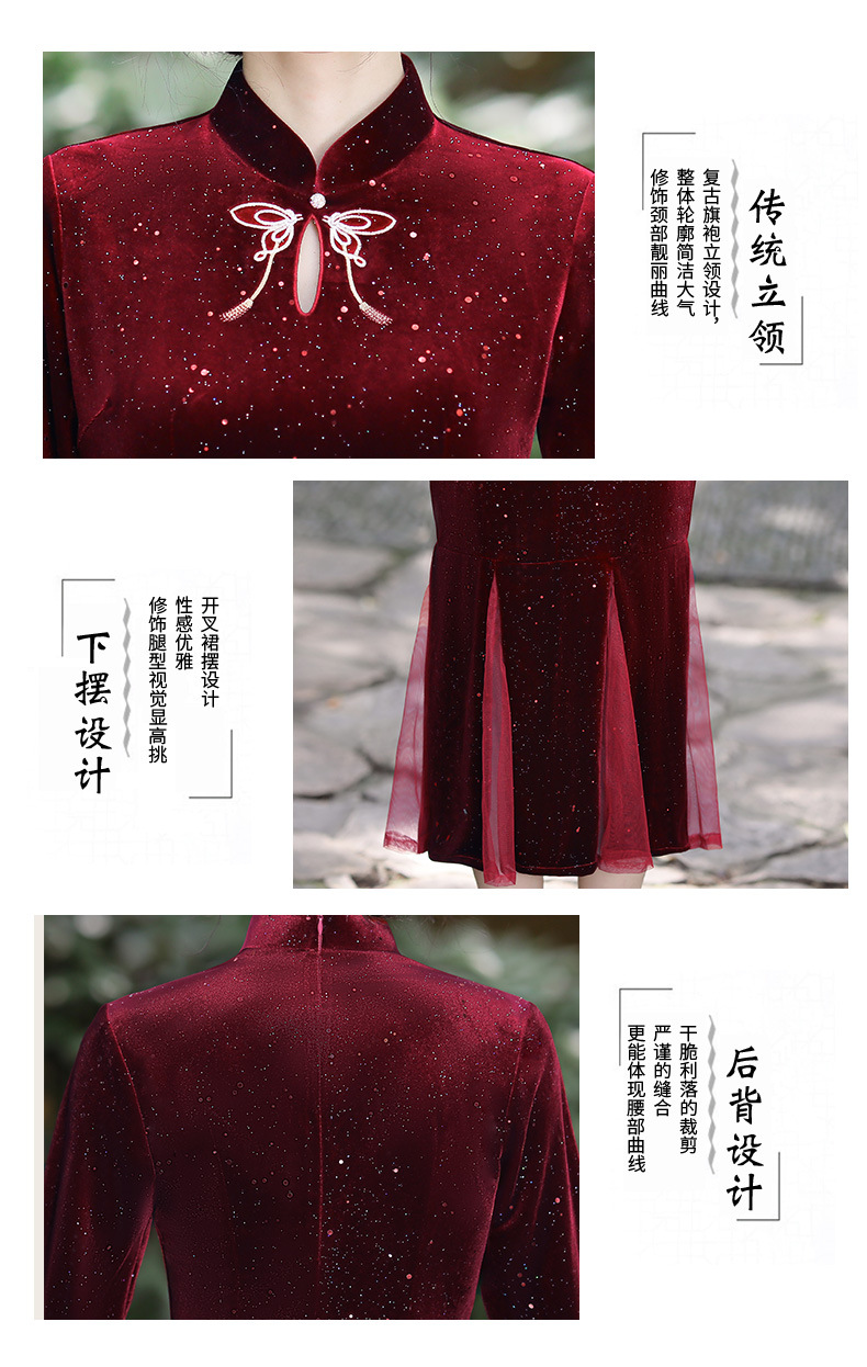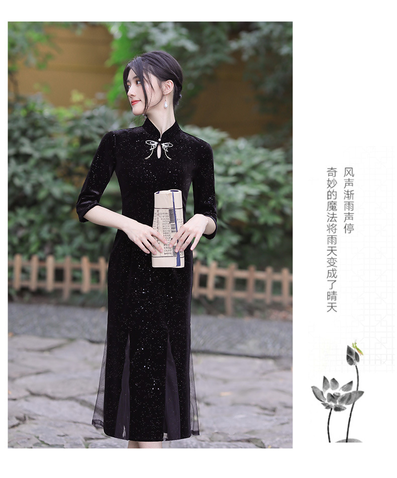 气质民国风,女中长款大小姐纯色连衣裙显瘦改良复古丝绒旗袍GSJ-150
