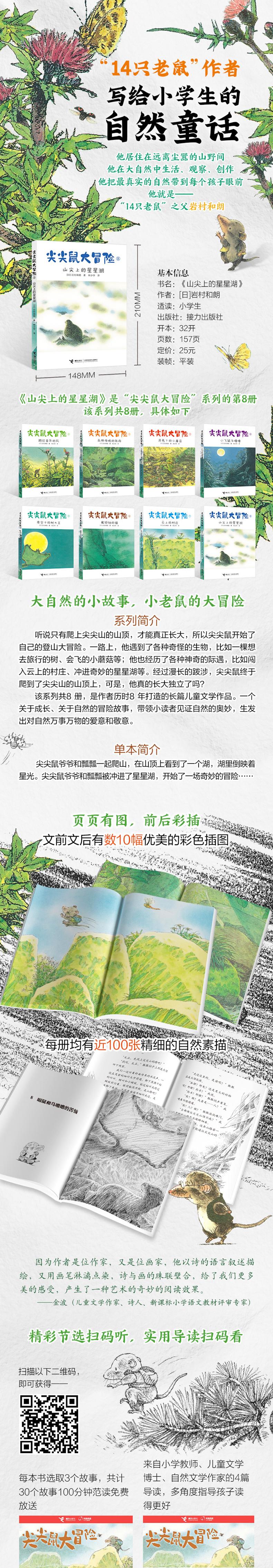 这是一本适合6岁以上孩子阅读的文字书。本书讲述的是尖尖鼠爷爷年轻时爬尖尖山的冒险故事。尖尖鼠爷爷和好朋友瓢虫瓢瓢一起爬山,在山顶上看到了一个湖,湖里倒映着星光。尖尖鼠爷爷和瓢瓢被冲进了星星湖,开始了一场奇妙的冒险。 本书是岩村和朗创作的“尖尖鼠大冒险”系列中的一册。除了是作者,岩村和朗也是画家,他为该书创作了100多幅精细插图,用文字与插画的组合,呈现出一个清新、迷人的动物世界。阅读这本书,可以带孩子亲近自然生态,探索自然神奇,感受大自然的美丽。