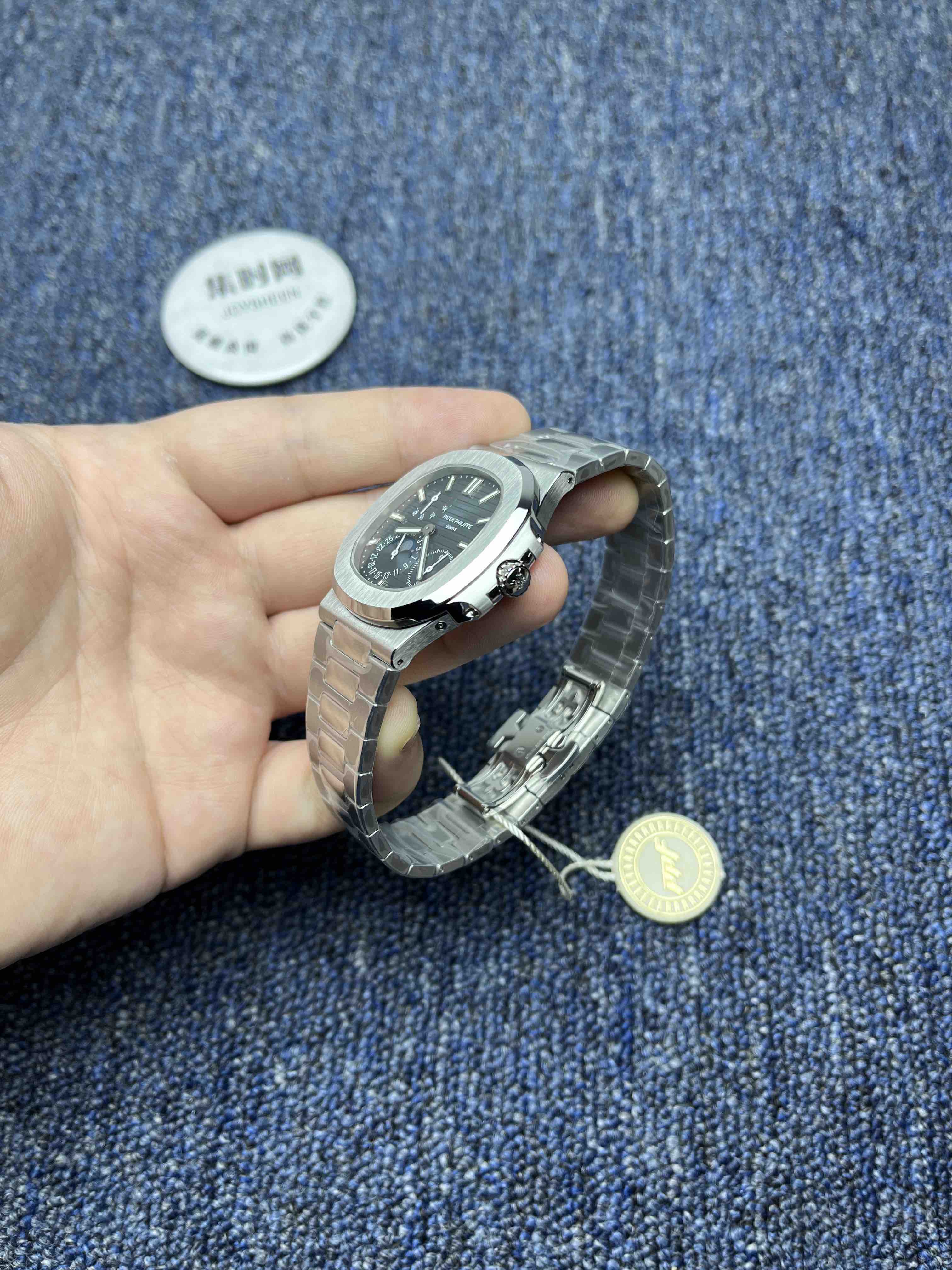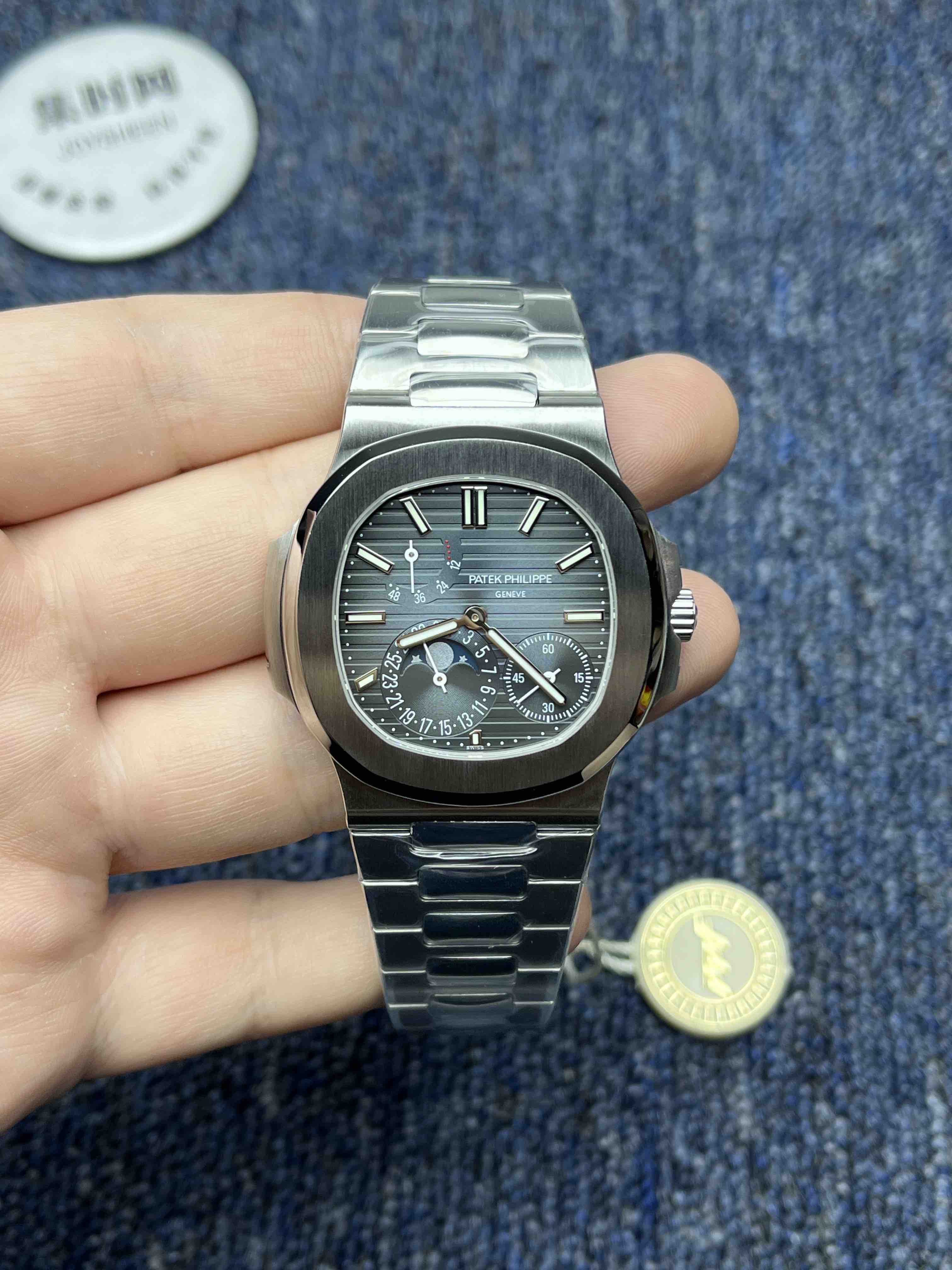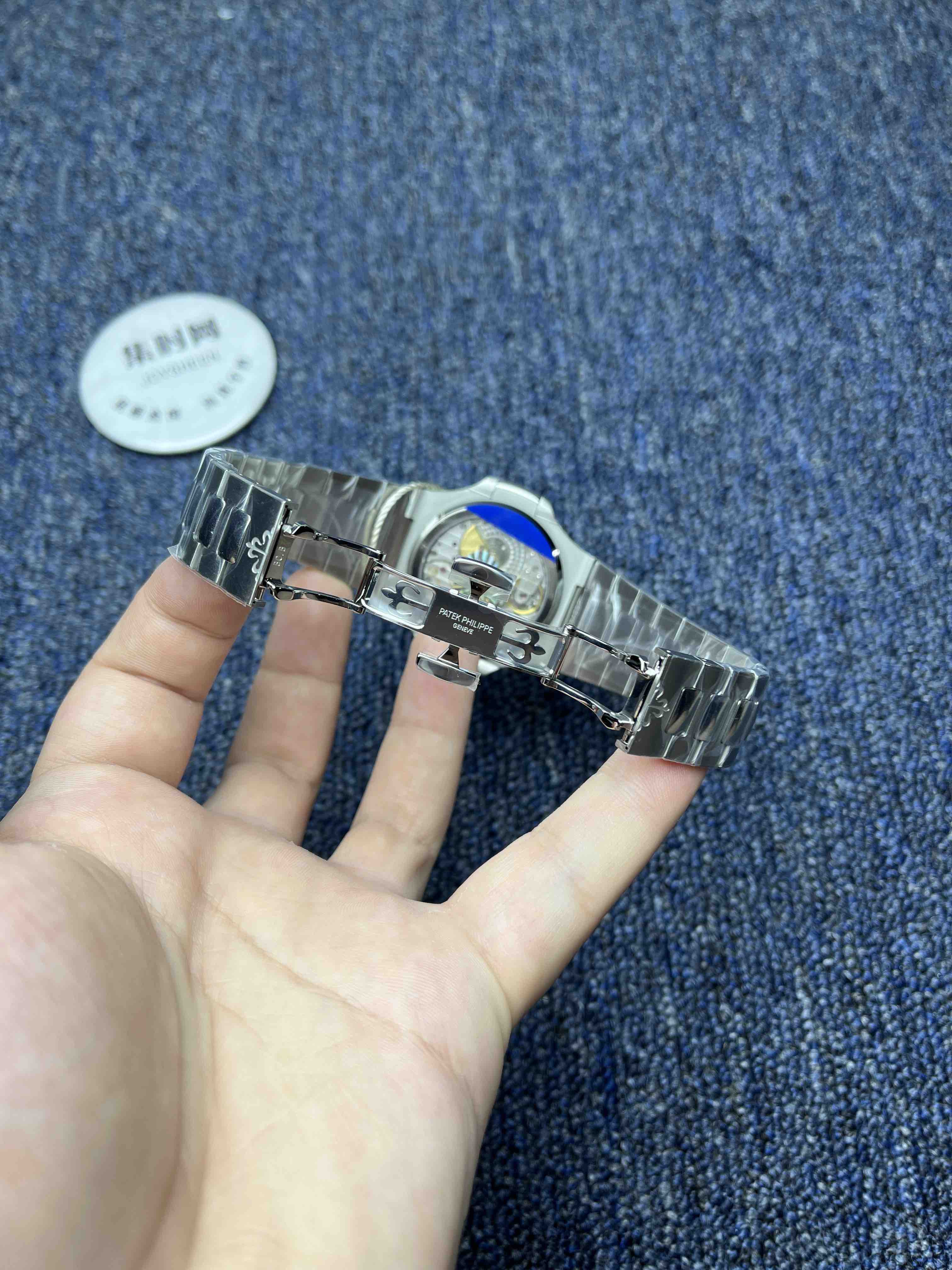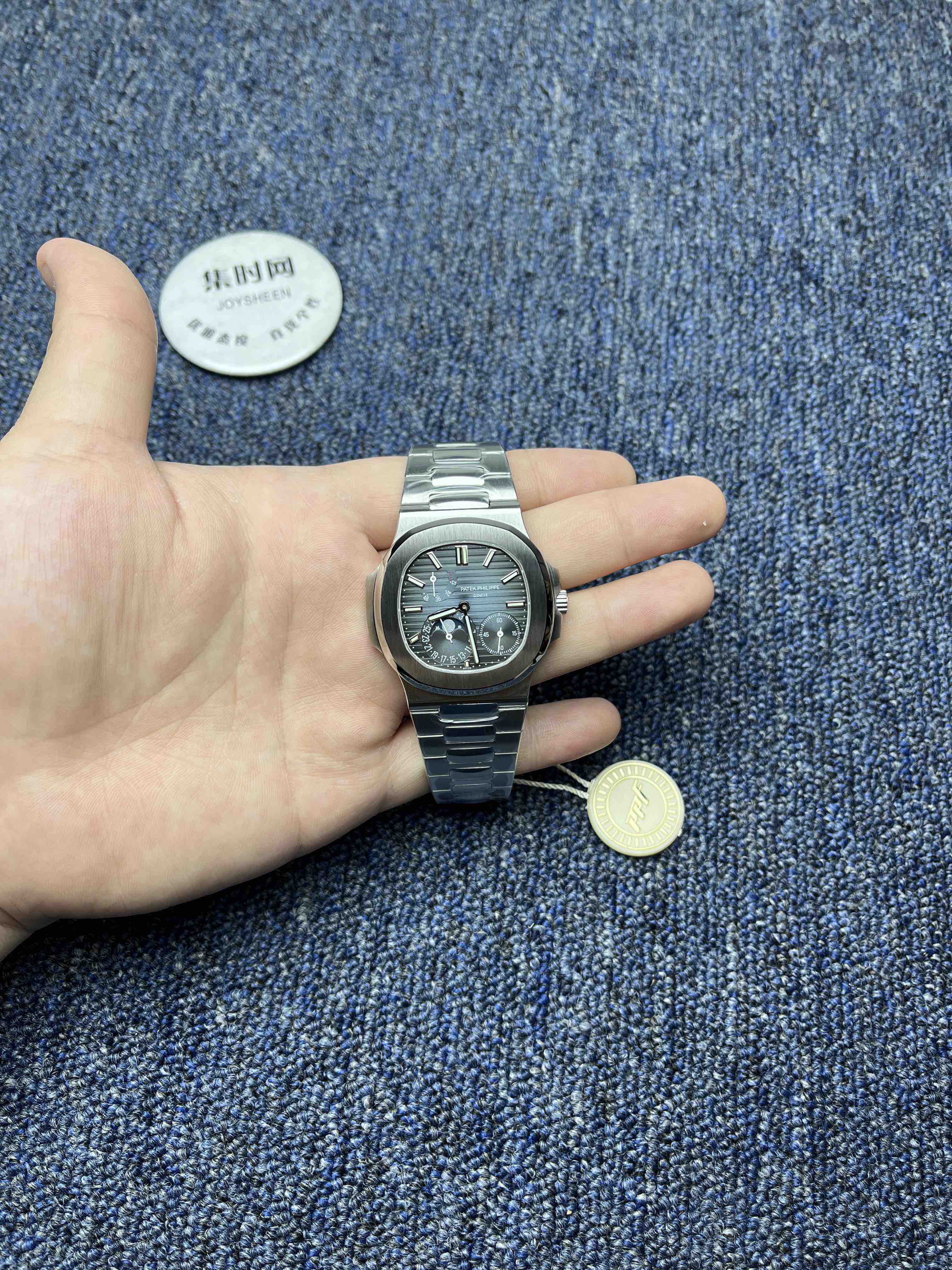PPF潜心三年 真“芯”之作!百达翡丽PP5712GR全新升级V3版,巅峰出道了!这是真正具有里程碑意义的超级一体机芯Cal.240 PS IRM C LU。全机芯零件数265个,平面游丝,21600每小时振荡次数 Gyromax带调节砝码的摆轮,稳定无误差。(不同于市面上现有的假机芯盖甲板,假珍珠陀) 全新修正的不锈钢表带,铰链部分根据真正的百达翡丽鹦鹉螺不锈钢表带拆解开发,和正品一致的贴合效果,逆袭市面上所有副本,铰链开合角度和正品一致,锁毕声音和正品相同。而PPF独家的“蓝魅”面无限接近接近原版,更是傲视群雄!