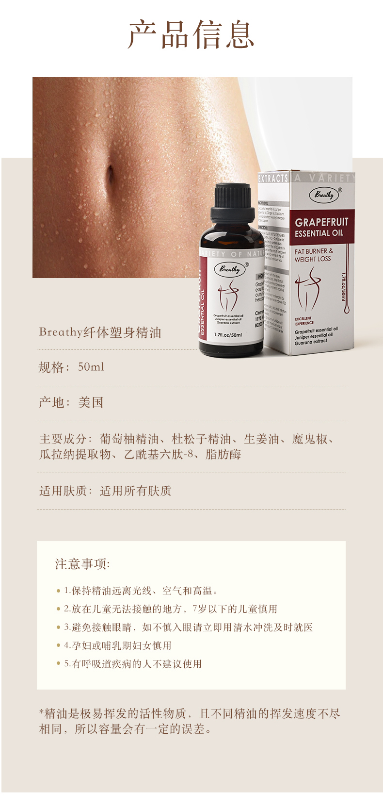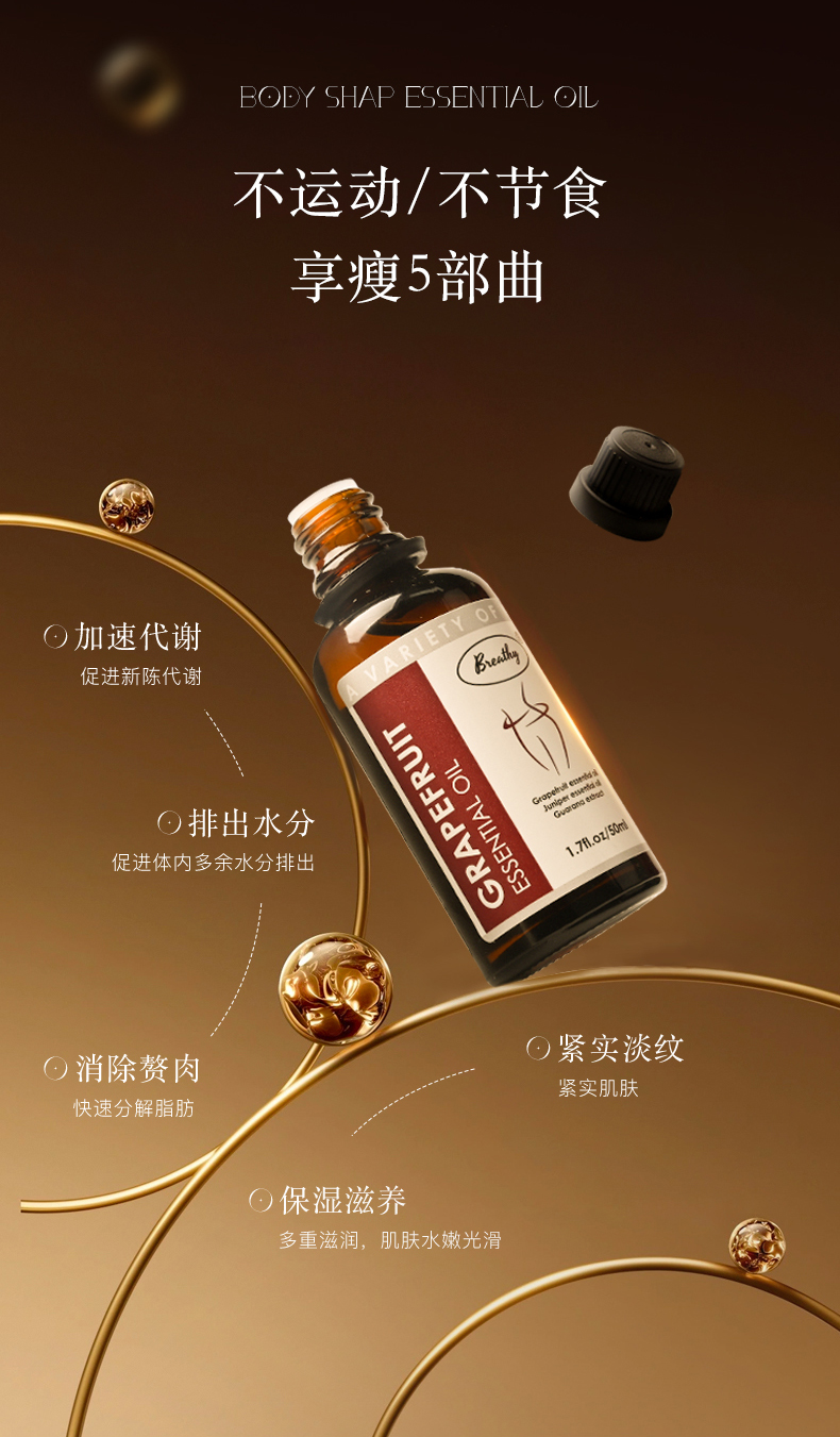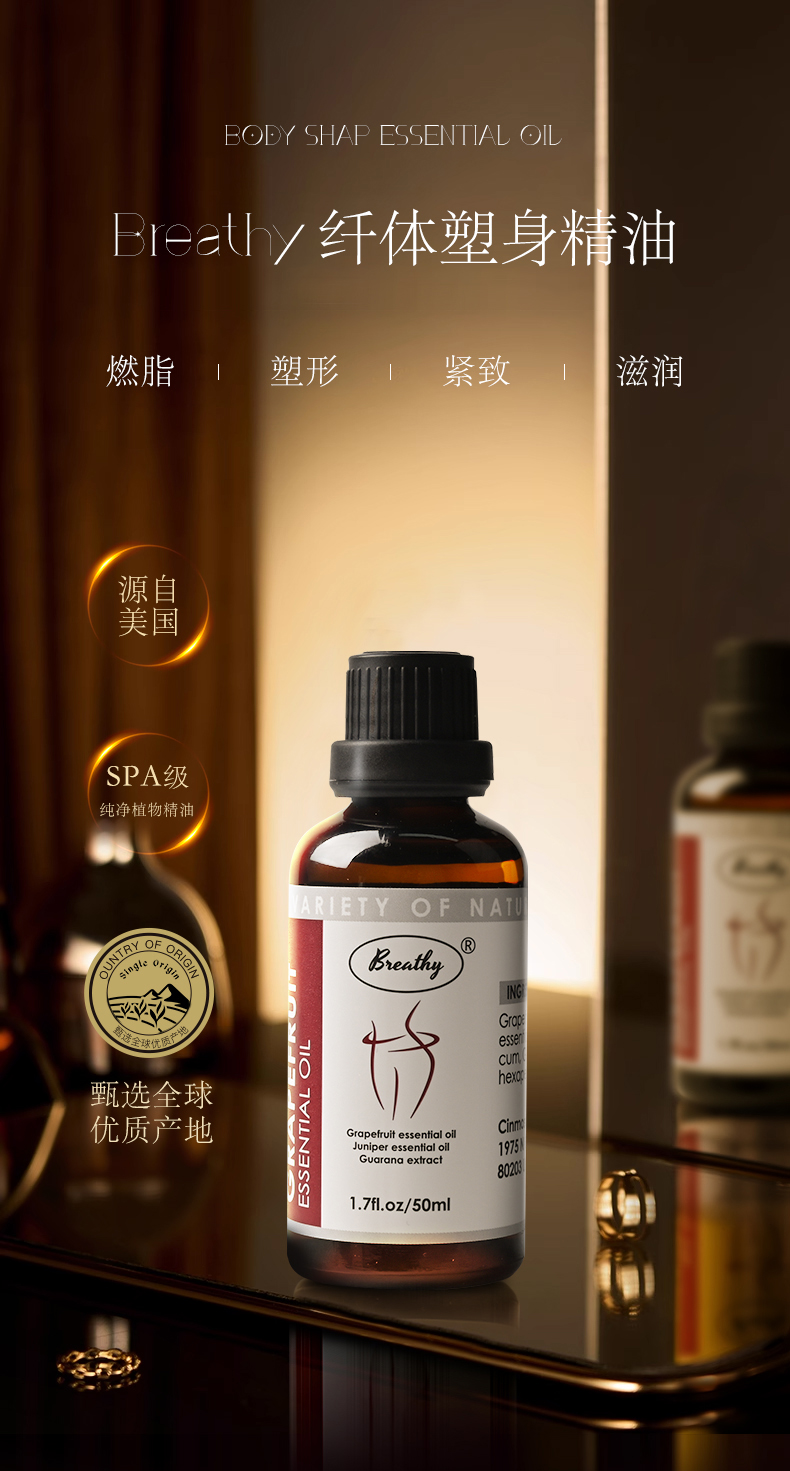 【美国原装进口】Breathy纤体塑身精油 局部减脂塑性 紧致滋润肌肤 甄选全球优质植物萃取 深层热感燃脂科技 美国FDA和GMP双认证 品质有保障 50ml/瓶 下单赠送滚珠按摩器