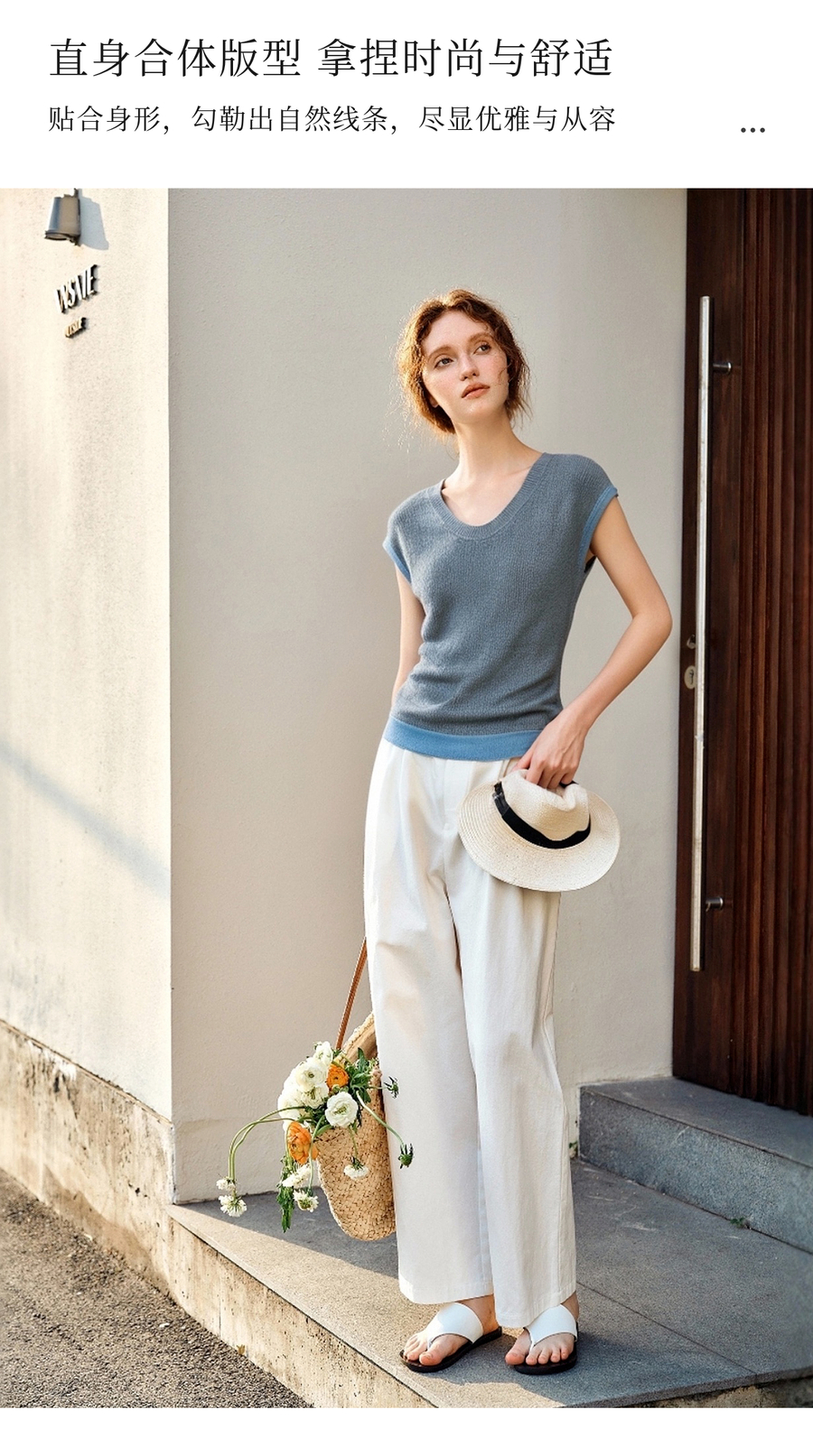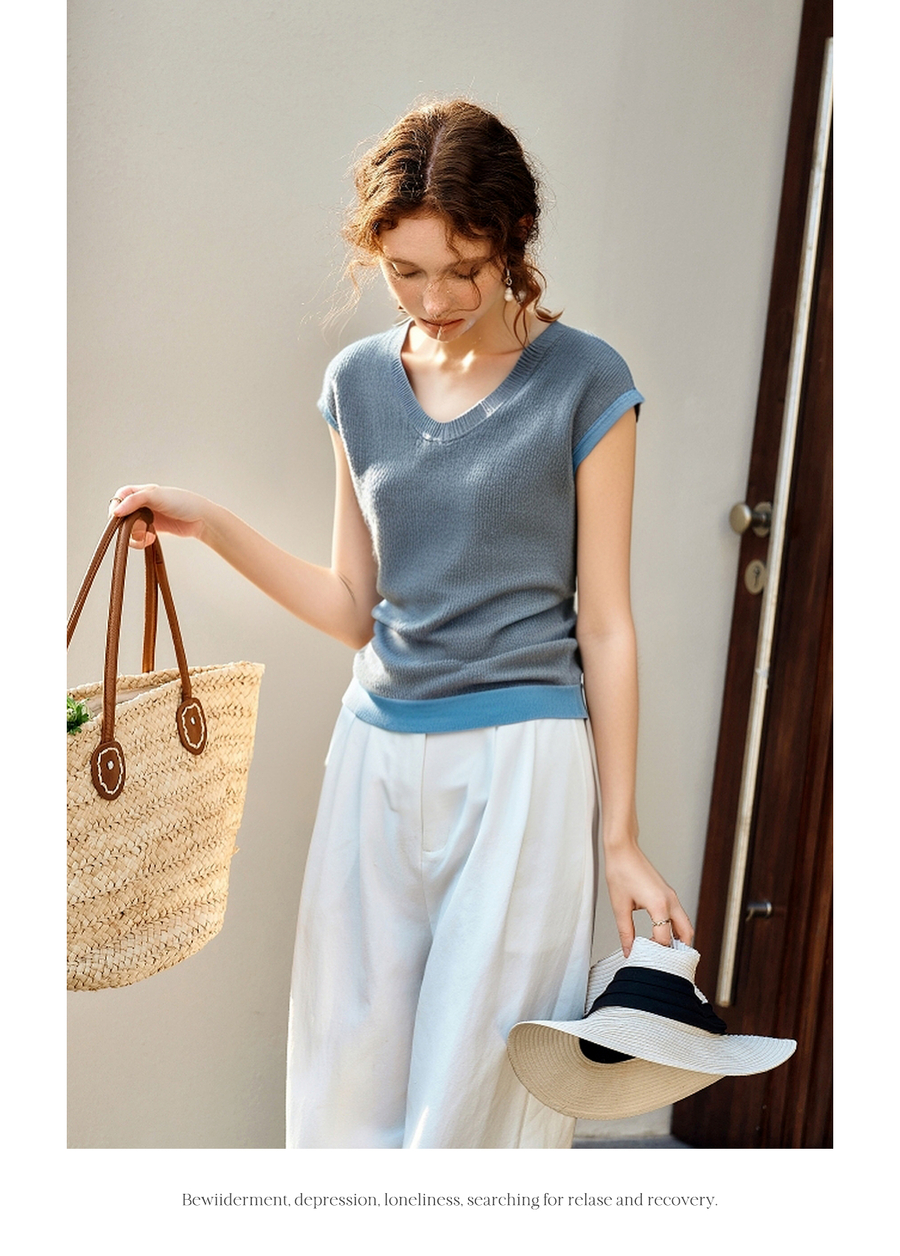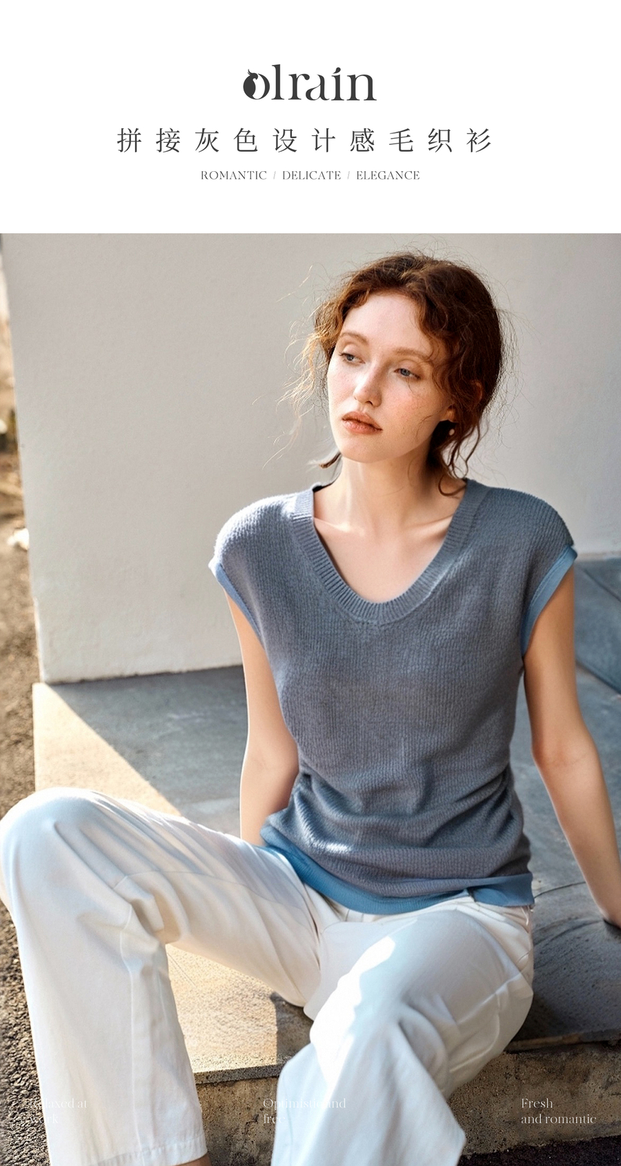 OLrain欧芮儿拼接灰色针织衫女夏季2025新款V领设计修身显瘦上衣