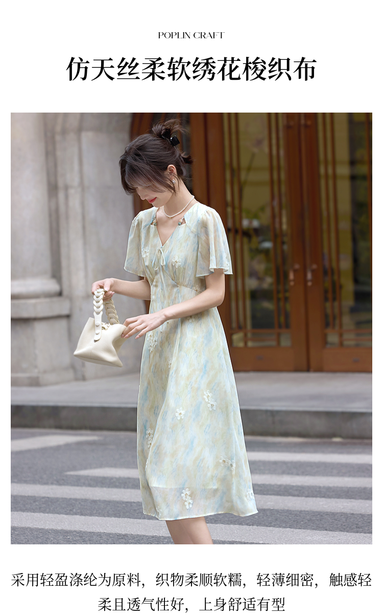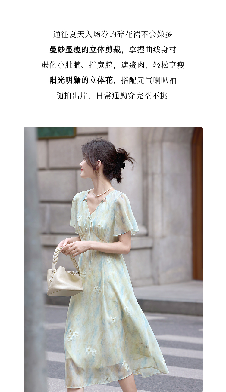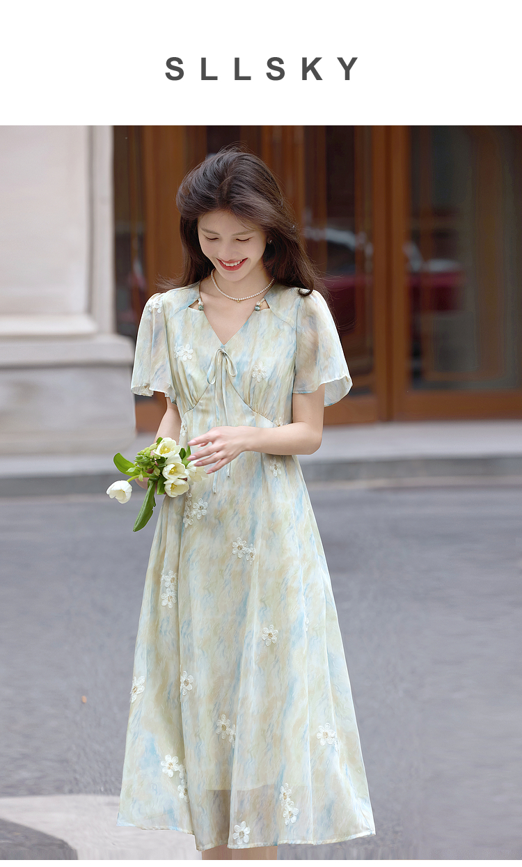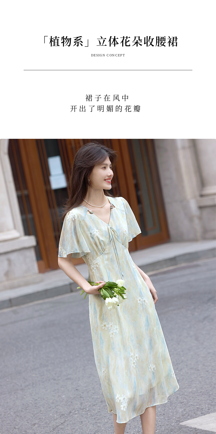 熙世界法式优雅立体花朵V领连衣裙2025夏季新款度假风茶歇裙子