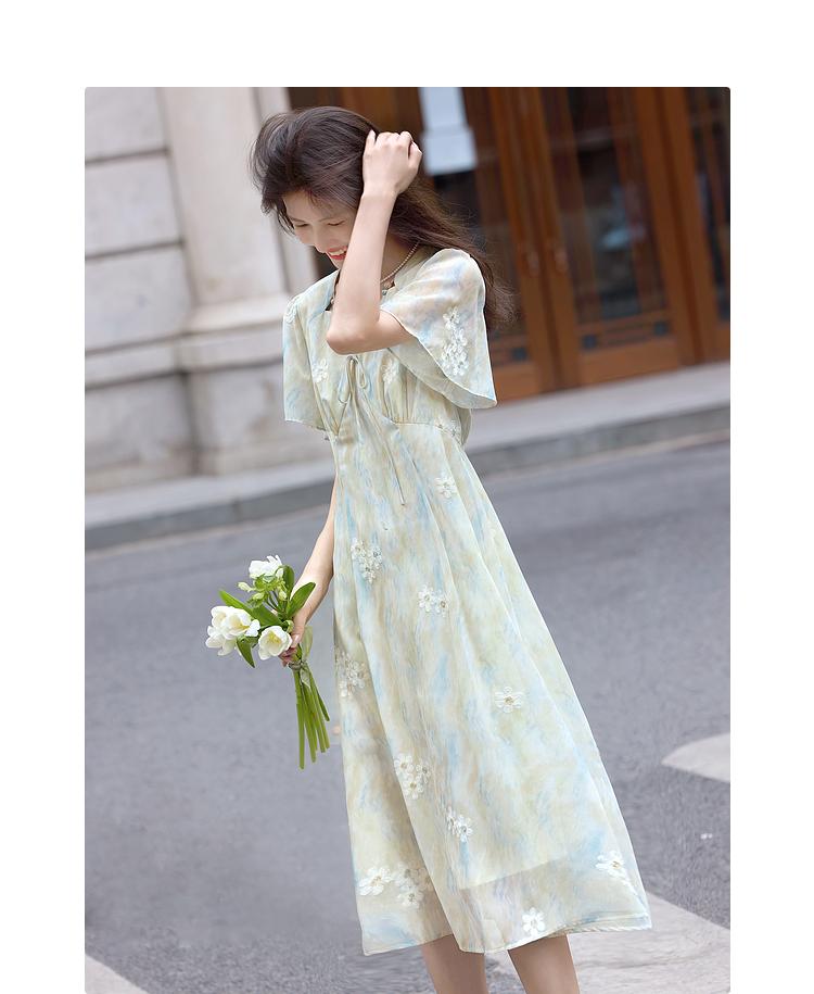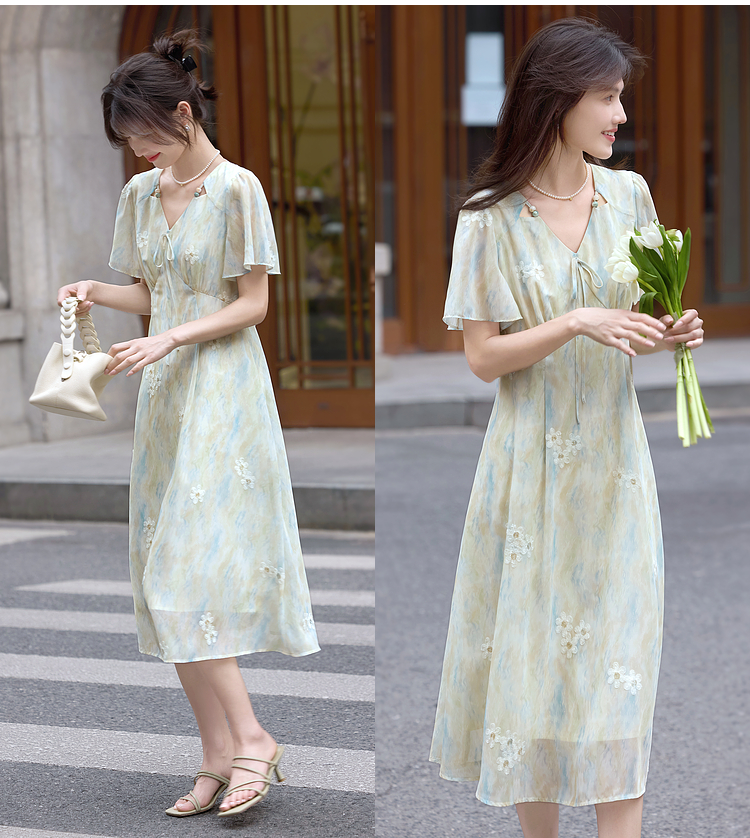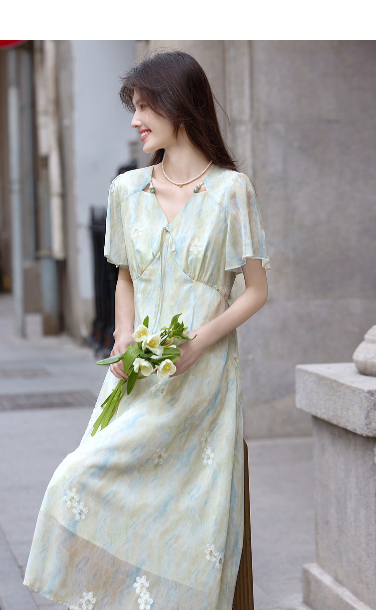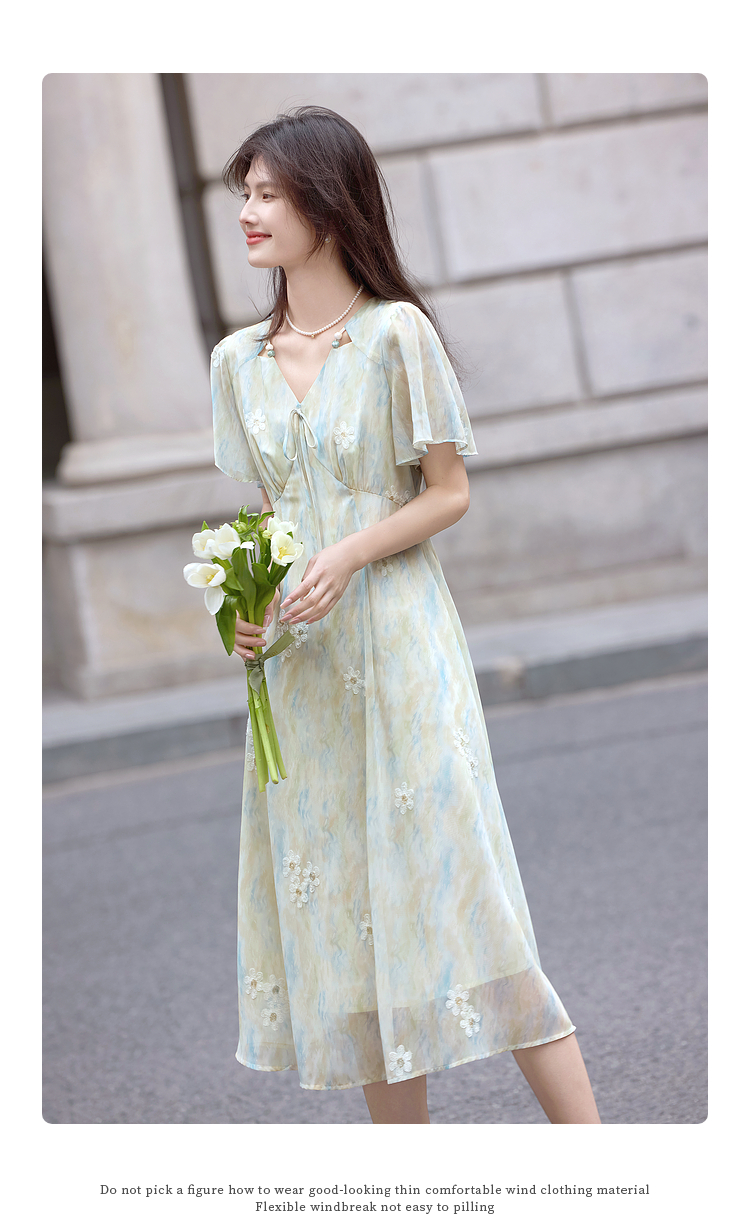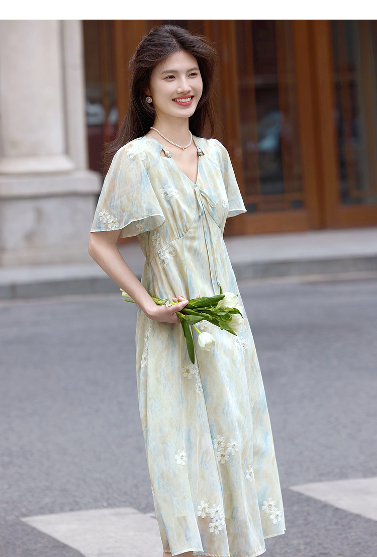 熙世界法式优雅立体花朵V领连衣裙2025夏季新款度假风茶歇裙子