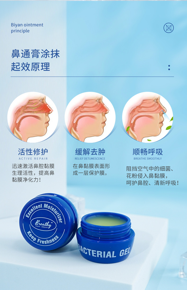 【使用方法】用涂抹棒沾取膏体,将产品均匀涂抹于鼻翼两侧或鼻腔下方;情况严重者可涂抹于鼻腔内。