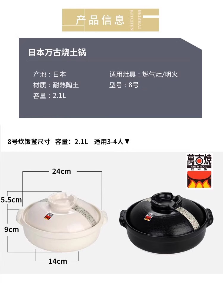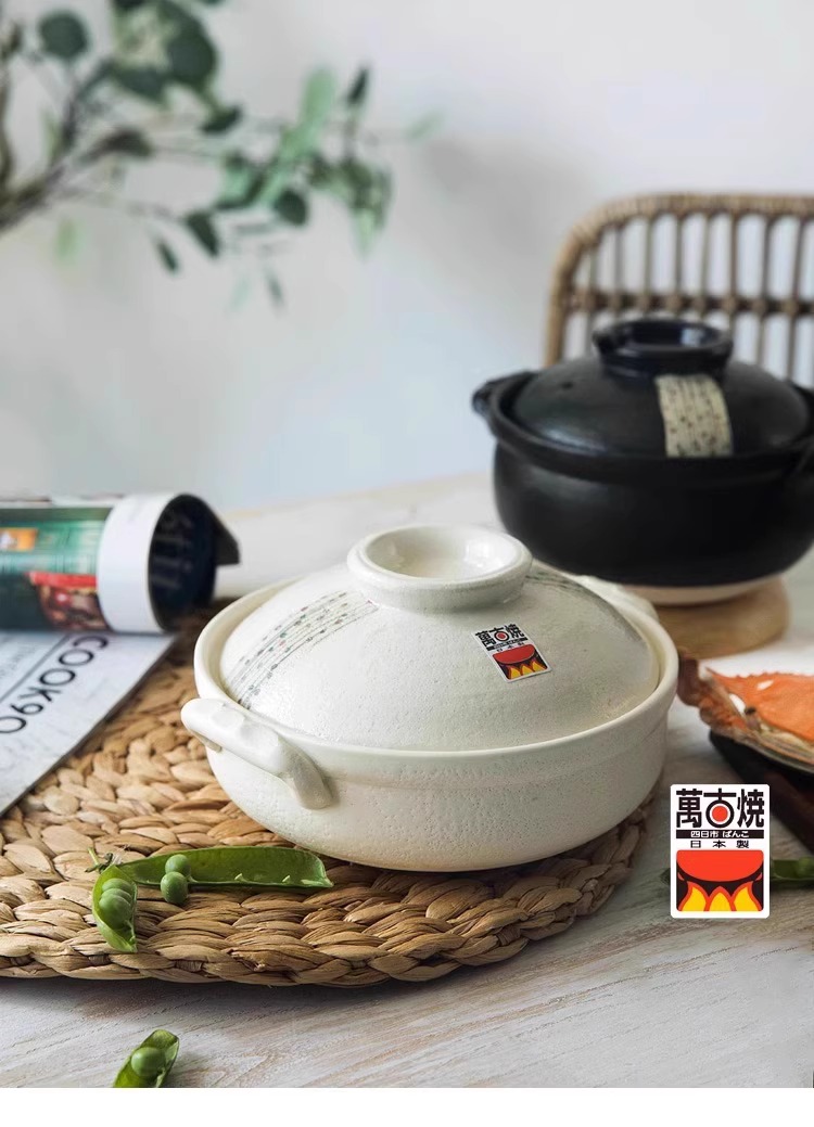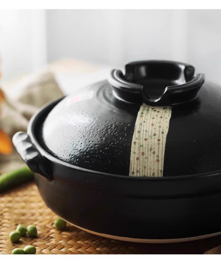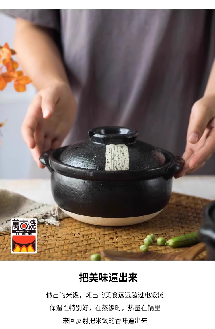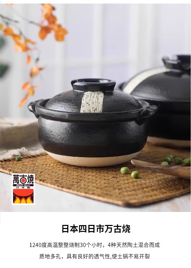 日本进口万古烧砂锅浅口家用煲汤锅炖锅陶瓷锅煮粥黑玉8号砂锅2.8L