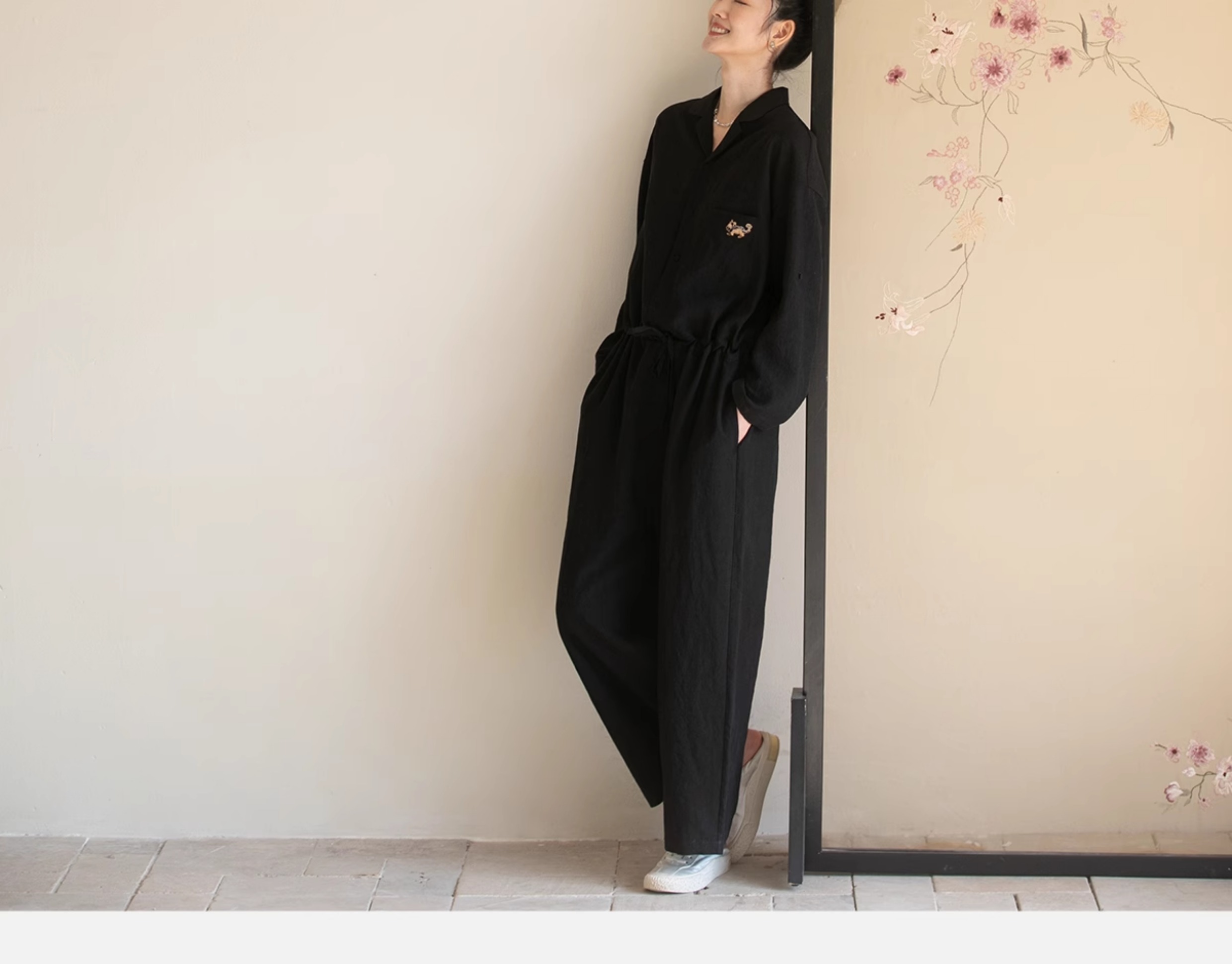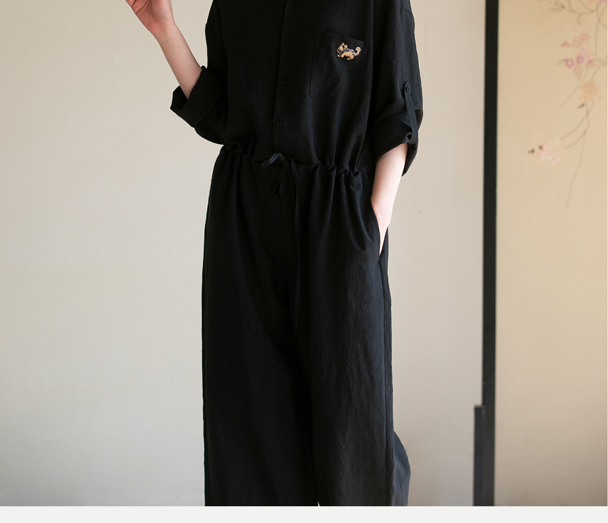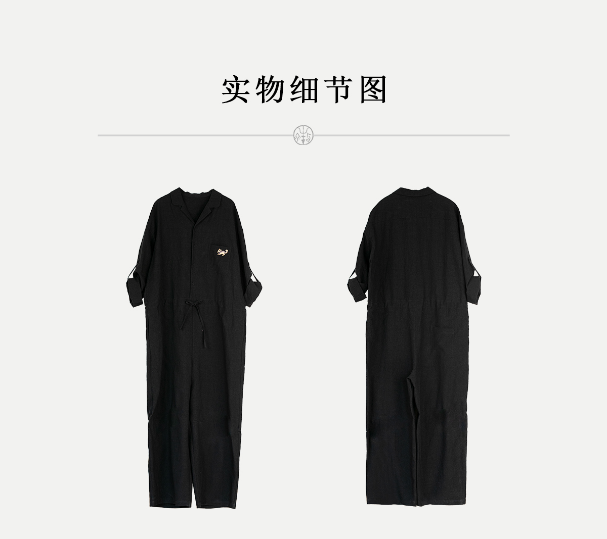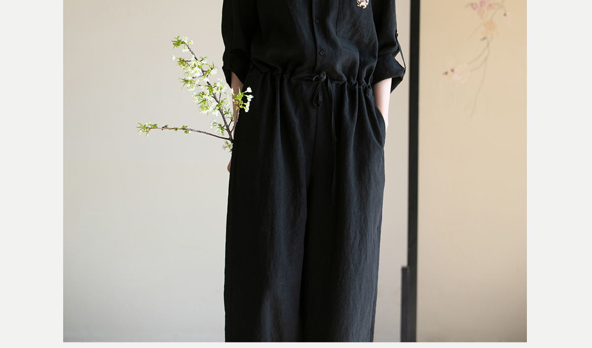 牧衣游原创 刺绣麻料素色连体裤女新款宽松黑色显瘦休闲裤 半冬雨
