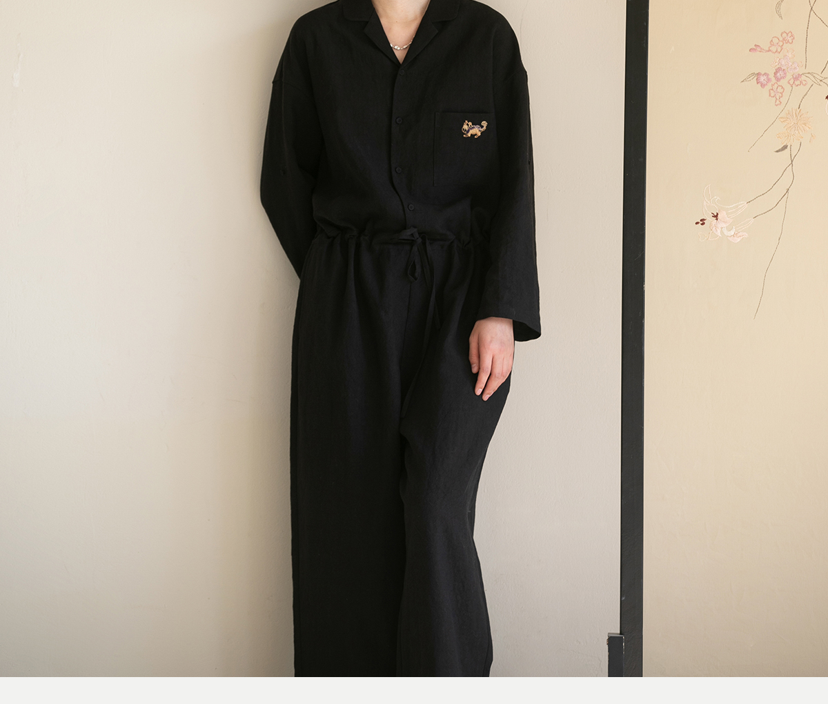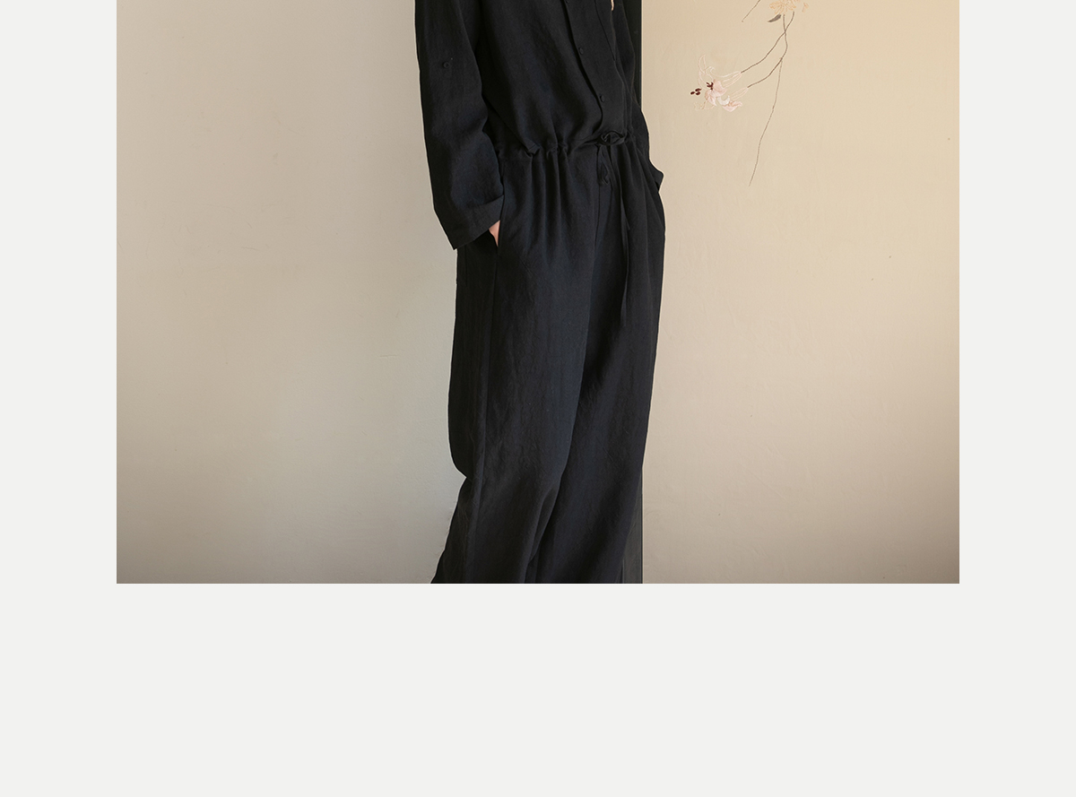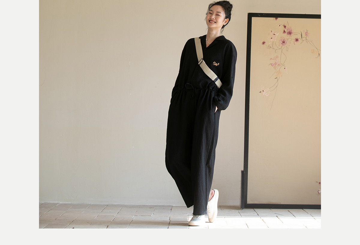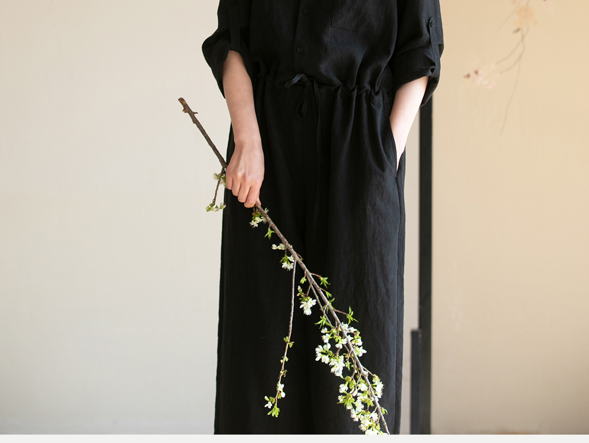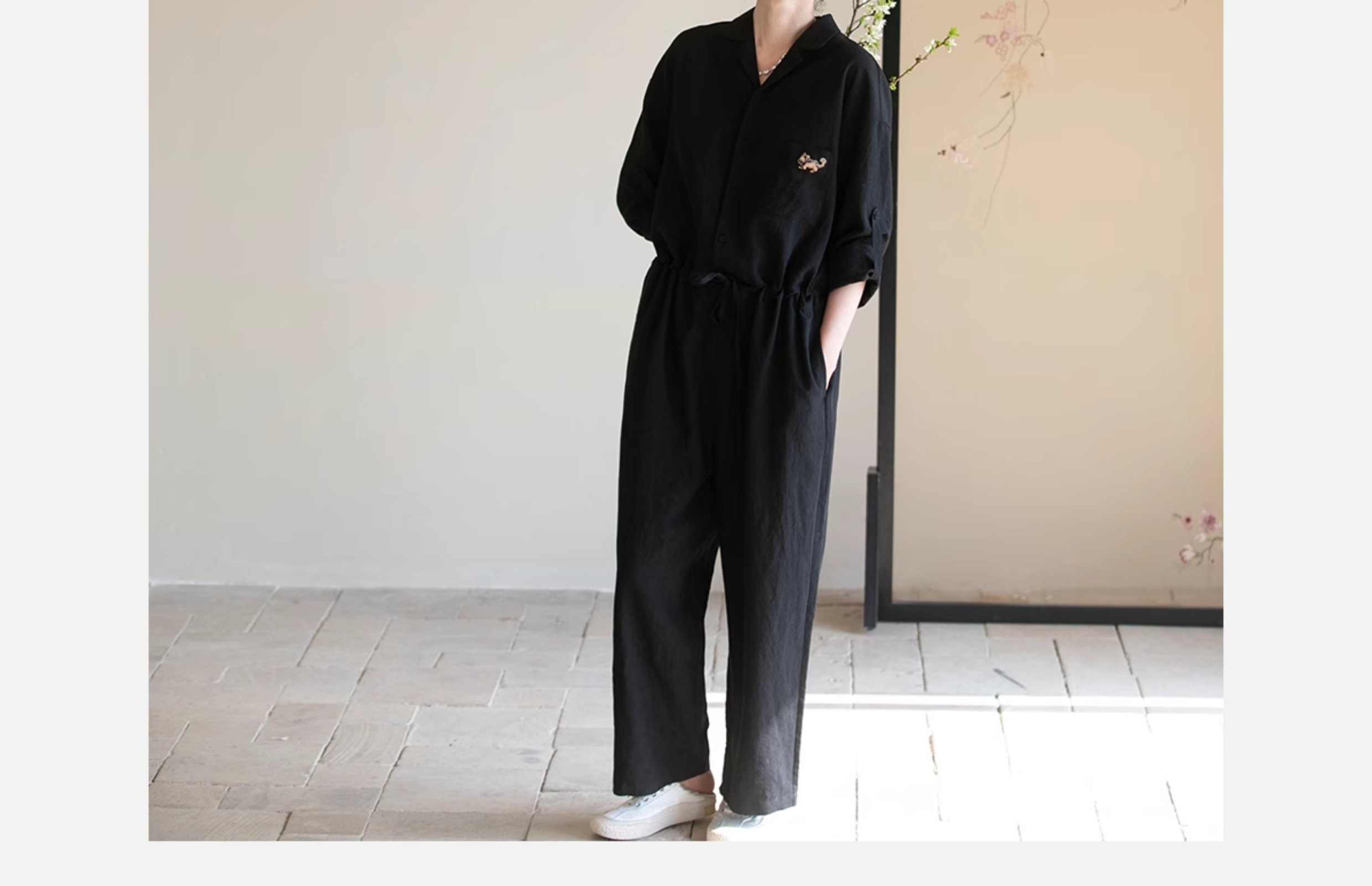 牧衣游原创 刺绣麻料素色连体裤女新款宽松黑色显瘦休闲裤 半冬雨