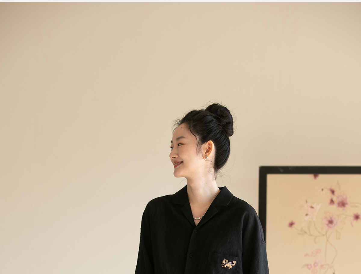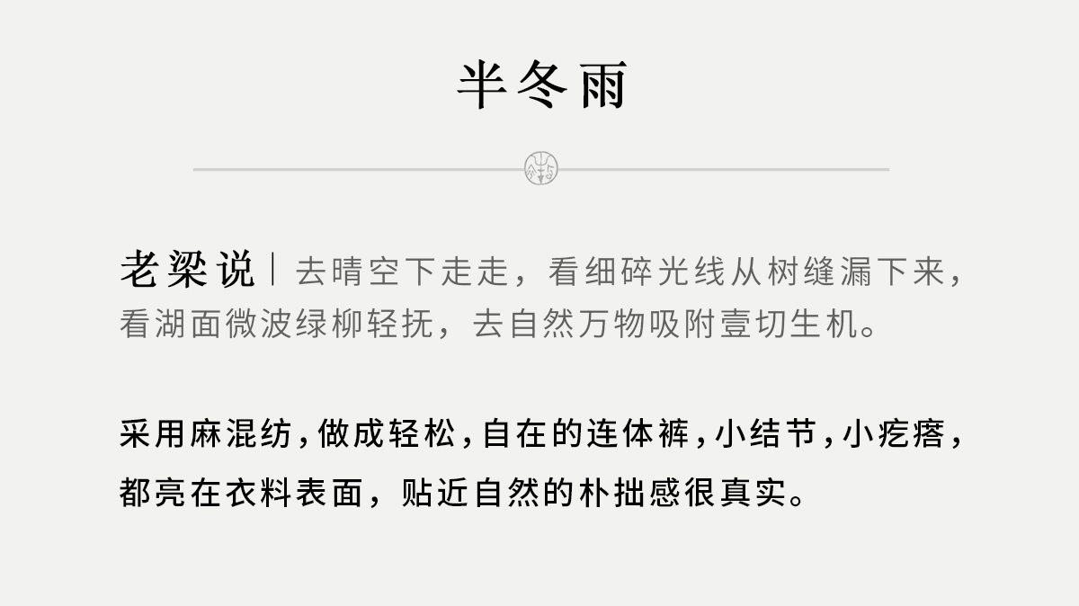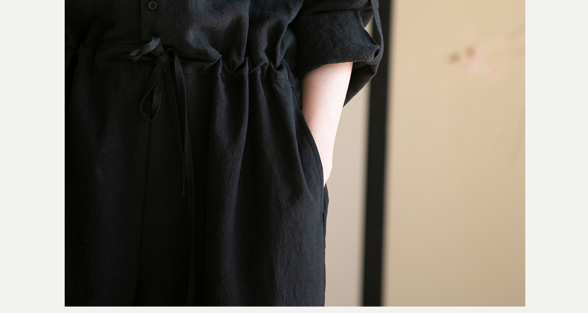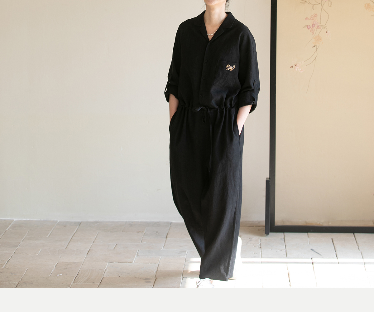 牧衣游原创 刺绣麻料素色连体裤女新款宽松黑色显瘦休闲裤 半冬雨