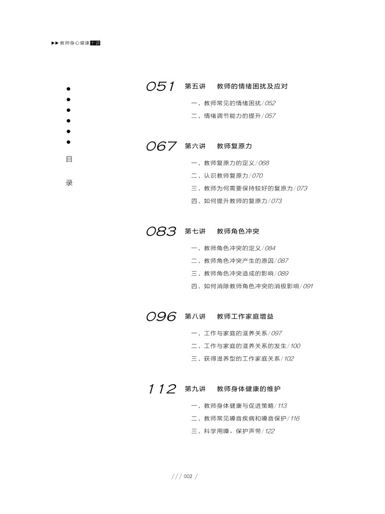 本门课程可以帮助教师了解如下的知识内容,教师心理健康、教师职业倦怠、教师复原力、教师职业压力、教师压力后相关成长、教师的工作家庭冲突、教师的工作家庭增益、教师情绪、关于教师的情绪劳动等内容,在掌握知识的同时,教会教师调控情绪、改变认知、进行自我照顾、获得有质量的社会支持等的方法。总之,通过本门课程的学习不仅帮助教师获得与其身心健康有关的知识,更重要的是获得维护和提升其健康的方法。本门课程的特色是在讲解中穿插案例和体验性活动,不仅将知识以一种生动的方式传递给教师们,还要帮助他们通过体验感受到所学习方法的效果,促进其从态度上出现改变,以此为契机在工作生活中自觉使用维护身心健康的方法。