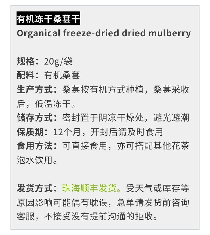 桑葚和草莓一样,对农药等药剂的吸附力很强,所以桑葚种植过程是否安全就尤为重要。桑葚采收后,保存不易,清洗后冻干制作成桑葚干便是一个合适的加工方式。口感酥脆,口味酸甜。作为解压小零食,亦或是泡茶,都非常不错。