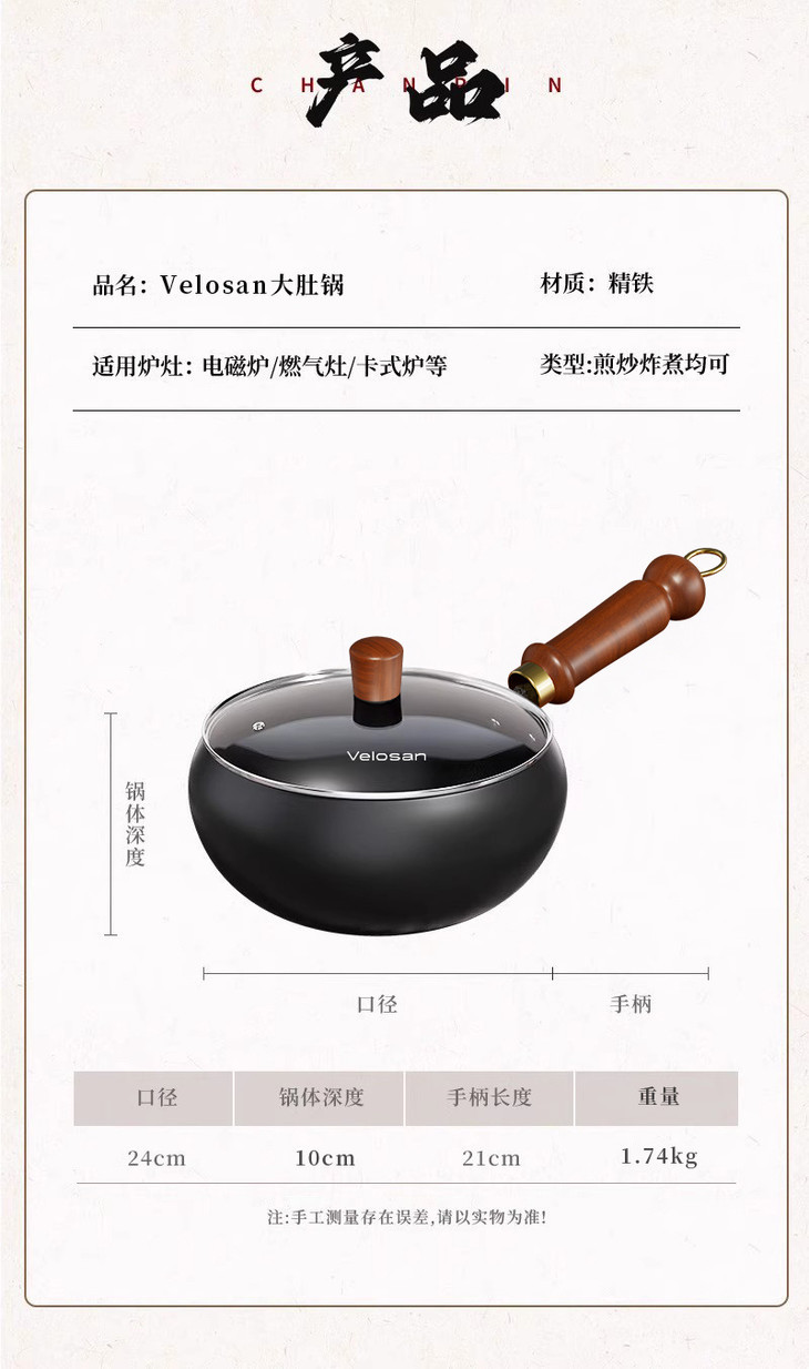 【顺丰发货】velosan温仑山大肚铁锅,高纯铁材质,0涂层超健康;电磁炉、燃气灶都通用【G】