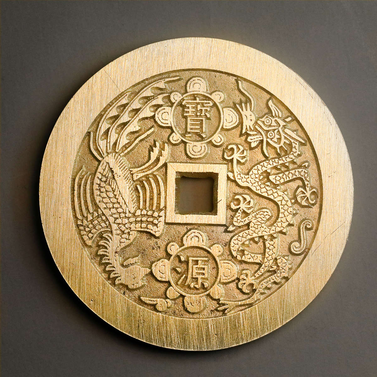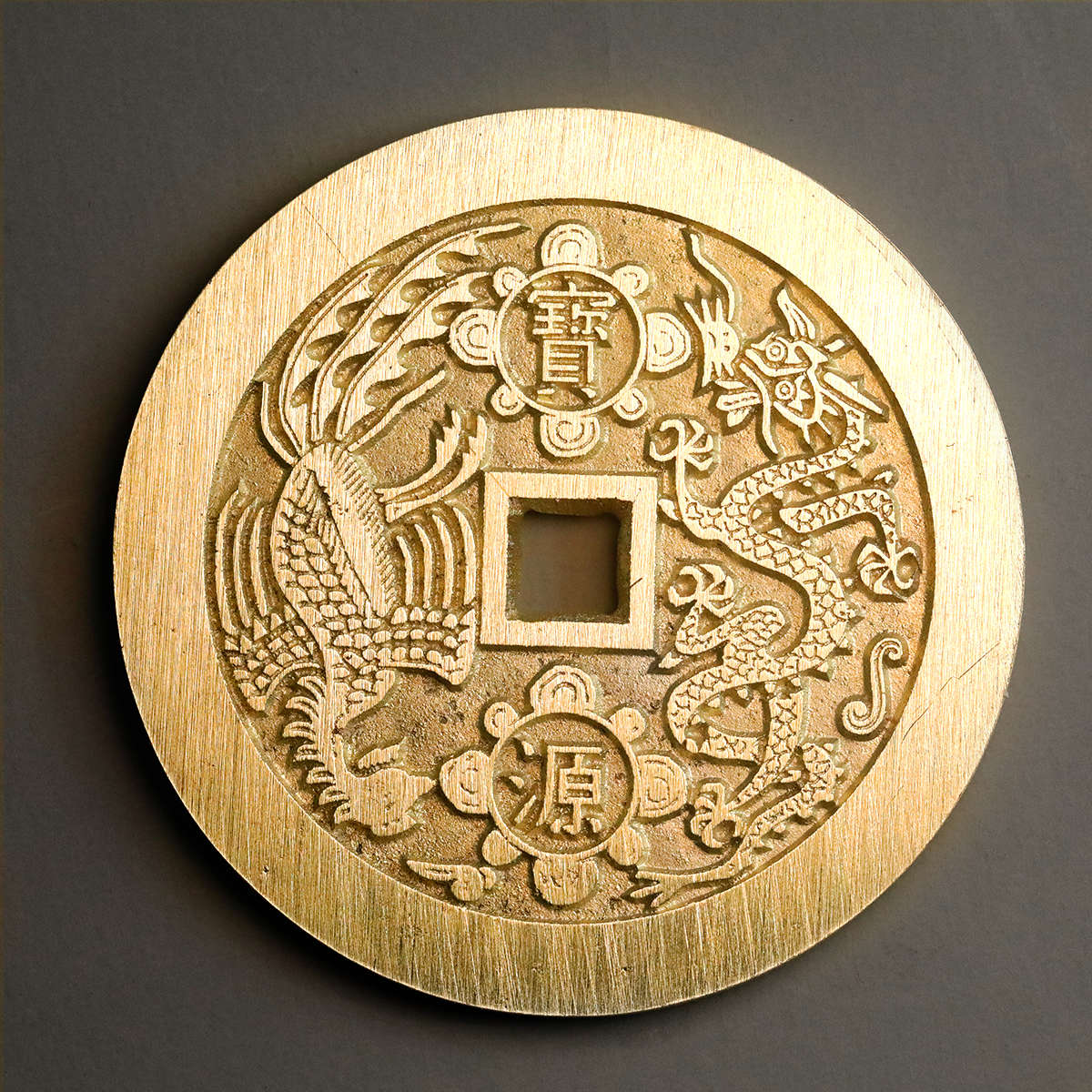 古代真品钱币复刻;古法铸造,独家黄铜材质打造,币身的直径也达到了6cm以上,拿在手里非常有分量感,双面刻有文字浮雕,器型饱满!