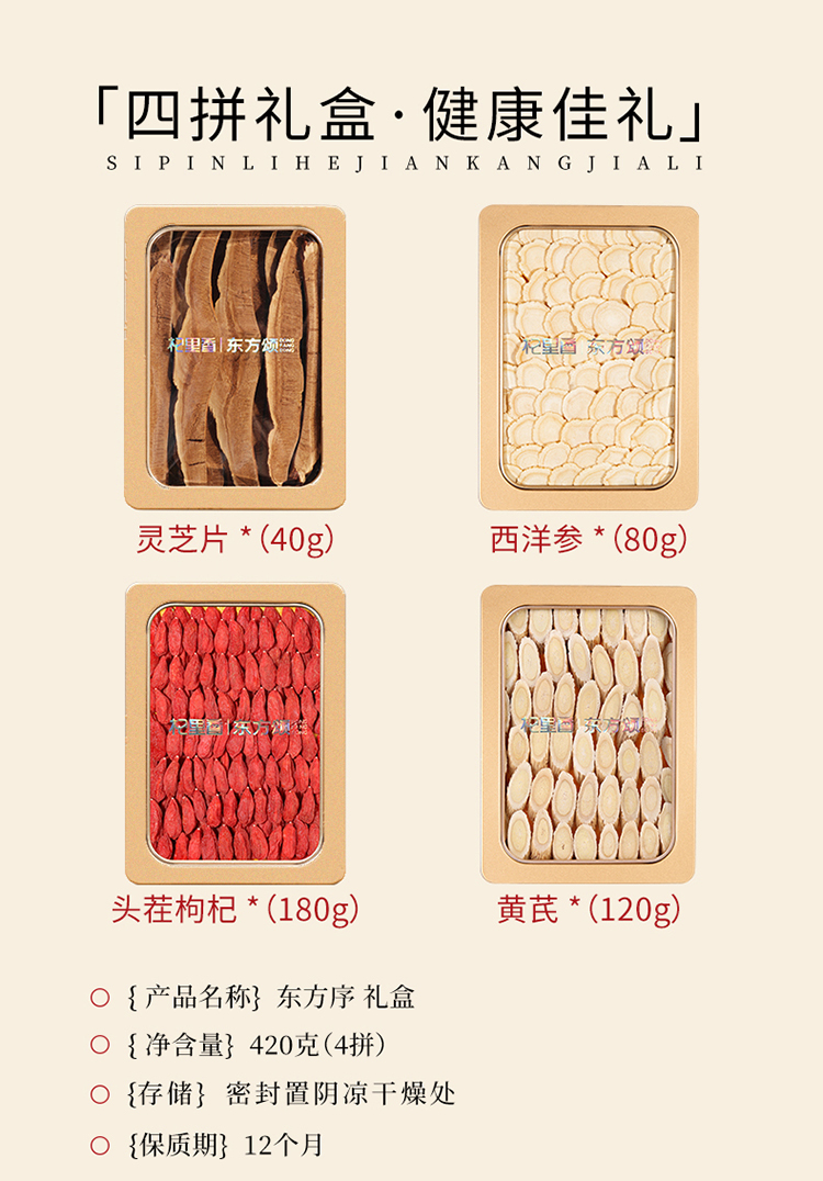 杞里香420g东方序四拼礼盒内含:【10-12mm西洋参片(80g)、宁A150-170红枸杞(180g)、1.0-1.2黄芪大片(120g)、灵芝片(40g)】年货中秋