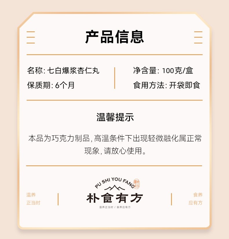 【温馨提示】:本产品中含有牛乳、麸质、大豆成分,为巧克力制品,高温条件下出现轻微融化属正常现象,请放心食用。
