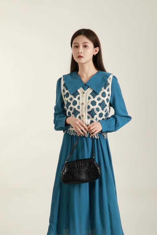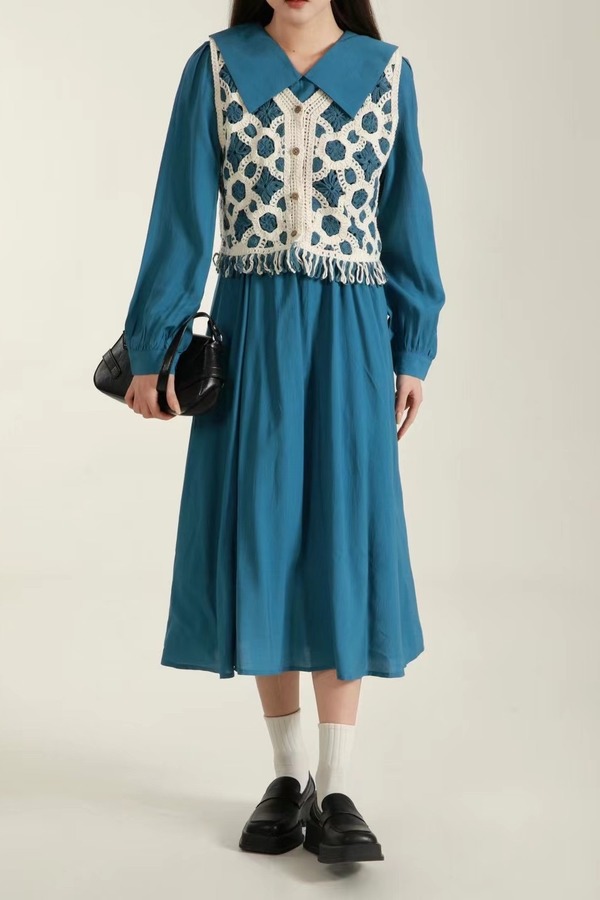 Stay2Weeks 孔雀蓝翻领文艺两件套连衣裙 18756