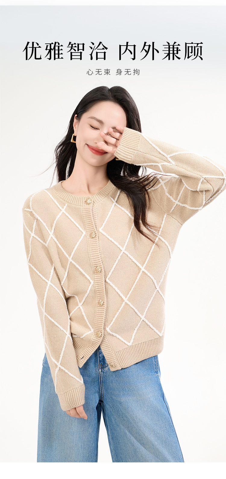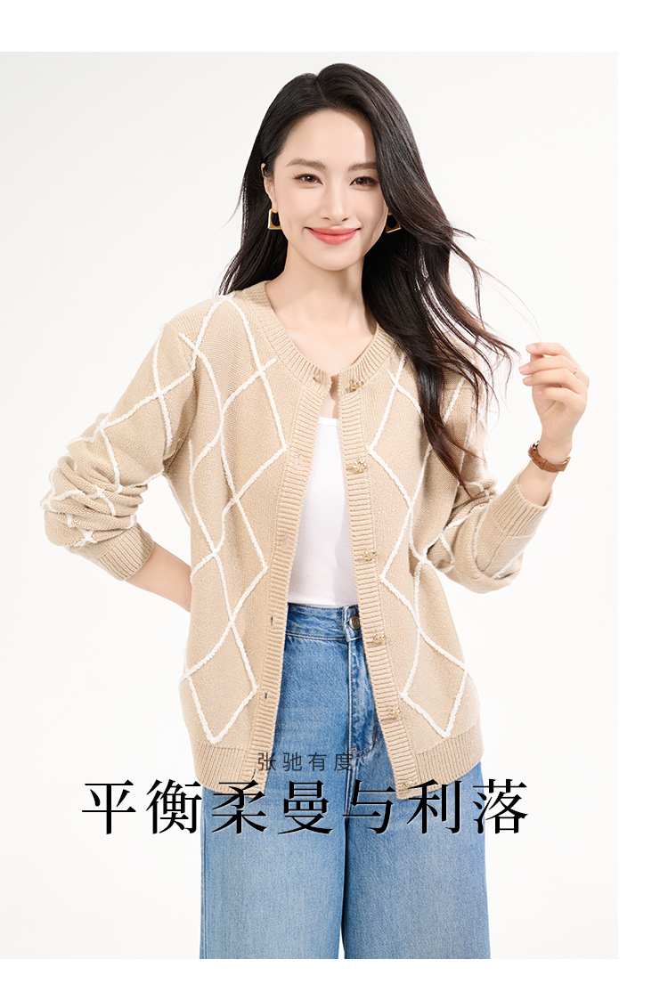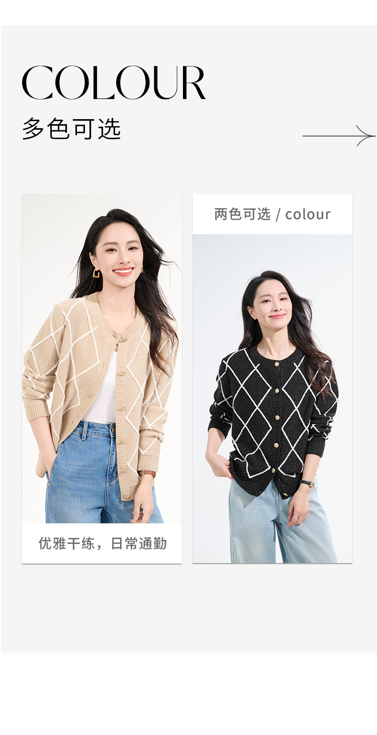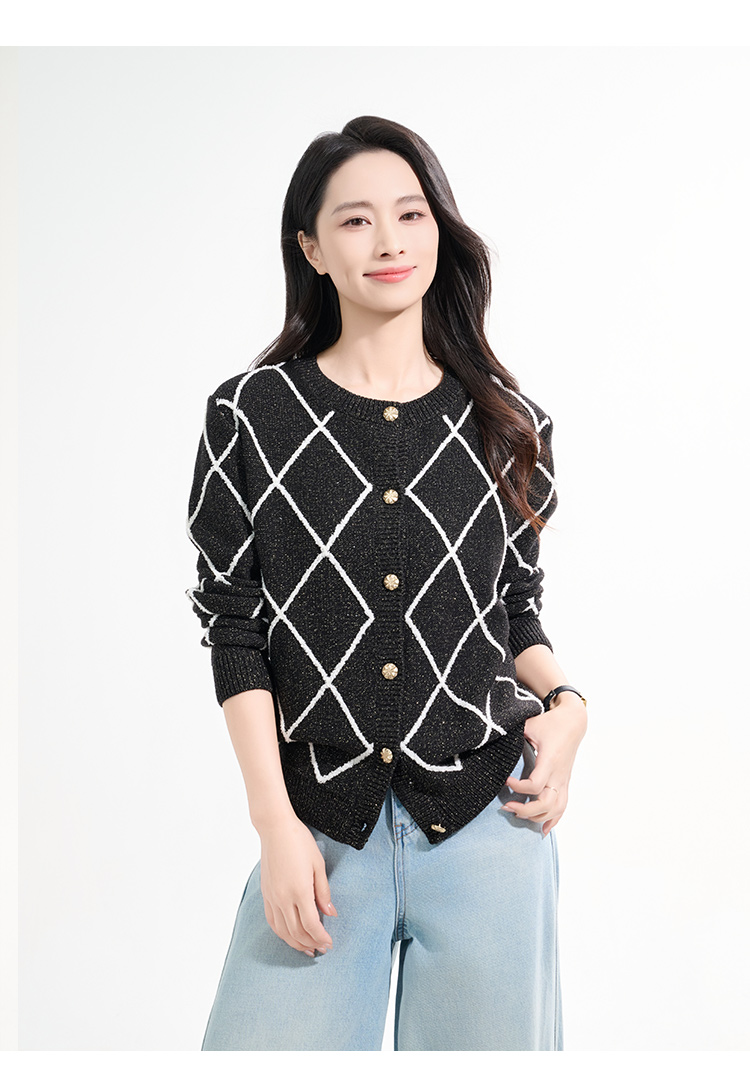 罗蒙女士秋冬针织衫复古开衫菱形印花设计感小众气质毛衣外套上衣女