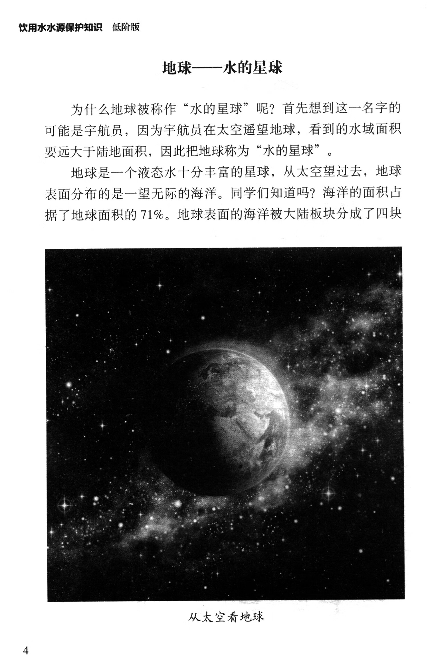 《饮用水水源保护知识:低阶版》内容分为四课,分别为生命之水、饮用水与生活、走进水源、保护水源。