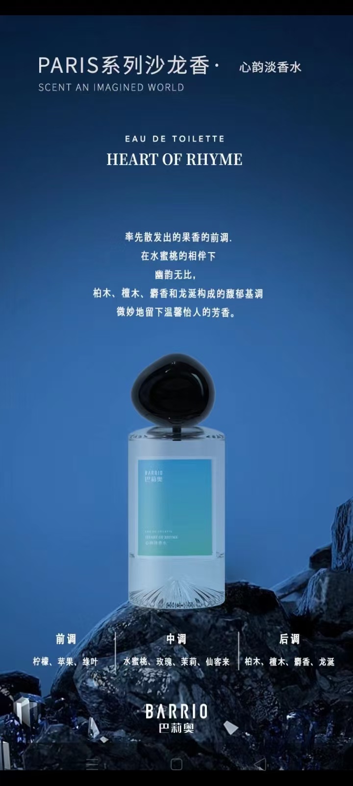 1、心韵淡香水,馥奇木质香调,知性温婉不张扬,毫无攻击性,越闻越喜欢!如同它湛蓝的包装一样,开篇是明媚清新的香柠檬和大吉岭茶融合出的绿意果茶香,皓月当空,点缀着茉莉香气的海洋气息是中调,而略带暖意却不减清爽感的檀香及白麝香恰到好处的融入其中,引人入胜,令人为之动容!