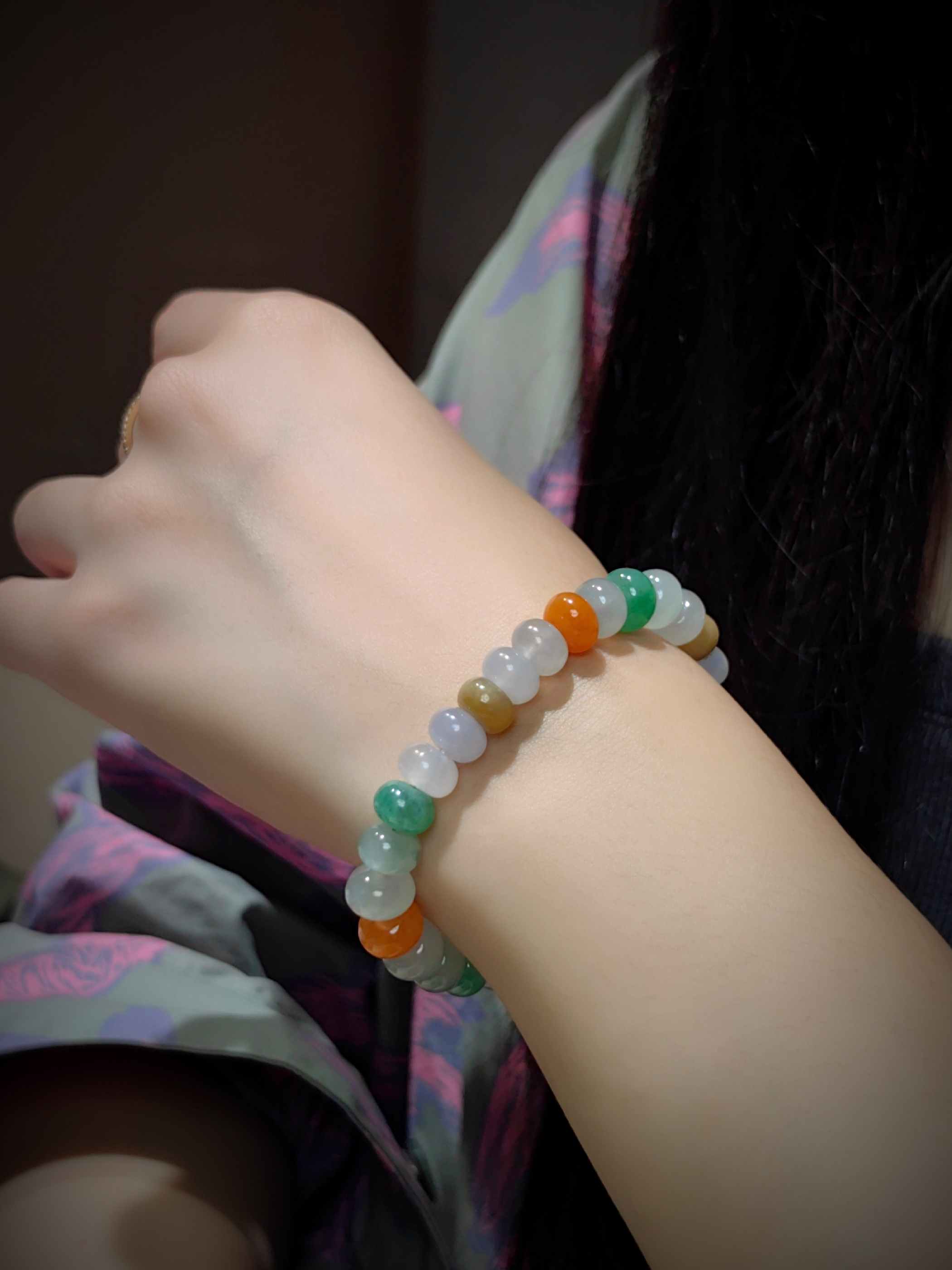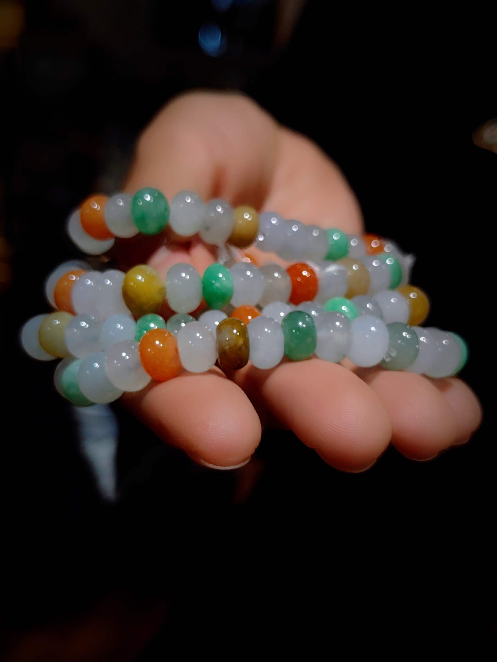 算盘珠,顾名思义,珠子时扁圆型的,颗颗都是饱满可爱的小胖墩,要知道,切成如此形状,是十分浪费材料的。又要按颜色、尺寸、种水搭配也是十分要精挑细选好久,才能配出一条。