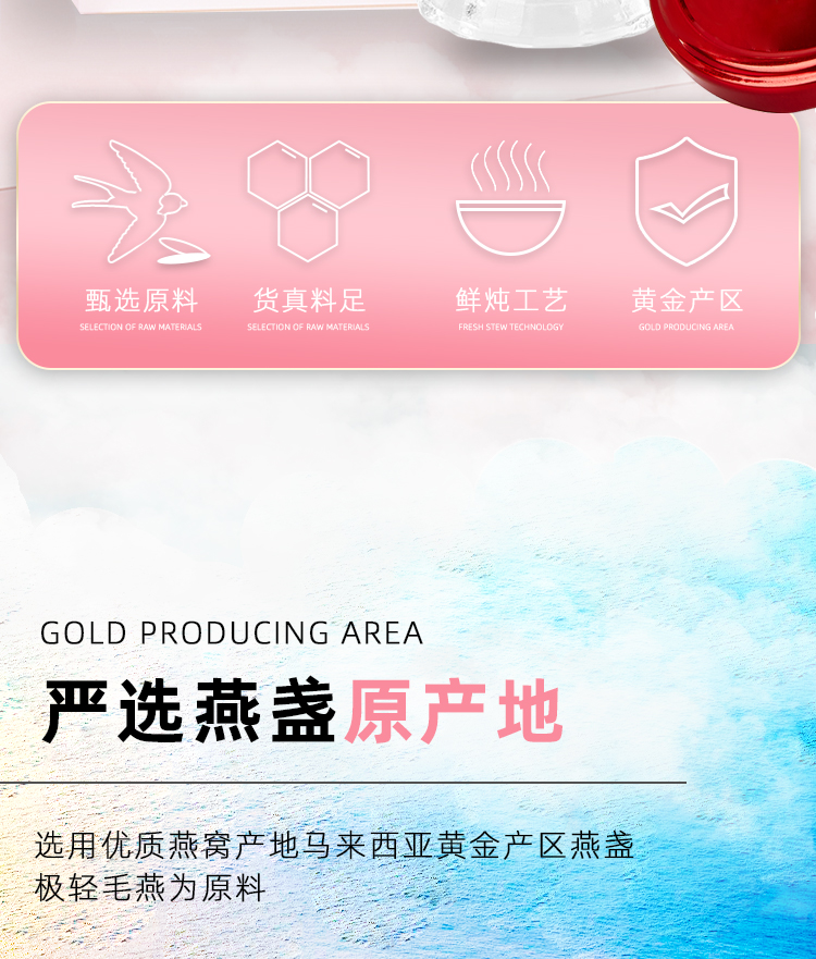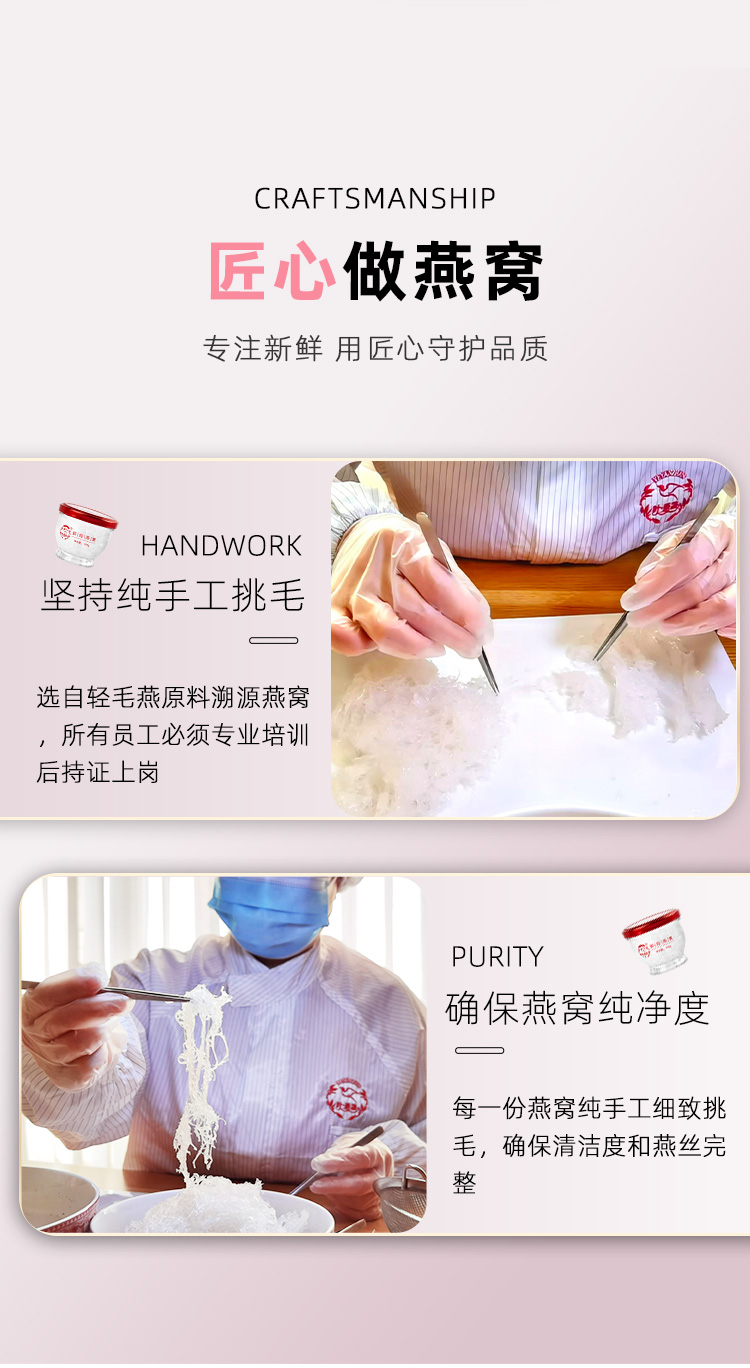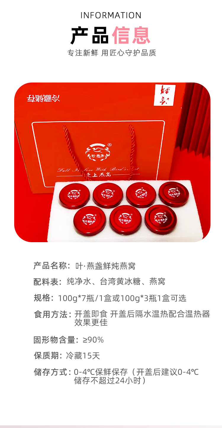 - 叶燕盏燕窝,是国家检科院授牌的第12家企业,全线溯源,把控品质,为消费者提供优质,纯正,安全燕窝。