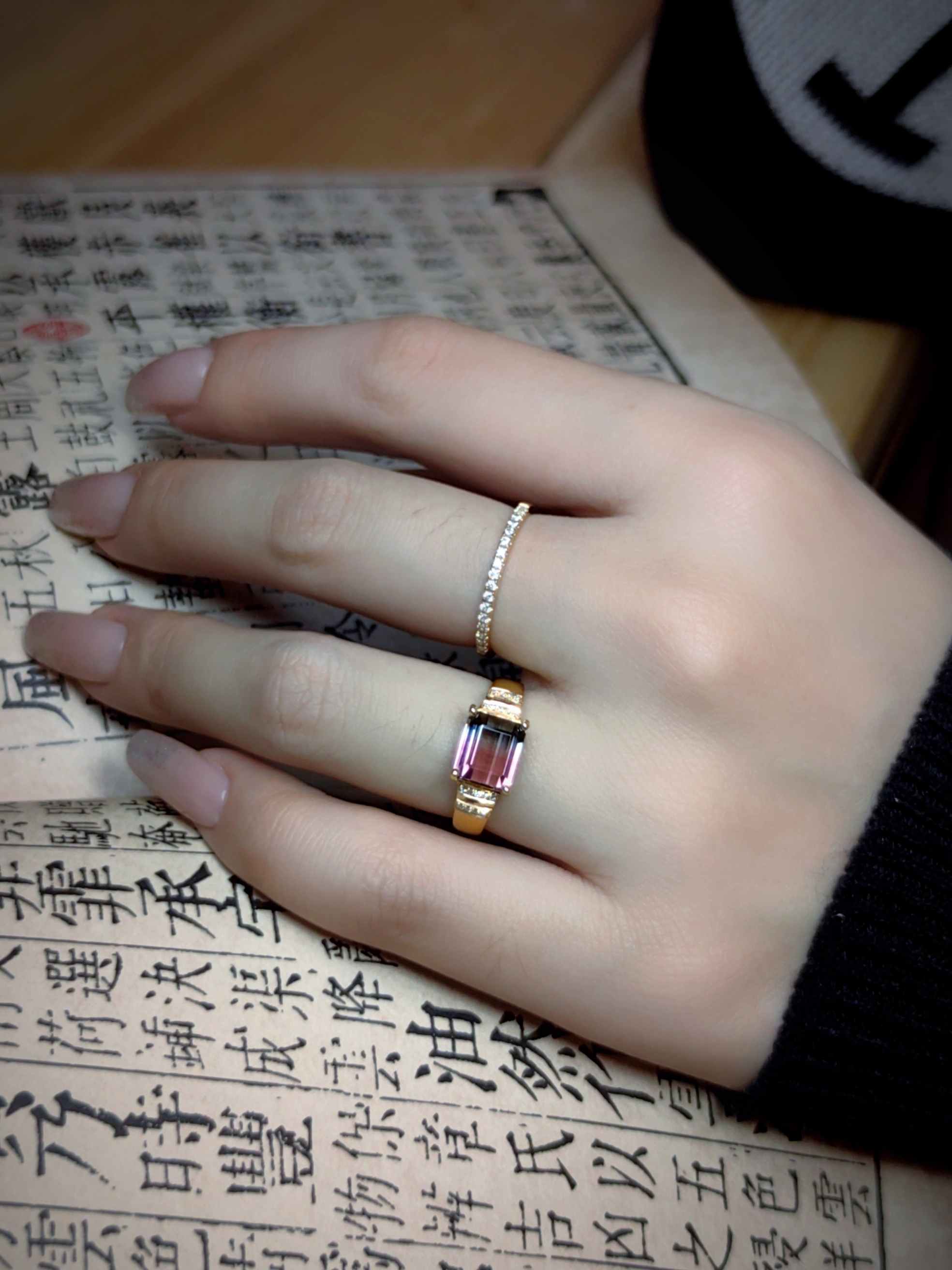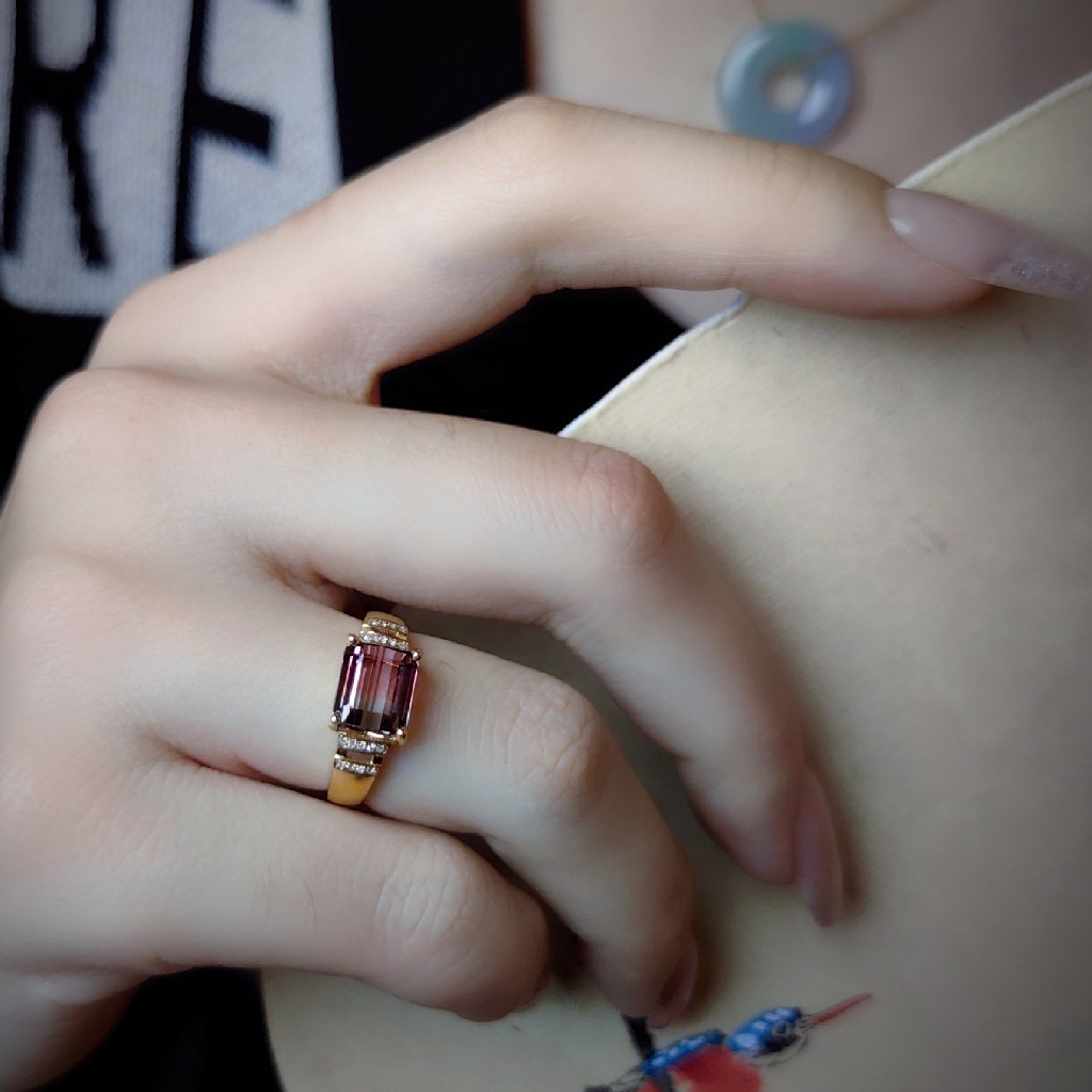 这件长方形的西瓜碧玺戒指,重3.2ct,镶嵌用简单的爪镶托起。整体给人个性大方的感觉。
