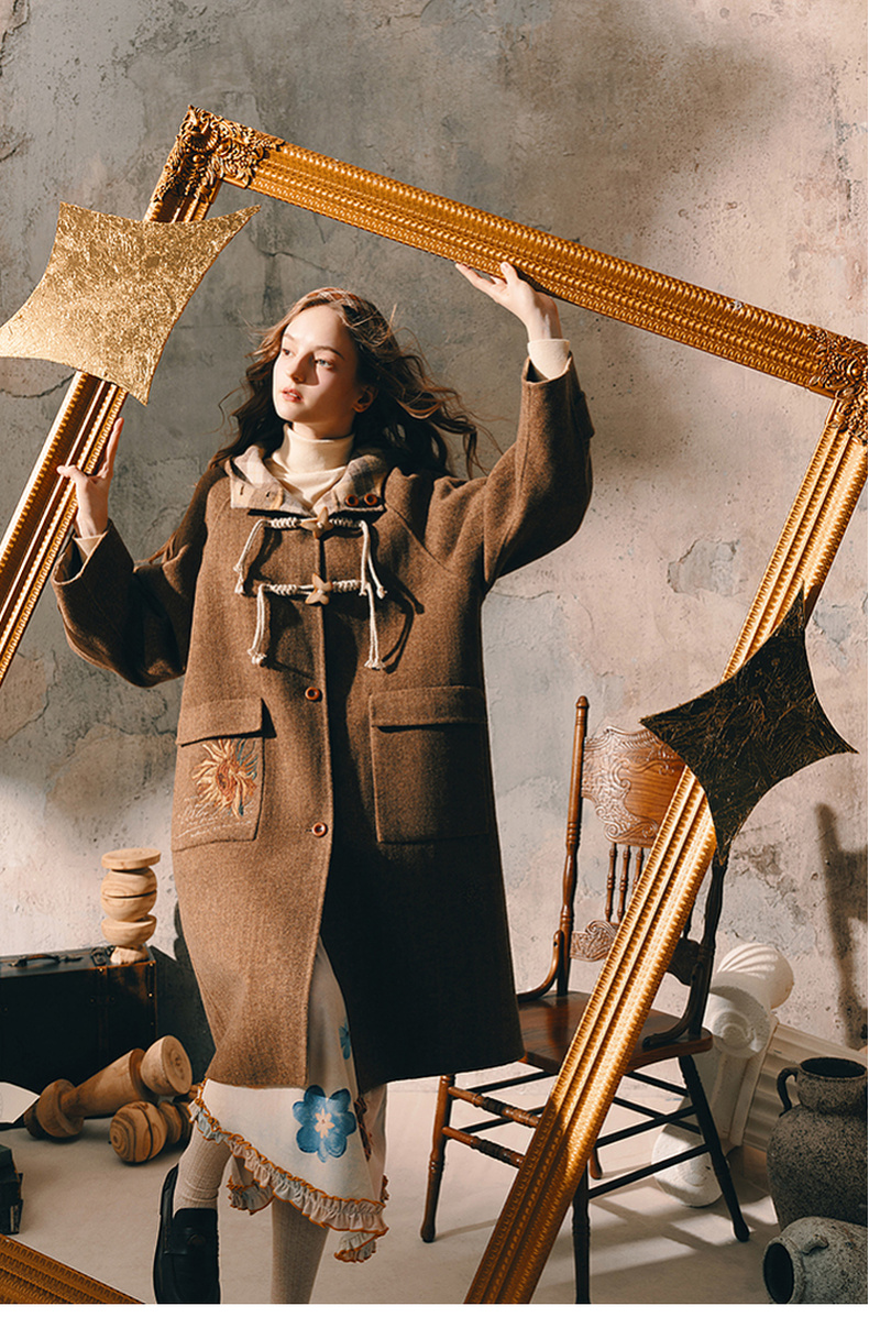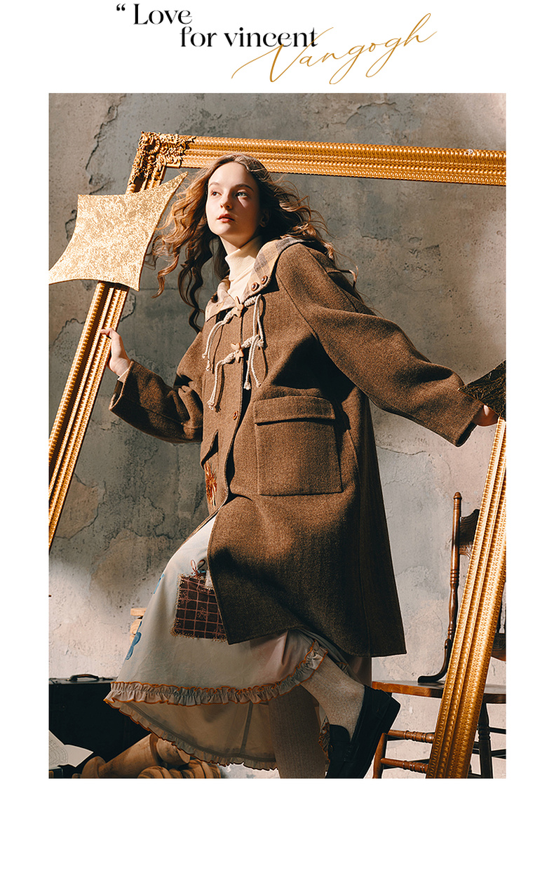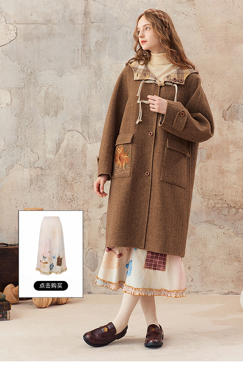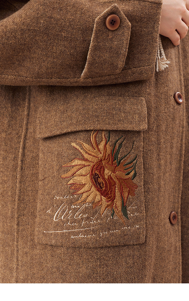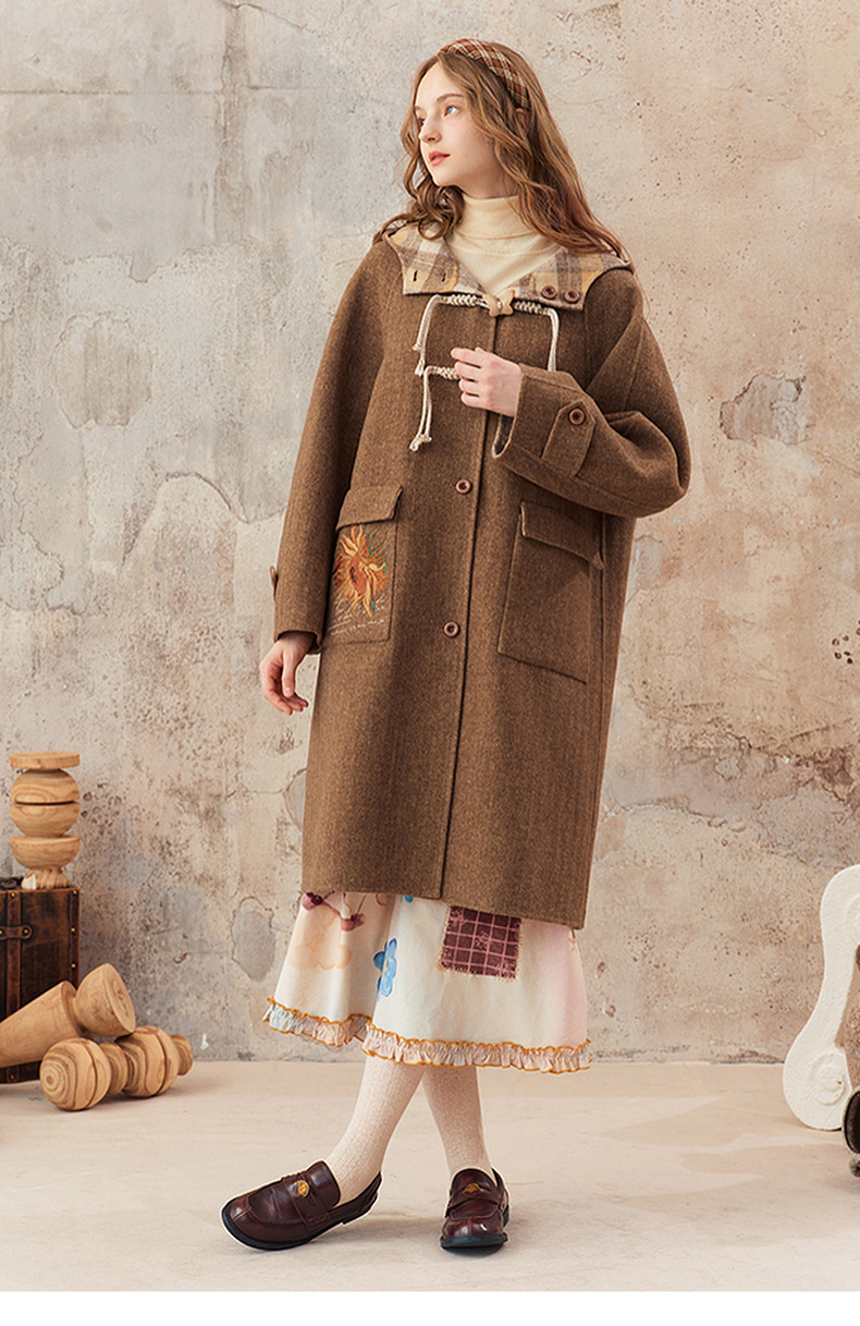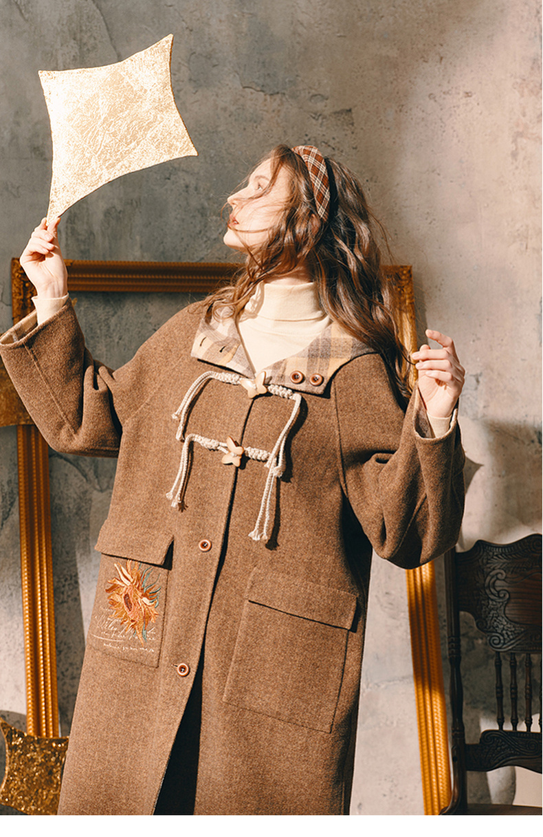 【暖冬内购】两三事梵高文艺 课间漫游 2025秋冬新款绣花两面穿连帽毛呢外套女