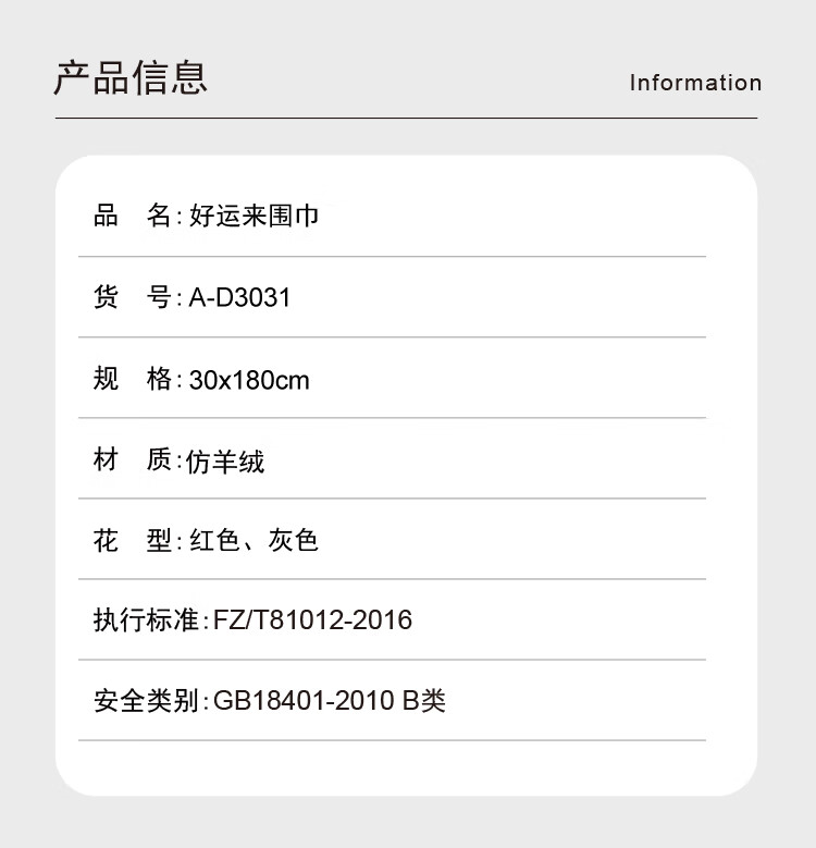 艾丝雅兰 新年红围巾两色可选好运来围巾 A-D3031 红色/灰色