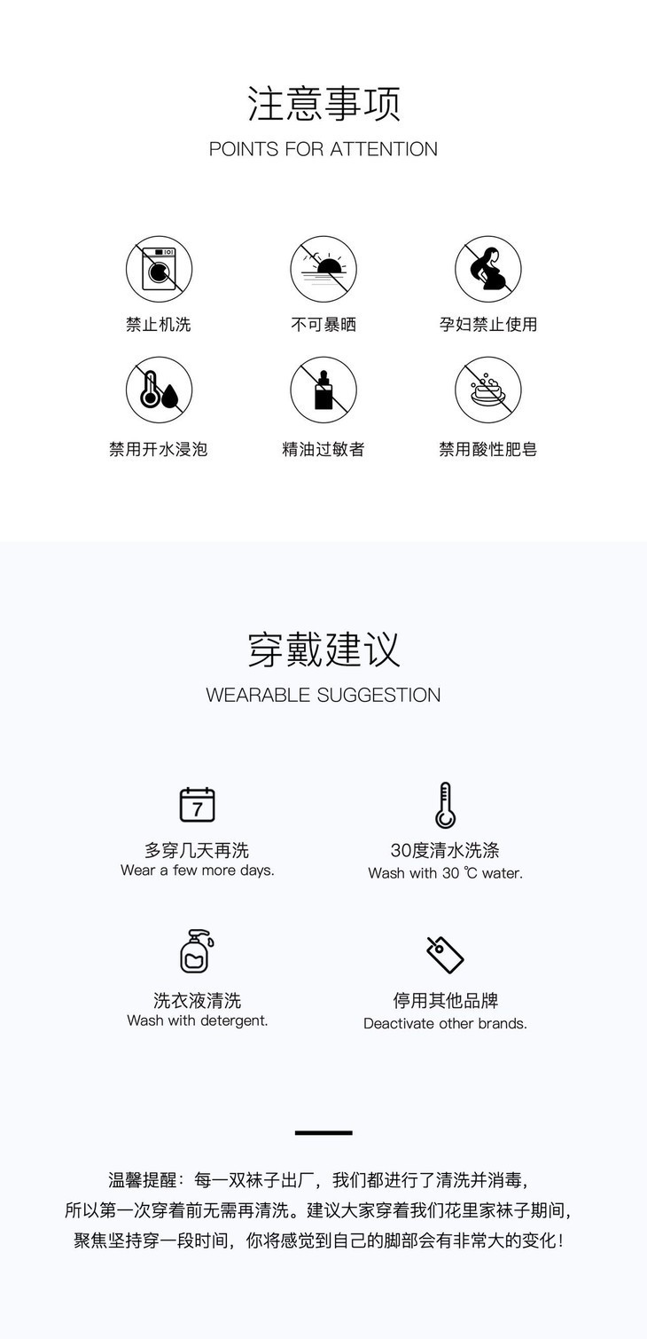 3、建议轻柔水洗,不宜大力搓揉,更不建议用洗衣机洗涤,以免加速破坏精油袜内的精油效果;