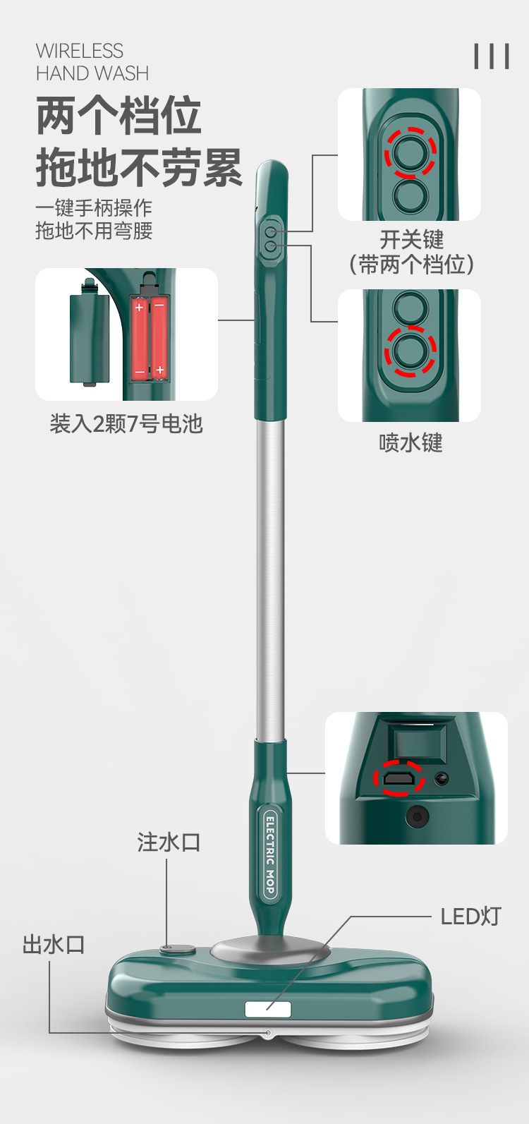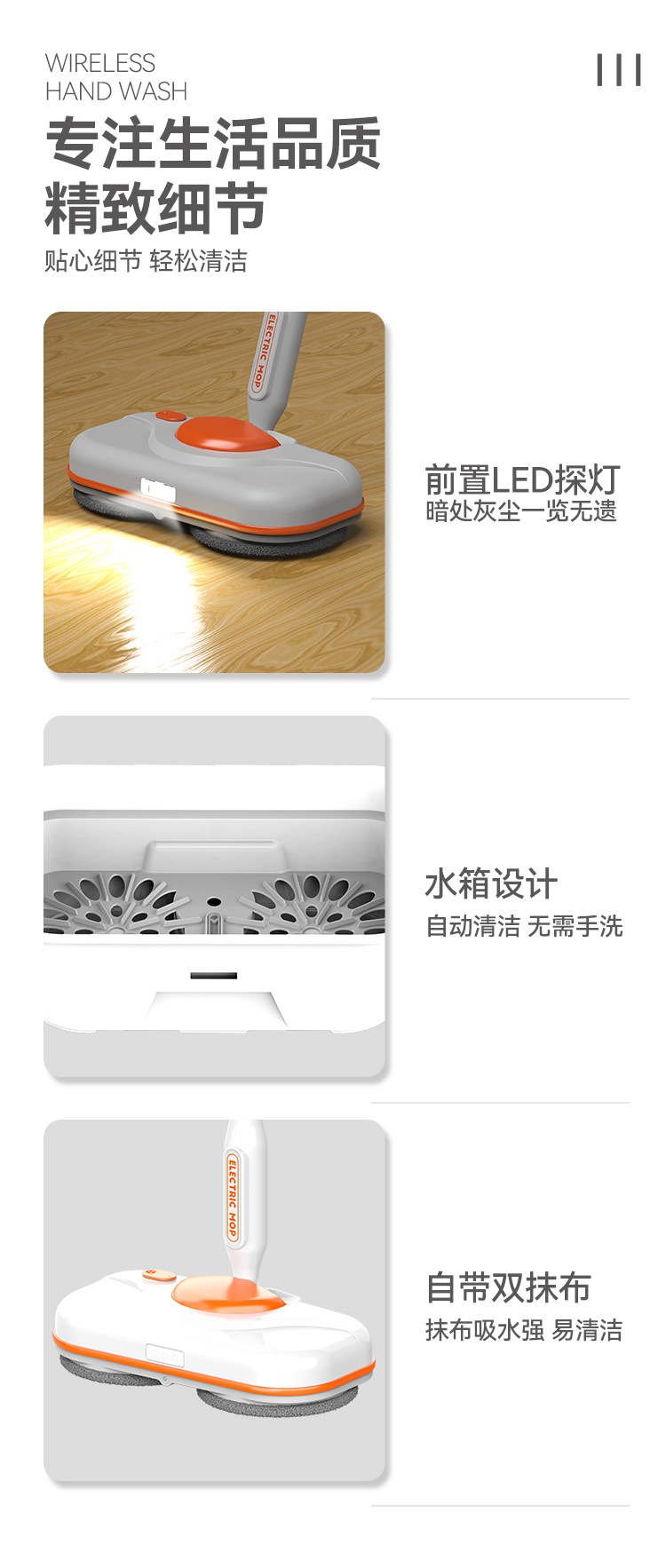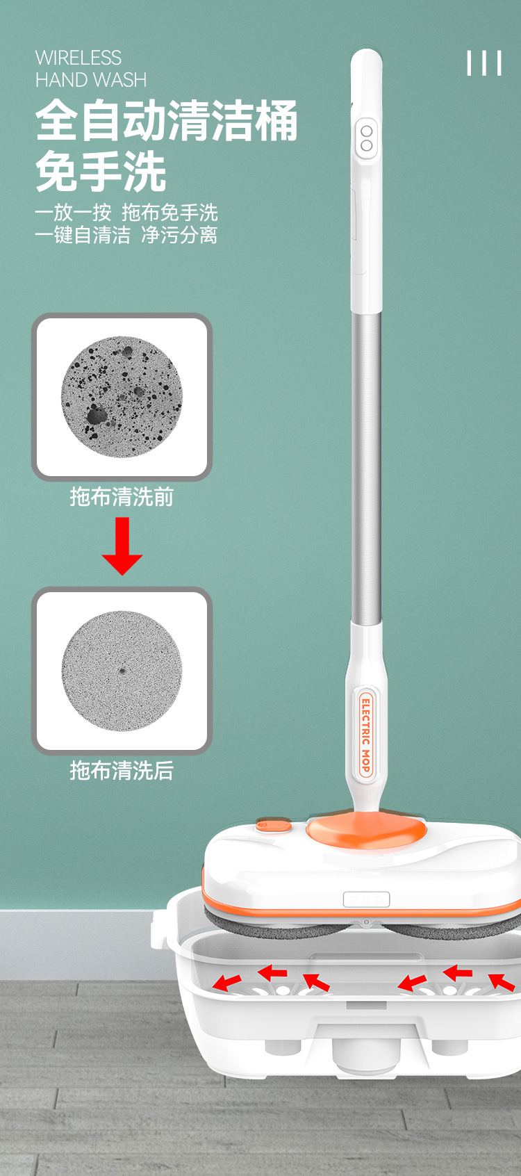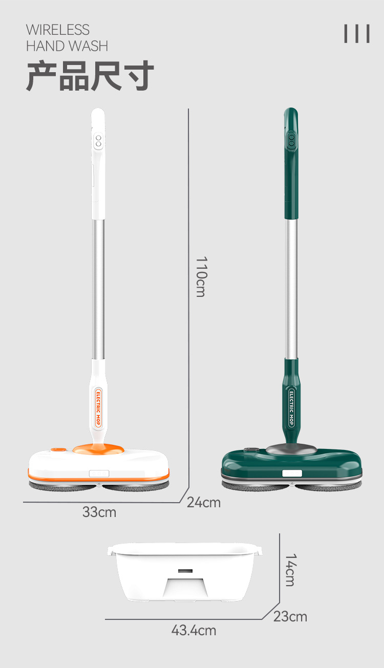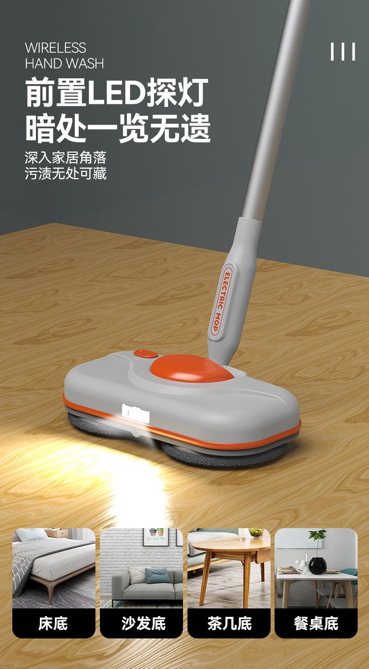 【智能电动无线便捷手持拖把】智能电动拖把,免手洗,干湿两用。水箱750ml,方便大水箱带来便利,自动调节90°。招式轻灵,生活便利。前后倾斜,懒人专属利器!