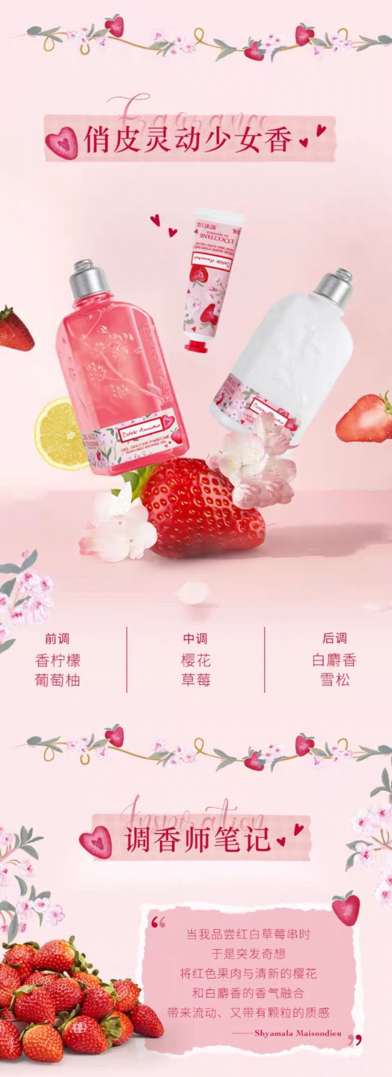 商品名:欧舒丹莓莓恋樱香氛套装 今日换个口味,让肌肤尝一口🌸🍓 一整套使用完如同置身于草莓花海当中,甜甜香香高颜值 前调:香柠檬、葡萄柚 ------------------------------------- |