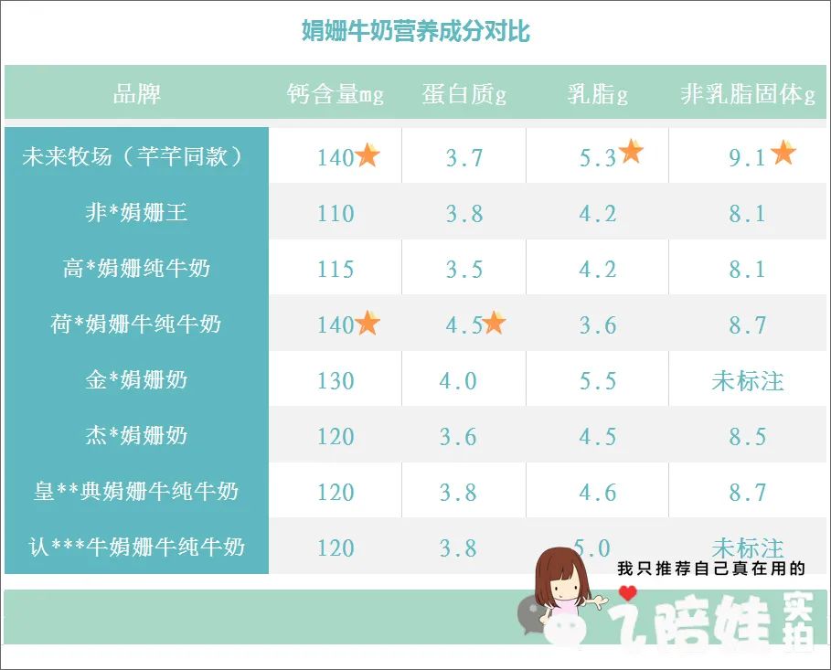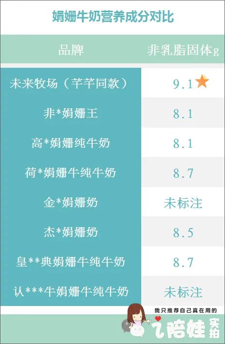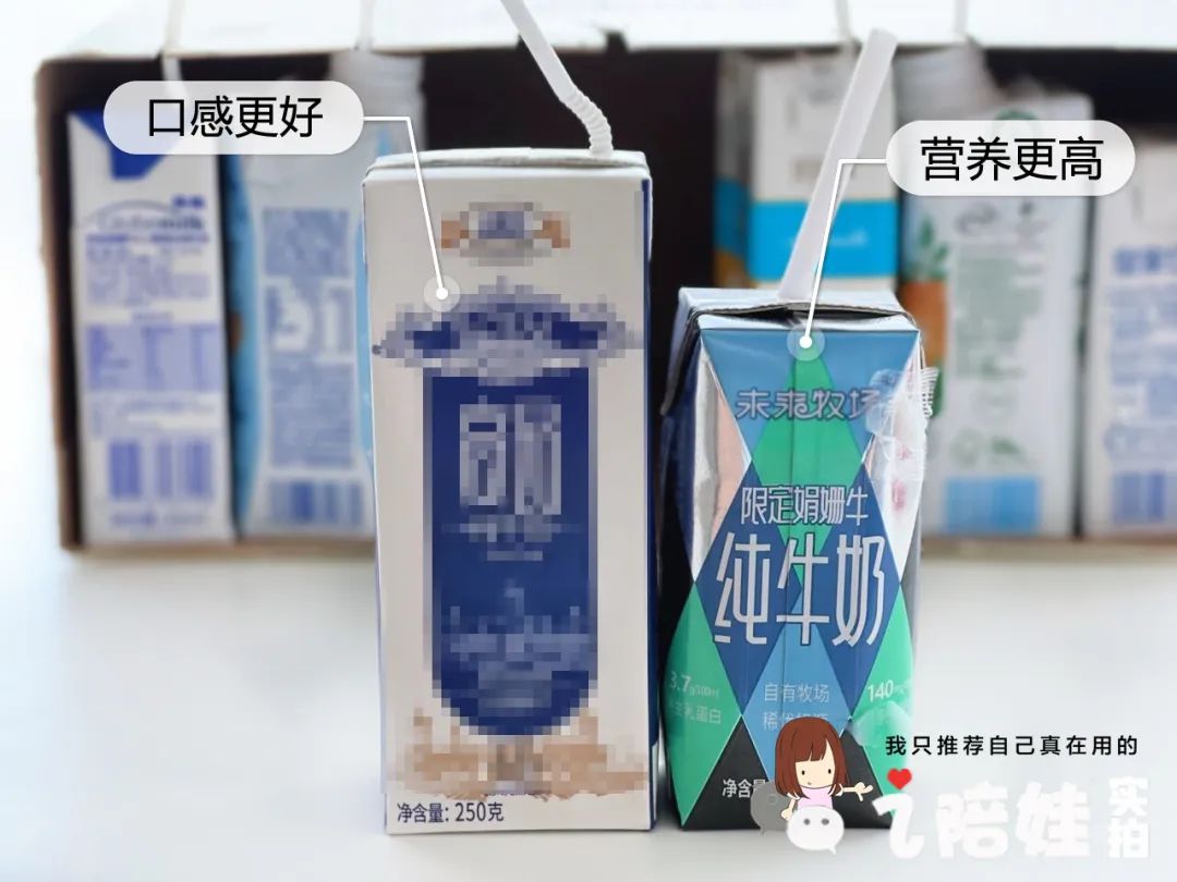 我还做过一个盲测,看不出品牌的情况下,让几个闺蜜尝哪个口感更好。她们能看见的只有吸管,然后我来记录她们每个人的评判。因为盲喝的都是娟姗奶,总体味道比普通奶要好,属于“将军里面拔矬子”。但是一口下去,风味差别还是挺大。有的是清甜派,有的甜到像加了糖。有的奶香浓郁,相比之下其他的显得寡淡许多。集中意见后,口感排第一的,她们没有分歧地投给了高*纯牛奶(蓝白盒),其次是芊芊喝的未来牧场。营养成分上,高*纯牛奶(蓝白盒)比芊芊喝的略低一点,但结合容量来算(高*250ml/盒,芊芊喝的未来牧场200ml/盒,跟一些儿童奶容量相当),两款的营养差距不大。所以我觉得这两个都不错,只是说芊芊这种胃容量小的孩子,可以考虑喝容量小营养多一点的。除了以上这些,我还发现芊芊喝这款的非乳脂固体更高一些。我对比的这几款中有的包装上未标注,有标注的都是8点几,只有这款是标注≥9.1%。非乳脂固体,就是牛奶中除了脂肪和水分以外的物质总称,主要组成是蛋白质,乳糖、矿物质、维生素等,8.1%是及格线,超过8.3%就表现不错,而芊芊这款超过9%,在牛奶中不多见。在许多人的认知里,是根据牛的饲养地域、饲养方式的不同来区分牛奶的好坏。其实更重要的是奶牛的品种,因此并不是进口奶就一定优于国产奶。我买娟姗奶最早也是被人安利,把我做的功课跟大家分享下:目前咱们喝的大部分的牛奶是荷斯坦奶牛,就是黑白花牛产的奶,而娟姗奶牛是源自英吉利海峡南端的泽西岛(我打赌你们微信好友除了住冰岛,肯定有住泽西岛的