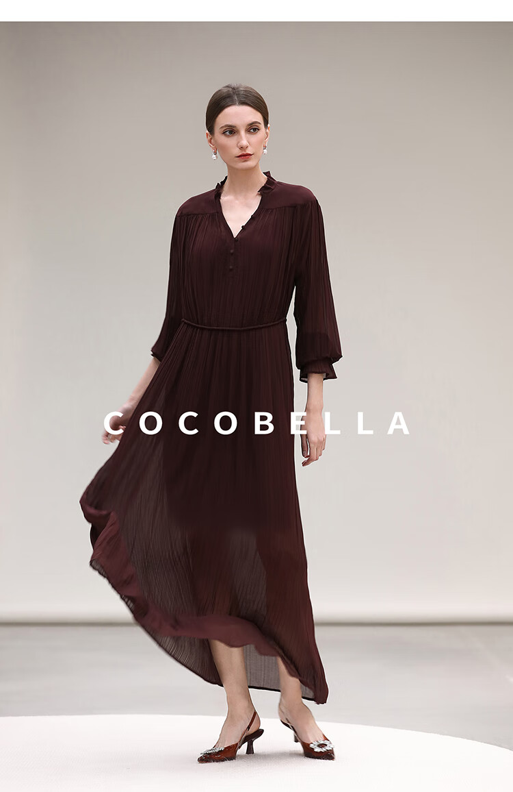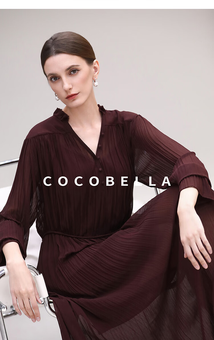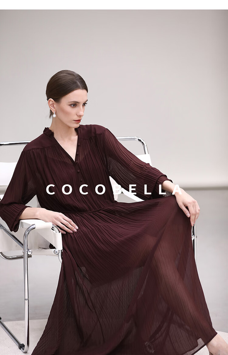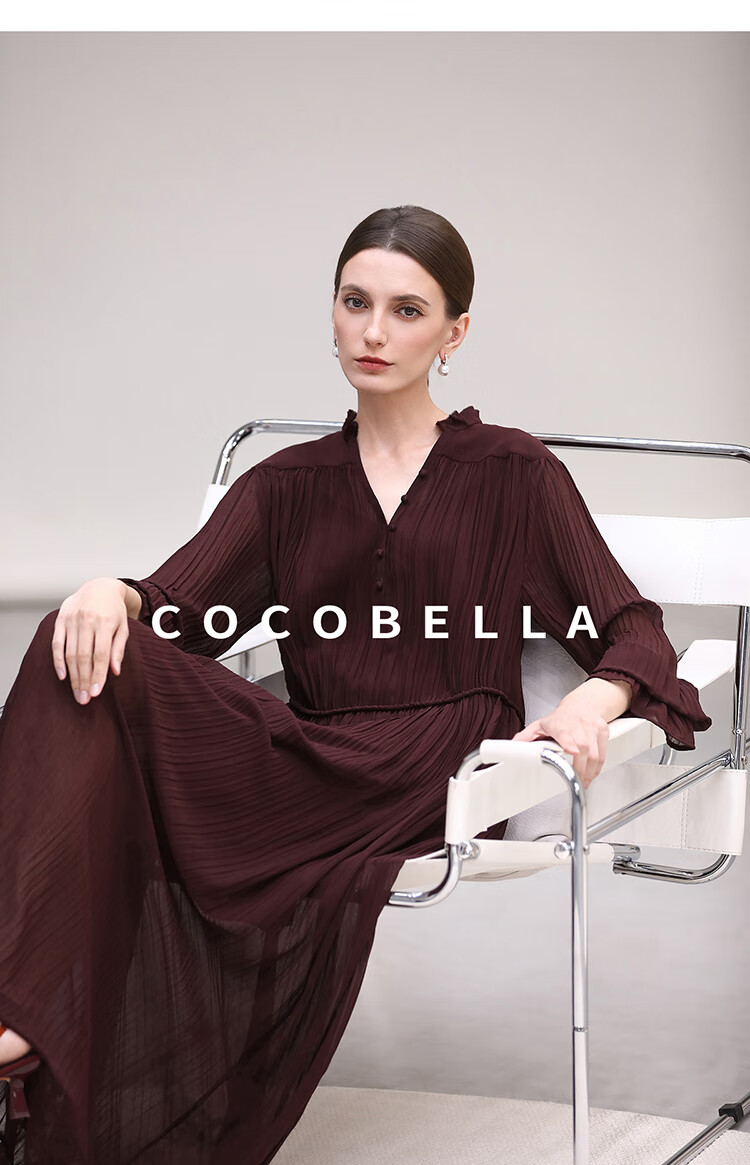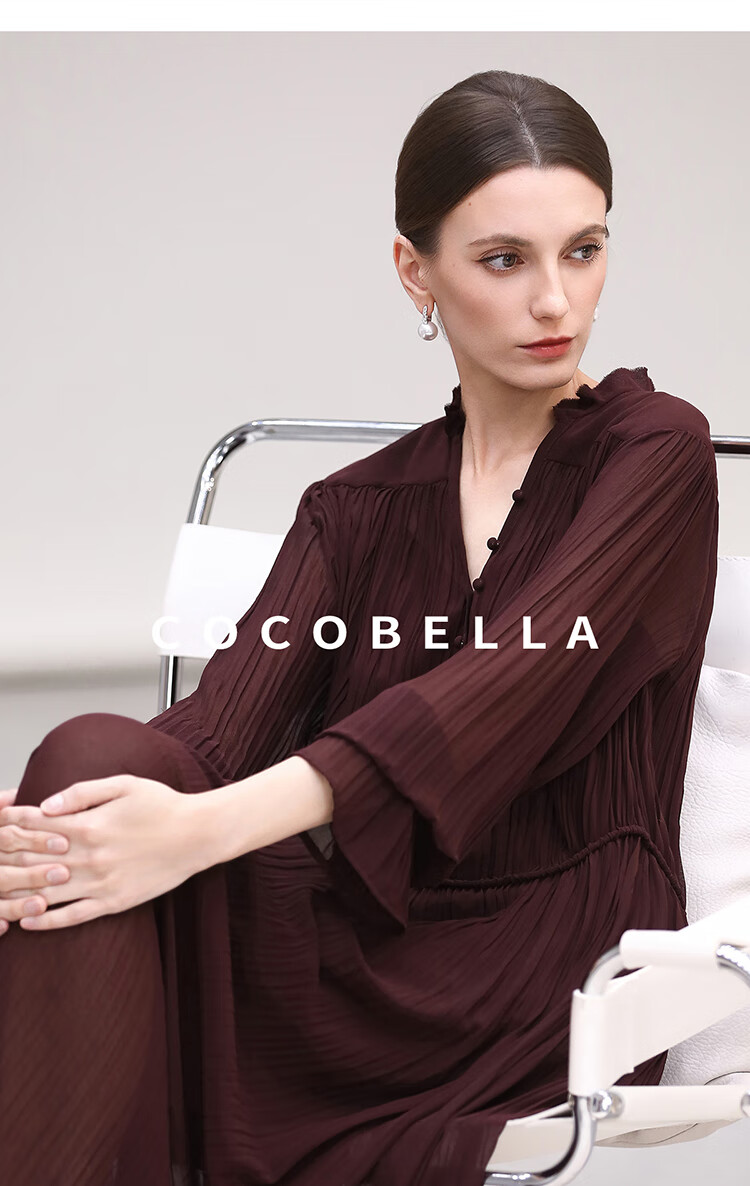 COCOBELLA气质酒红木耳领压褶连衣裙25春夏V领衬衫长裙FR7015