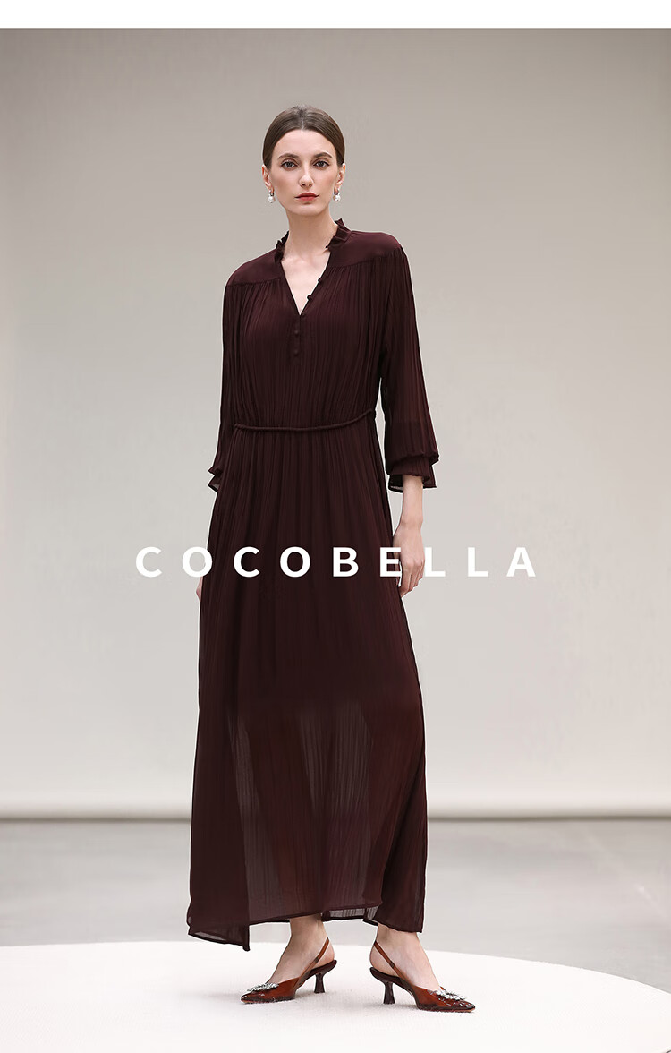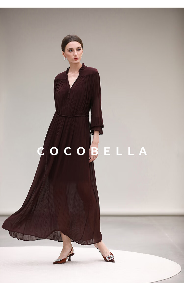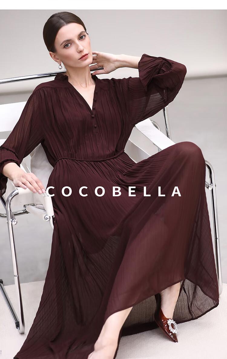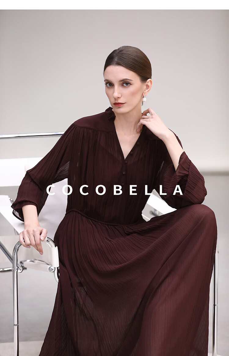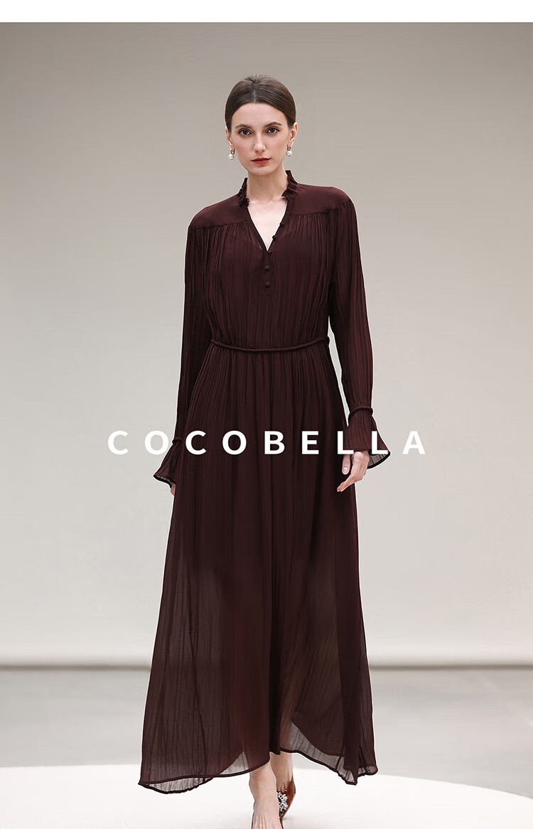 COCOBELLA气质酒红木耳领压褶连衣裙25春夏V领衬衫长裙FR7015