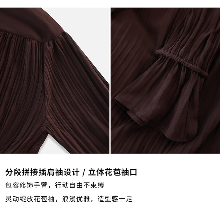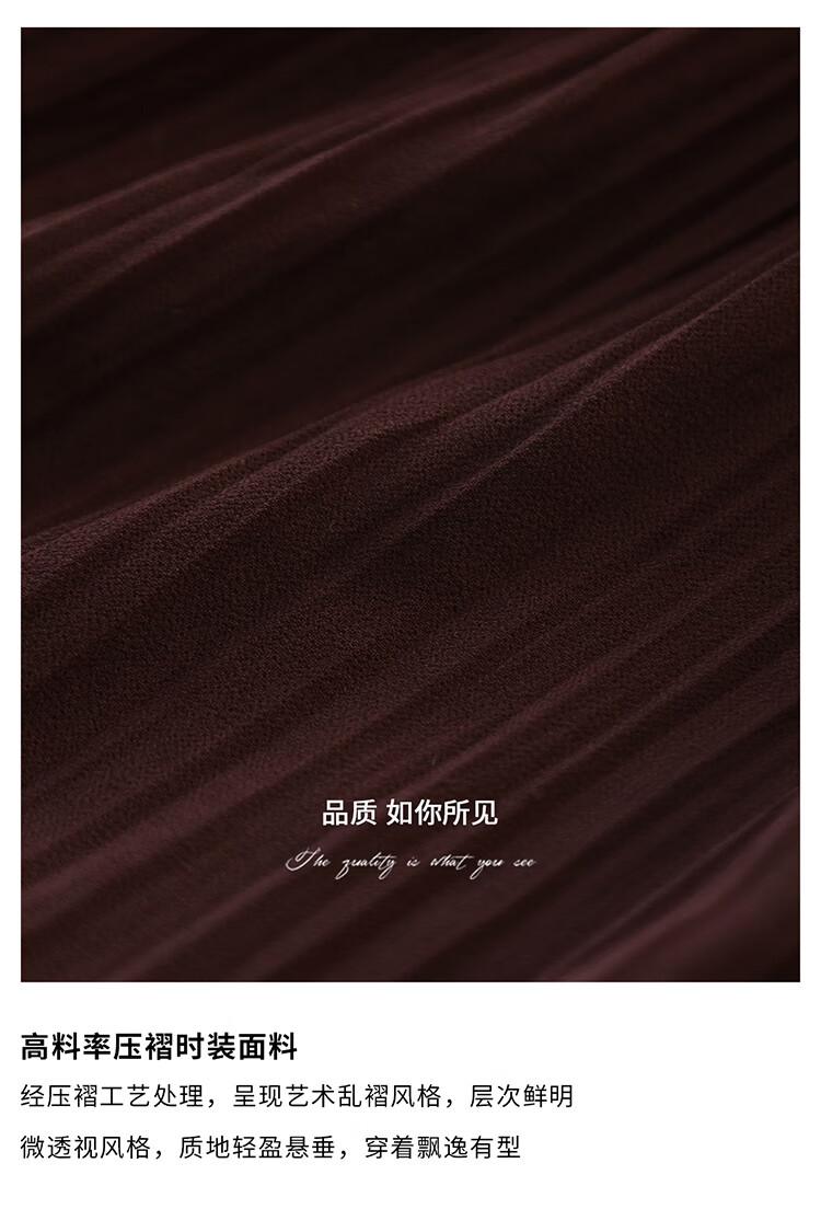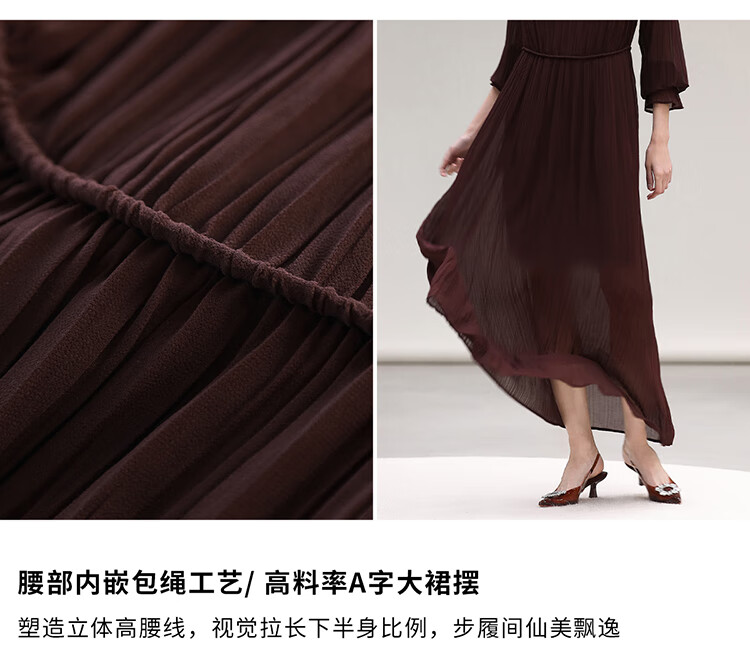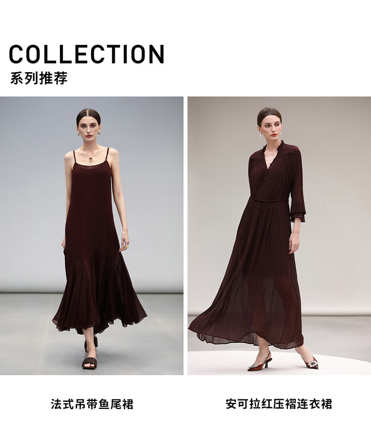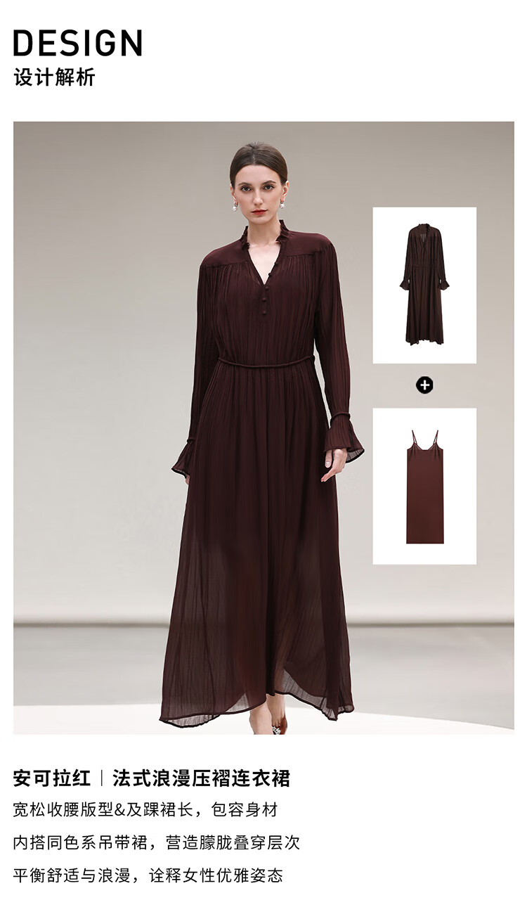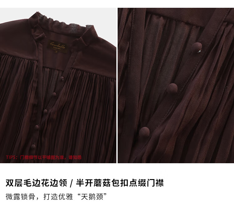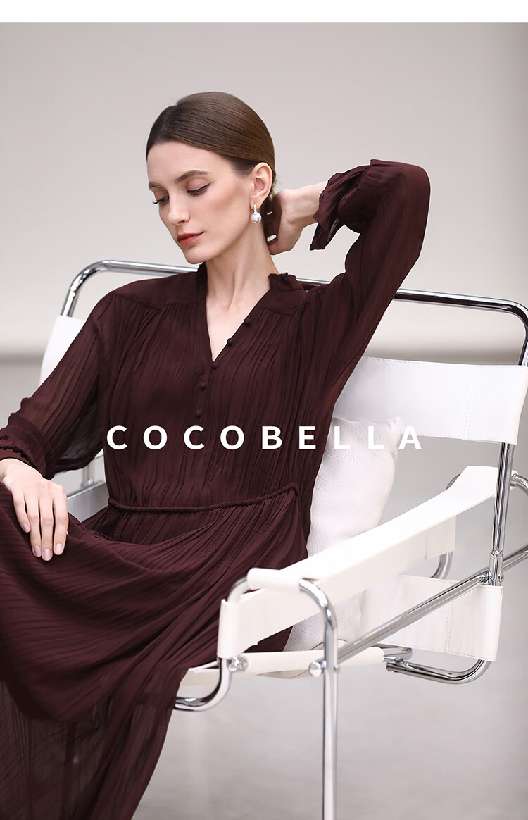 COCOBELLA气质酒红木耳领压褶连衣裙25春夏V领衬衫长裙FR7015