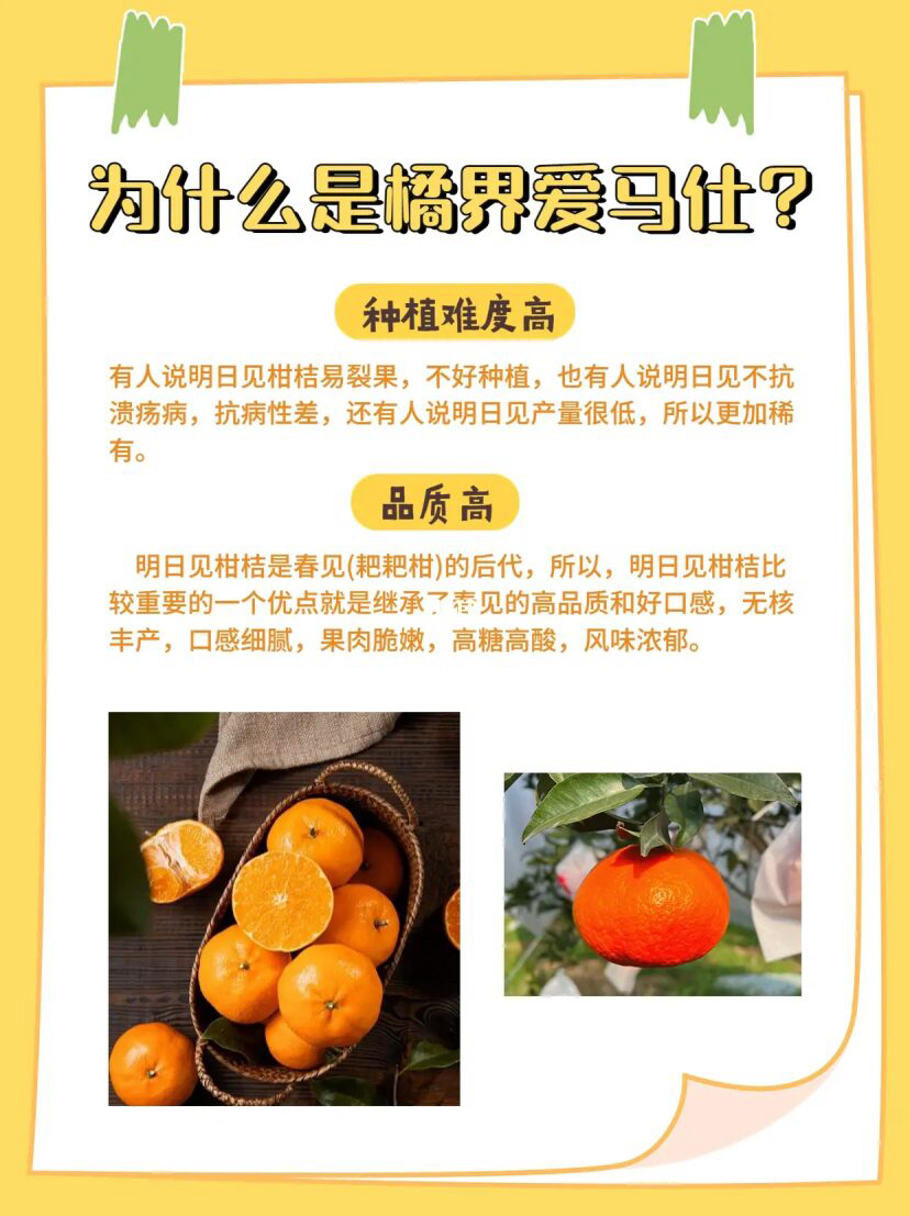 因其为“春见”的后代,期待能成为明日振兴柑橘产业的担当,故取名为“明日见”!