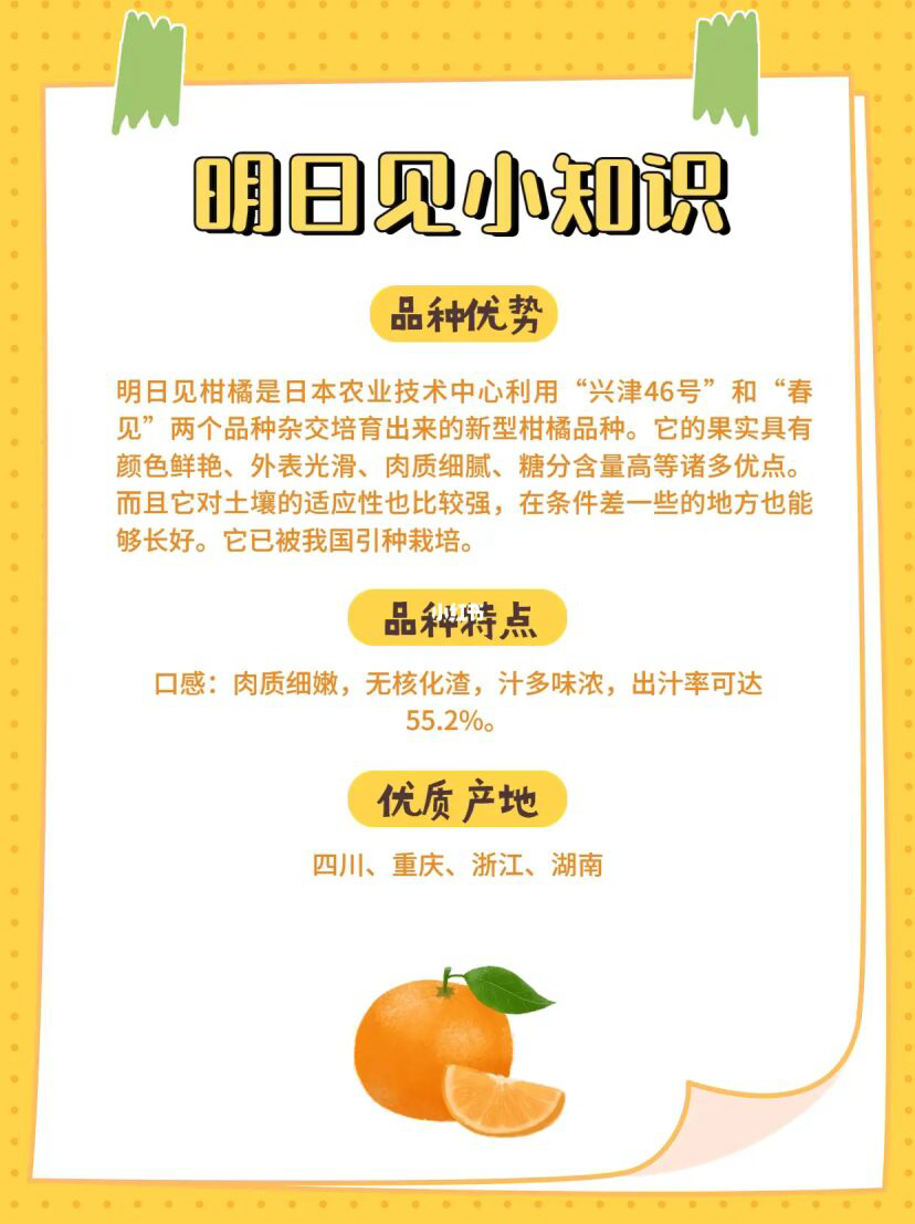 明日见柑橘是日本农业技术中心利用“兴津46号”和“春见”两个品种杂交培育出来的新型柑橘品种。