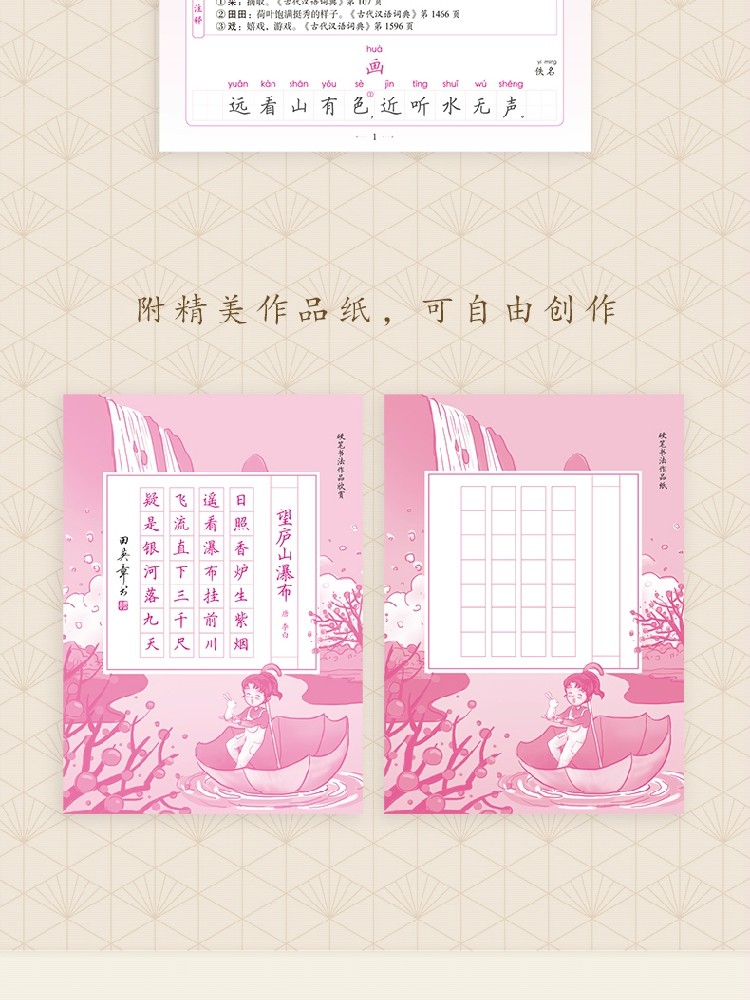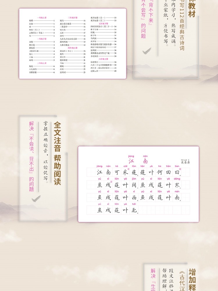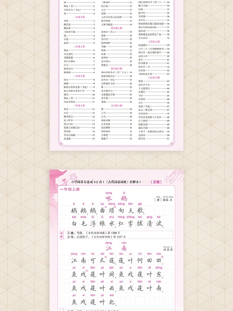 编辑推荐:本字帖同步部编本小学一至六年级语文教材要求背诵或诵读的古诗词篇目,由中国硬笔书法协会首任会长田英章楷体手书,规范美观。字帖蒙纸书写,加注拼音,并特为古诗词中的重点、难点字词加注《古代汉语词典(第2版)》释义,帮助使用者写出一手好字的同时,更好地理解古诗词,学习古代汉语知识。